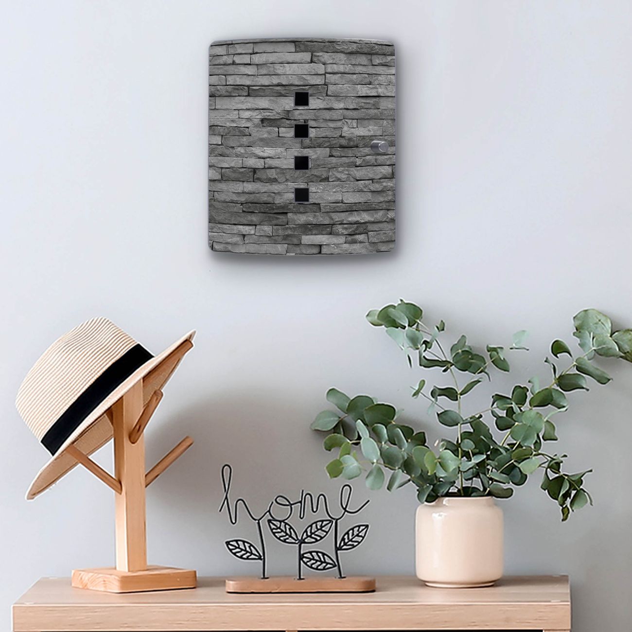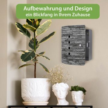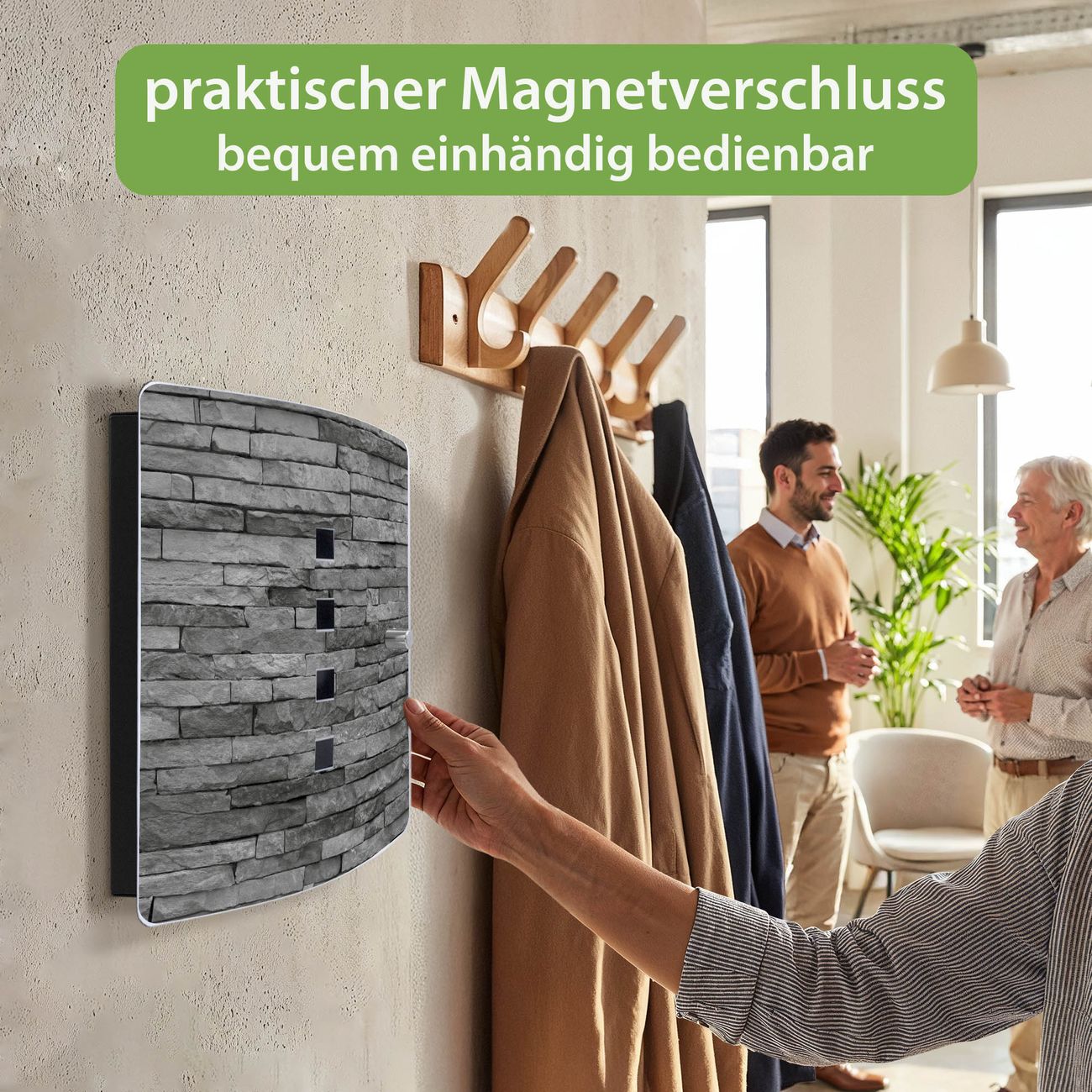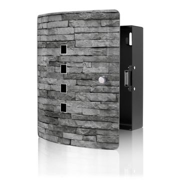 Funktion / Nutzen: Die leicht geschwungene Edelstahltür ist mit einer hochwertigen Motivfolie und dem Motiv Motiv Rustikale Steinwand kaschiert. Ein praktischer Magnetverschluss ermöglicht Ihnen ein schnelles Öffnen und Schließen. Befestigt wird der Schlüsselkasten an 2 Stellen auf der Rückseite, passendes Montagematerial fügen wir bereits bei.