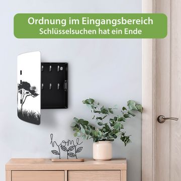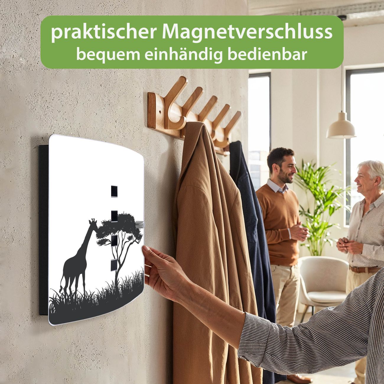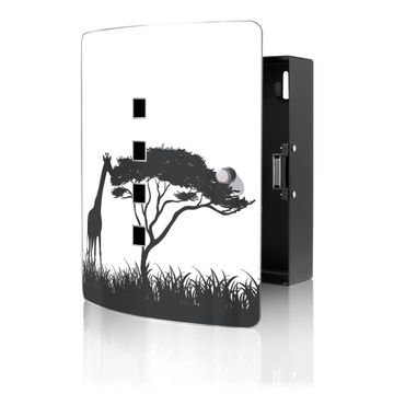 Funktion / Nutzen: Die leicht geschwungene Edelstahltür ist mit einer hochwertigen Motivfolie und dem Motiv Motiv Savannen-Silhouette kaschiert. Ein praktischer Magnetverschluss ermöglicht Ihnen ein schnelles Öffnen und Schließen. Befestigt wird der Schlüsselkasten an 2 Stellen auf der Rückseite, passendes Montagematerial fügen wir bereits bei.