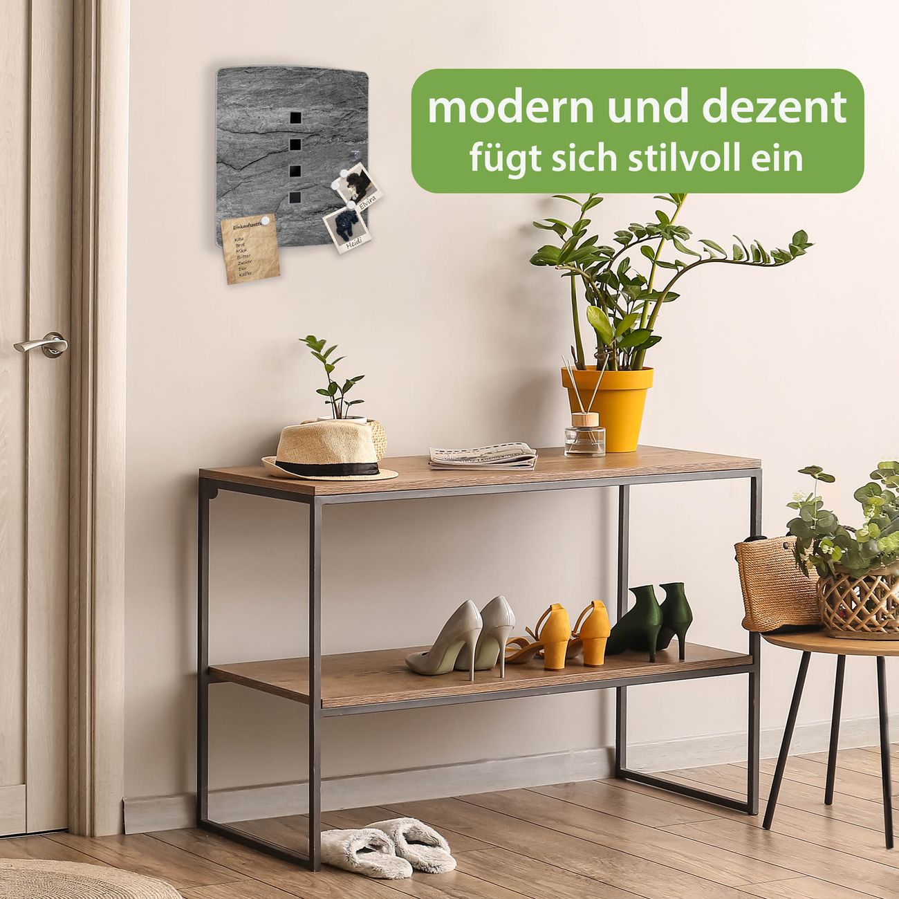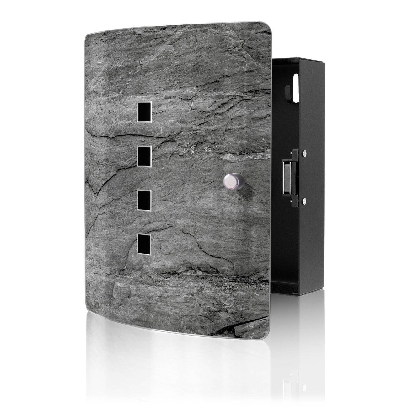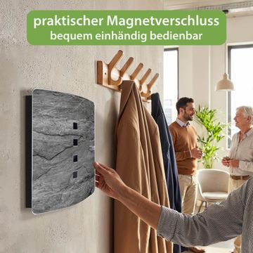 Funktion / Nutzen: Die leicht geschwungene Edelstahltür ist mit einer hochwertigen Motivfolie und dem Motiv Motiv Schiefer Platte 1 kaschiert. Ein praktischer Magnetverschluss ermöglicht Ihnen ein schnelles Öffnen und Schließen. Befestigt wird der Schlüsselkasten an 2 Stellen auf der Rückseite, passendes Montagematerial fügen wir bereits bei.