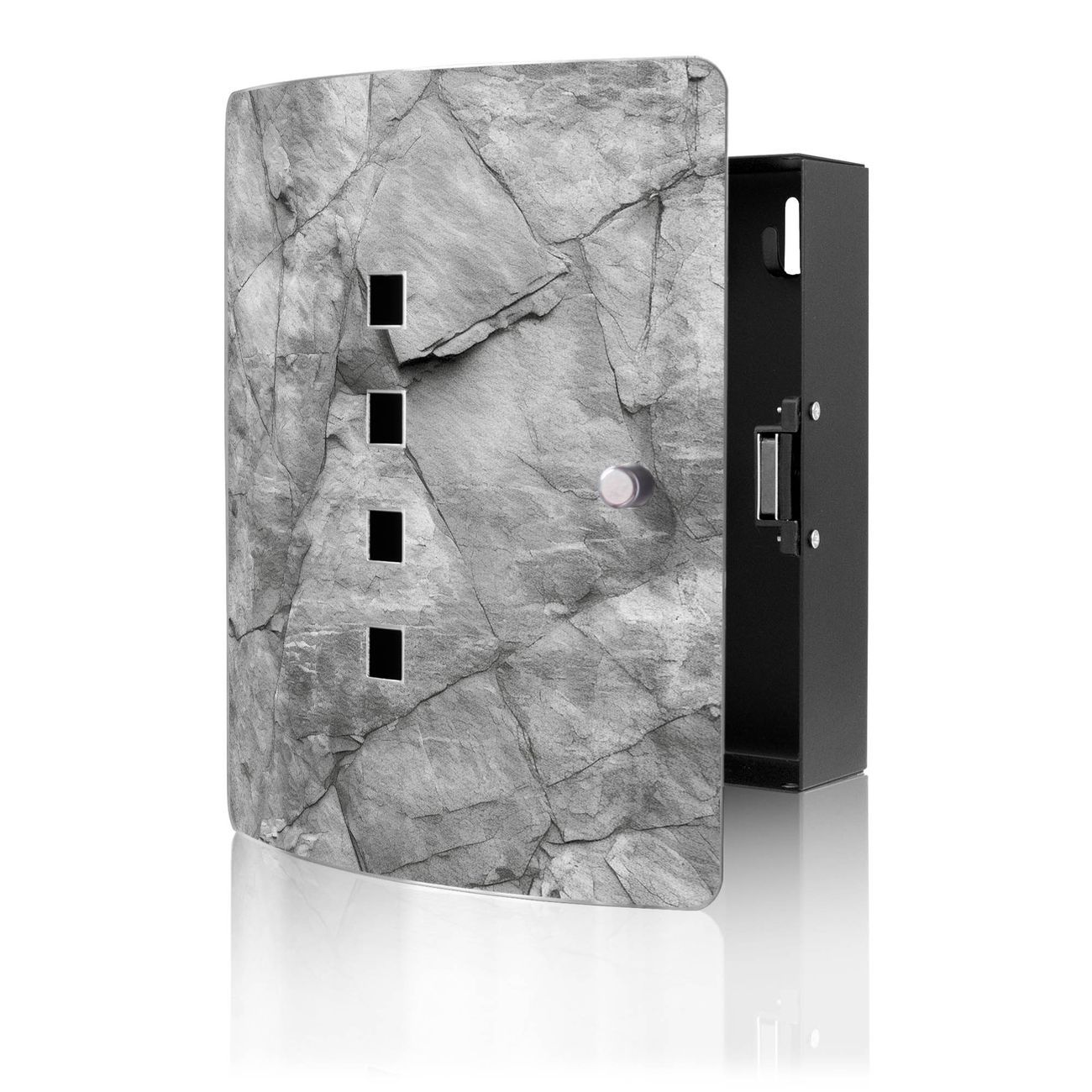 Funktion / Nutzen: Die leicht geschwungene Edelstahltür ist mit einer hochwertigen Motivfolie und dem Motiv Motiv Schiefer Platte 2 kaschiert. Ein praktischer Magnetverschluss ermöglicht Ihnen ein schnelles Öffnen und Schließen. Befestigt wird der Schlüsselkasten an 2 Stellen auf der Rückseite, passendes Montagematerial fügen wir bereits bei.