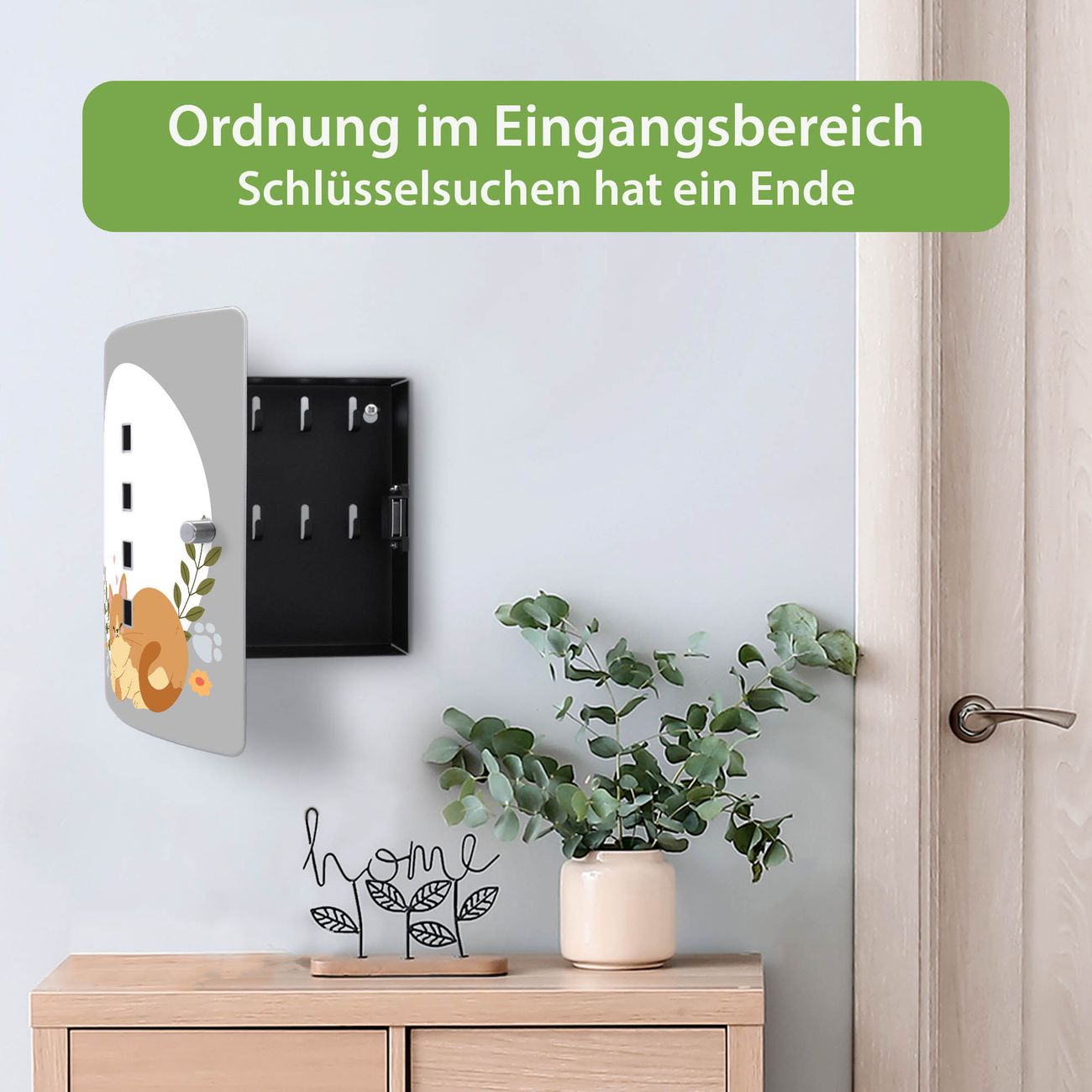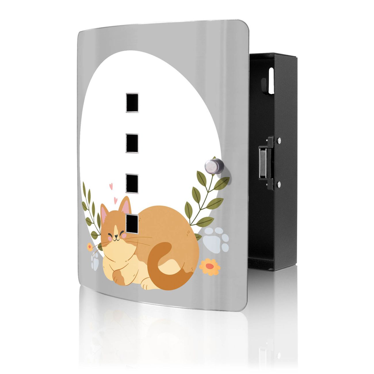 Funktion / Nutzen: Die leicht geschwungene Edelstahltür ist mit einer hochwertigen Motivfolie und dem Motiv Motiv Schlafende Katze im Garten kaschiert. Ein praktischer Magnetverschluss ermöglicht Ihnen ein schnelles Öffnen und Schließen. Befestigt wird der Schlüsselkasten an 2 Stellen auf der Rückseite, passendes Montagematerial fügen wir bereits bei.