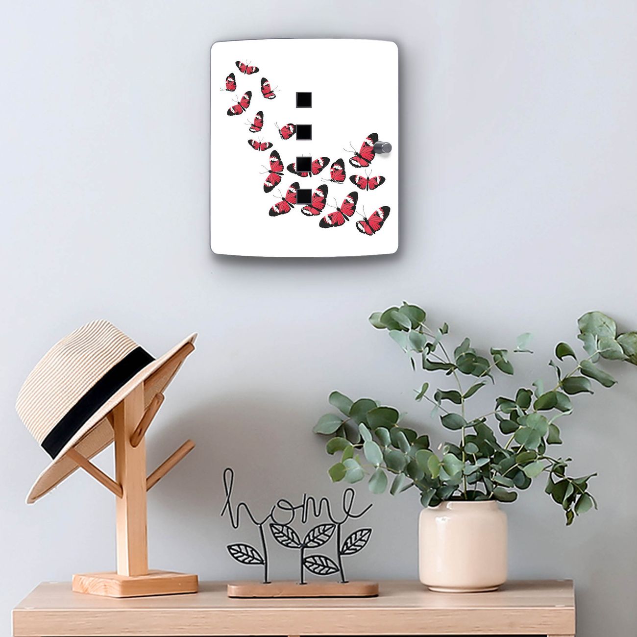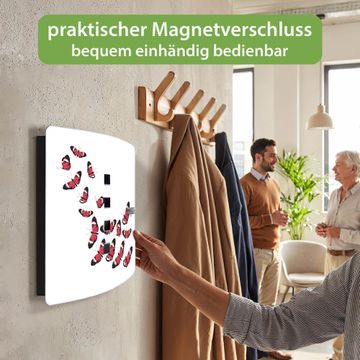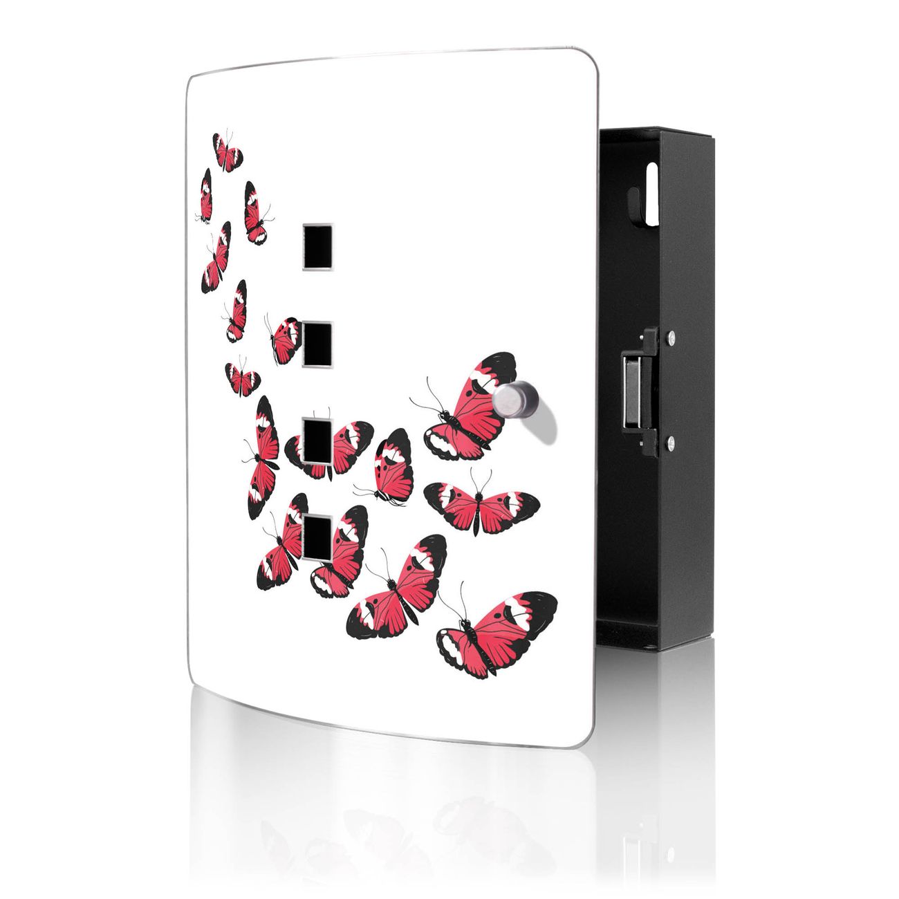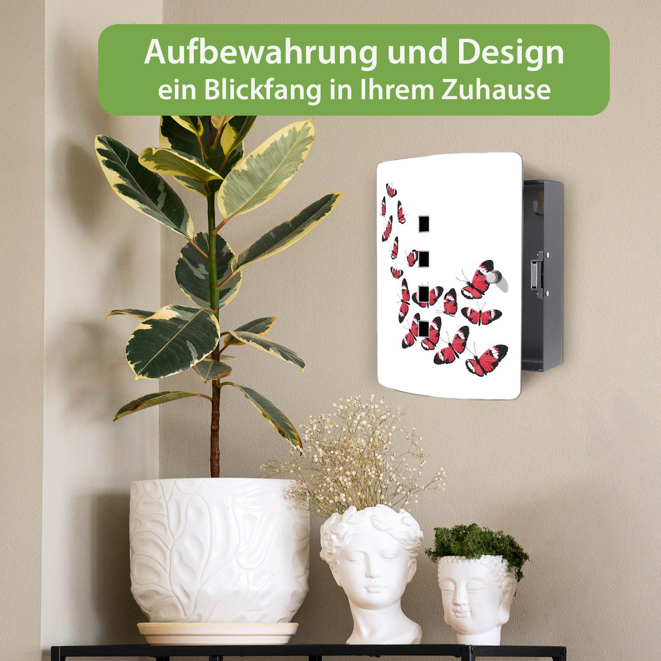 Funktion / Nutzen: Die leicht geschwungene Edelstahltür ist mit einer hochwertigen Motivfolie und dem Motiv Motiv Schmetterlingsflug kaschiert. Ein praktischer Magnetverschluss ermöglicht Ihnen ein schnelles Öffnen und Schließen. Befestigt wird der Schlüsselkasten an 2 Stellen auf der Rückseite, passendes Montagematerial fügen wir bereits bei.