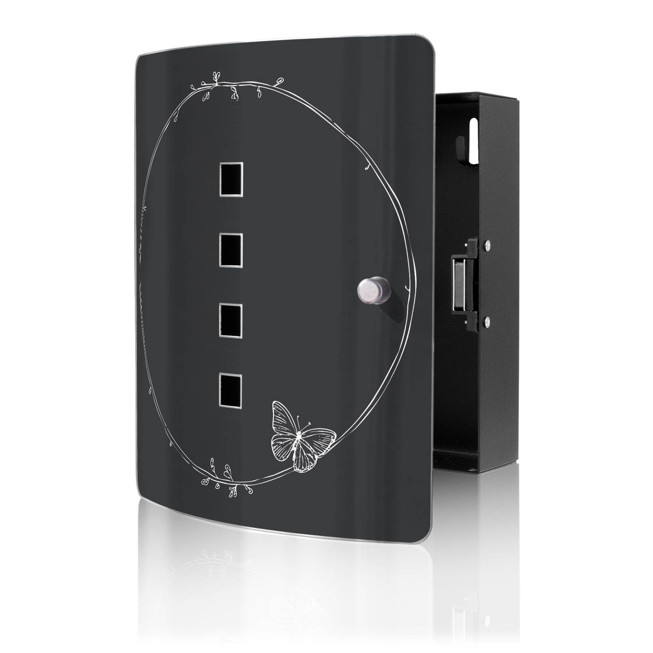 Funktion / Nutzen: Die leicht geschwungene Edelstahltür ist mit einer hochwertigen Motivfolie und dem Motiv Motiv Schmetterlingskranz kaschiert. Ein praktischer Magnetverschluss ermöglicht Ihnen ein schnelles Öffnen und Schließen. Befestigt wird der Schlüsselkasten an 2 Stellen auf der Rückseite, passendes Montagematerial fügen wir bereits bei.