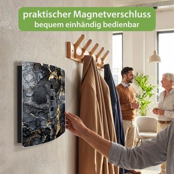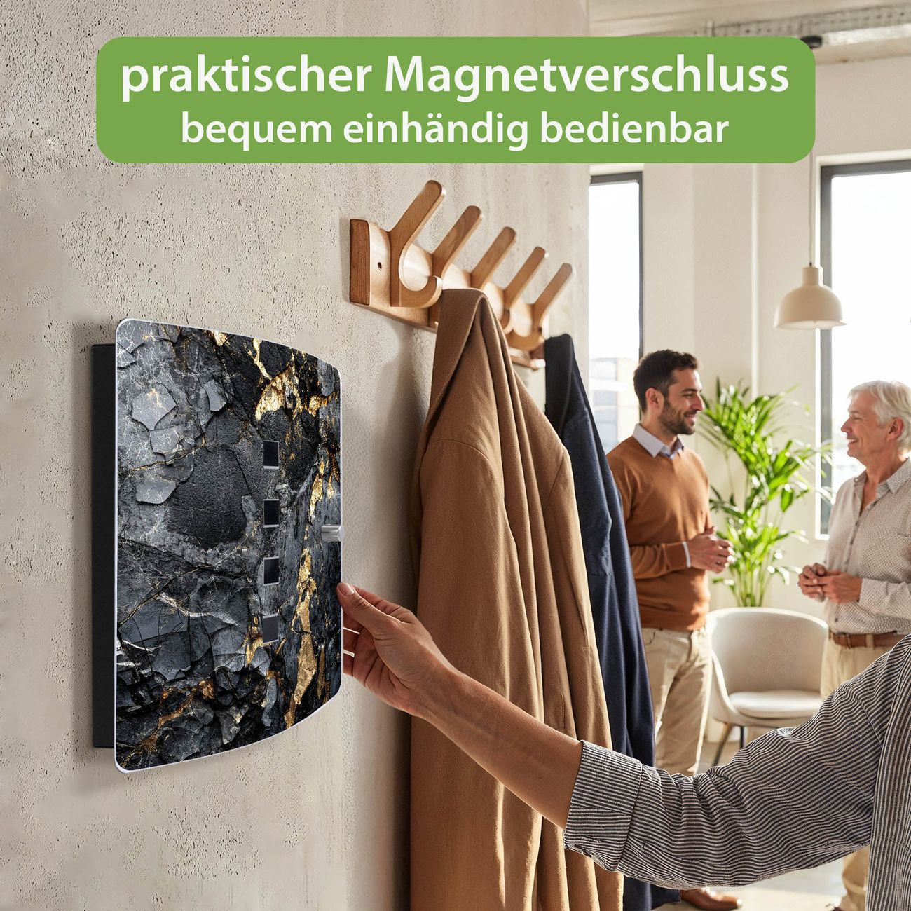 Funktion / Nutzen: Die leicht geschwungene Edelstahltür ist mit einer hochwertigen Motivfolie und dem Motiv Motiv Schwarzer Marmor mit Gold 1 kaschiert. Ein praktischer Magnetverschluss ermöglicht Ihnen ein schnelles Öffnen und Schließen. Befestigt wird der Schlüsselkasten an 2 Stellen auf der Rückseite, passendes Montagematerial fügen wir bereits bei.