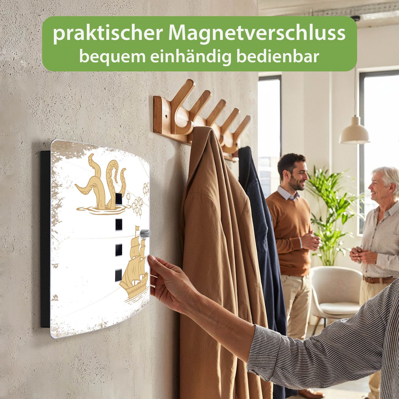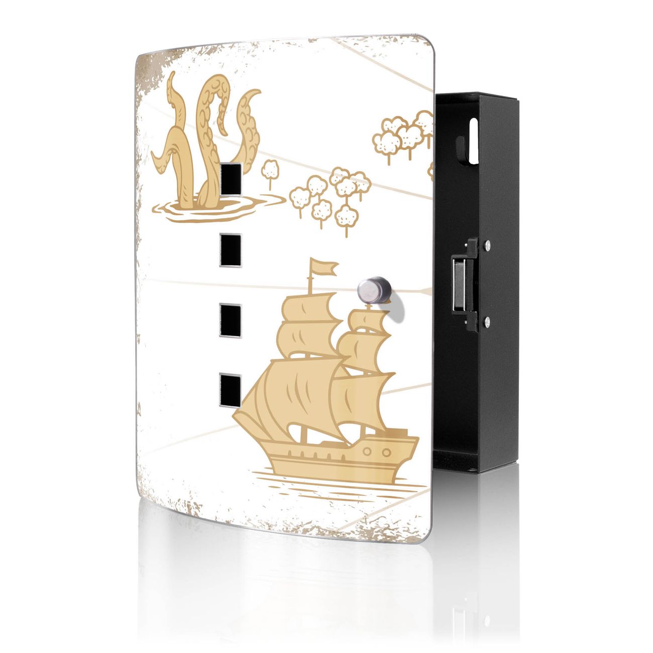 Funktion / Nutzen: Die leicht geschwungene Edelstahltür ist mit einer hochwertigen Motivfolie und dem Motiv Motiv Seemonster und Segelschiff kaschiert. Ein praktischer Magnetverschluss ermöglicht Ihnen ein schnelles Öffnen und Schließen. Befestigt wird der Schlüsselkasten an 2 Stellen auf der Rückseite, passendes Montagematerial fügen wir bereits bei.