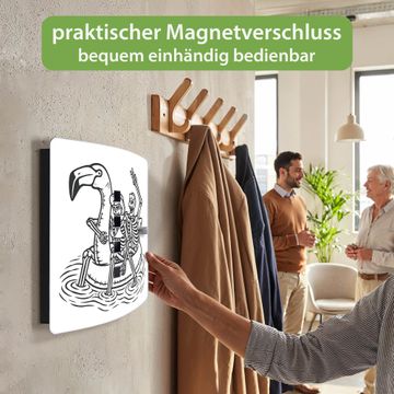 Funktion / Nutzen: Die leicht geschwungene Edelstahltür ist mit einer hochwertigen Motivfolie und dem Motiv Motiv Skelette mit Flamingoschwimmring 2 kaschiert. Ein praktischer Magnetverschluss ermöglicht Ihnen ein schnelles Öffnen und Schließen. Befestigt wird der Schlüsselkasten an 2 Stellen auf der Rückseite, passendes Montagematerial fügen wir bereits bei.