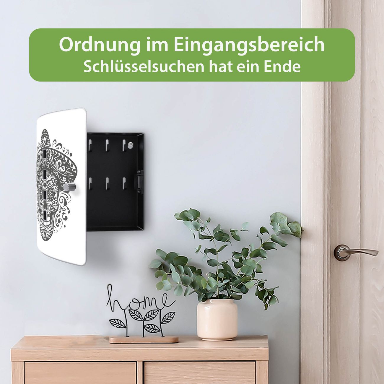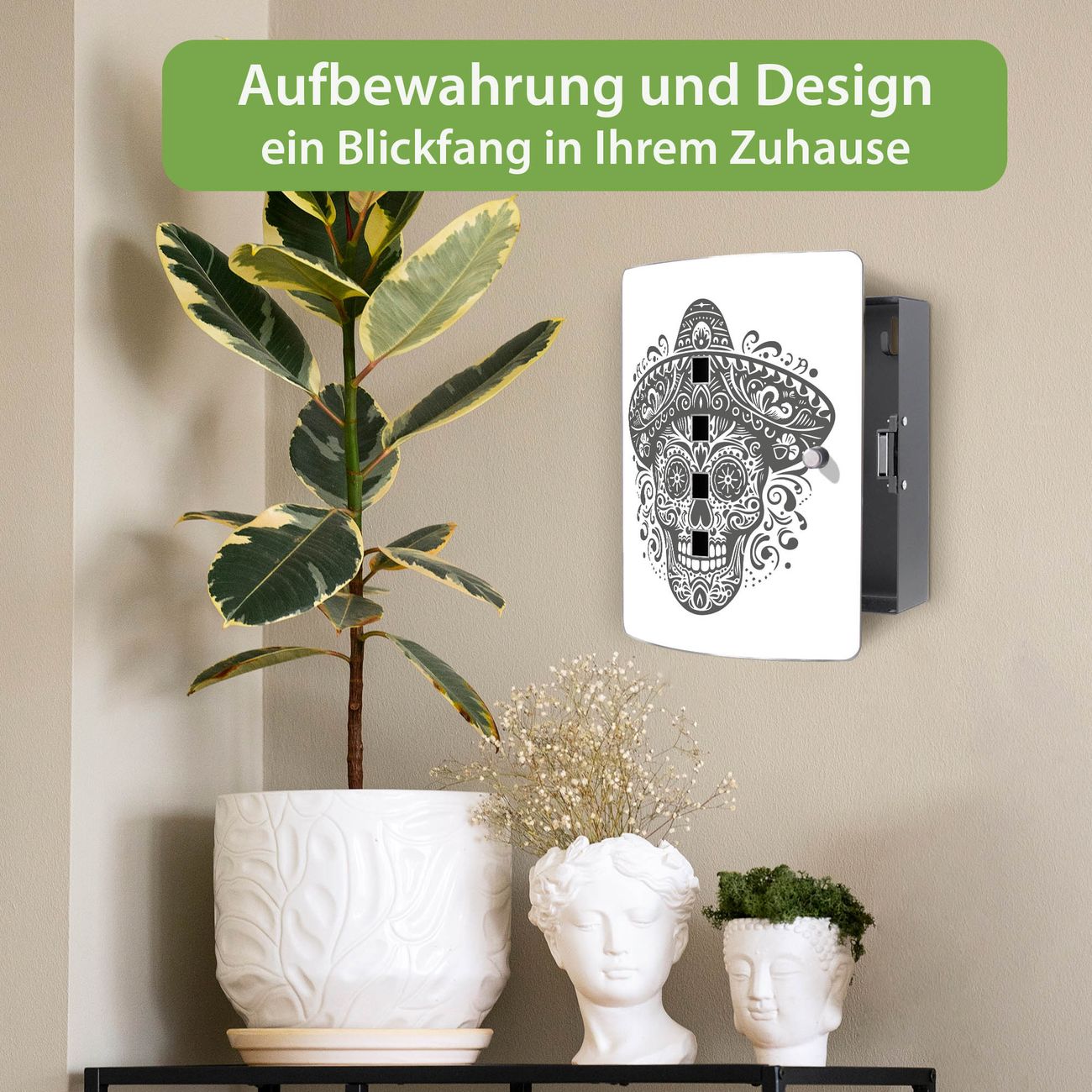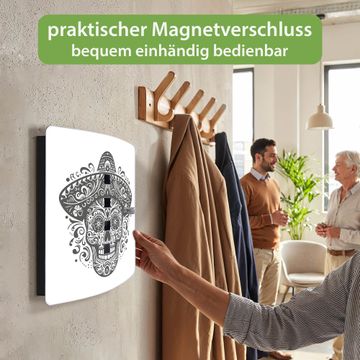 Funktion / Nutzen: Die leicht geschwungene Edelstahltür ist mit einer hochwertigen Motivfolie und dem Motiv Motiv Sombrero Totenkopf kaschiert. Ein praktischer Magnetverschluss ermöglicht Ihnen ein schnelles Öffnen und Schließen. Befestigt wird der Schlüsselkasten an 2 Stellen auf der Rückseite, passendes Montagematerial fügen wir bereits bei.