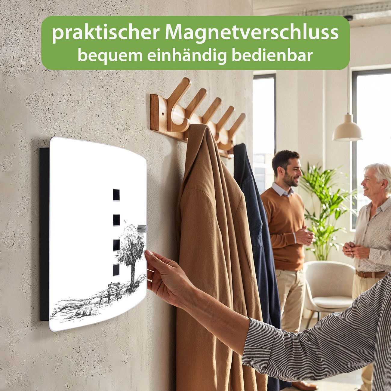 Funktion / Nutzen: Die leicht geschwungene Edelstahltür ist mit einer hochwertigen Motivfolie und dem Motiv Motiv Sommerliche Parkszene kaschiert. Ein praktischer Magnetverschluss ermöglicht Ihnen ein schnelles Öffnen und Schließen. Befestigt wird der Schlüsselkasten an 2 Stellen auf der Rückseite, passendes Montagematerial fügen wir bereits bei.