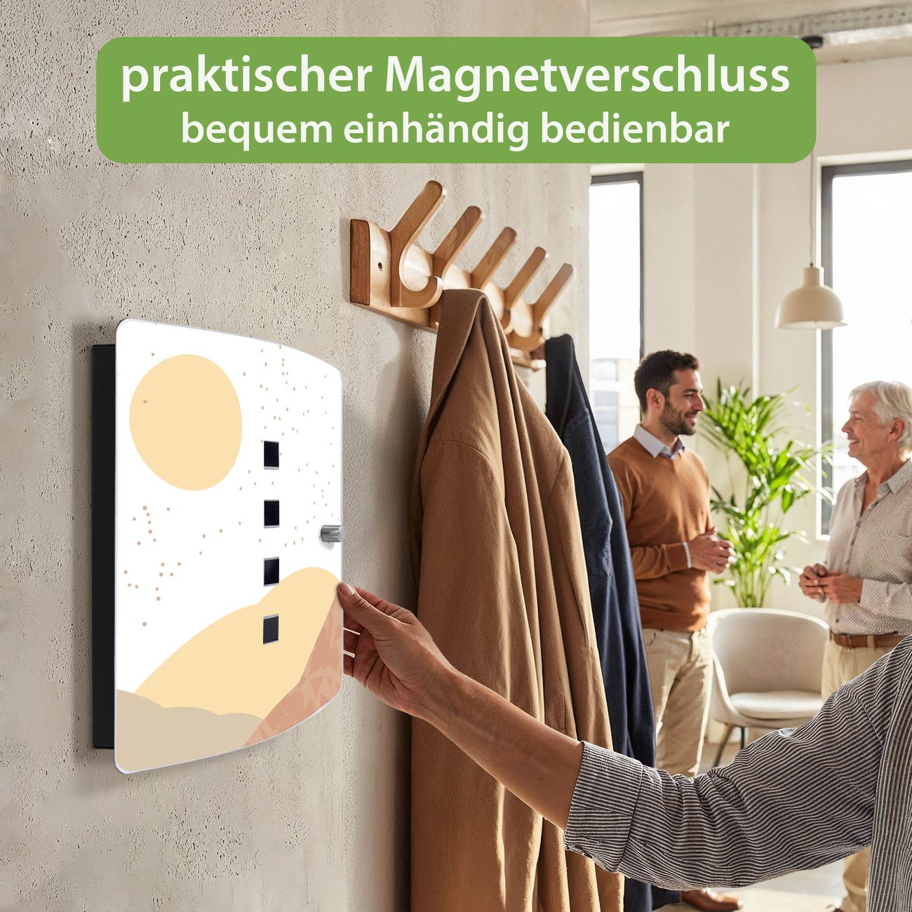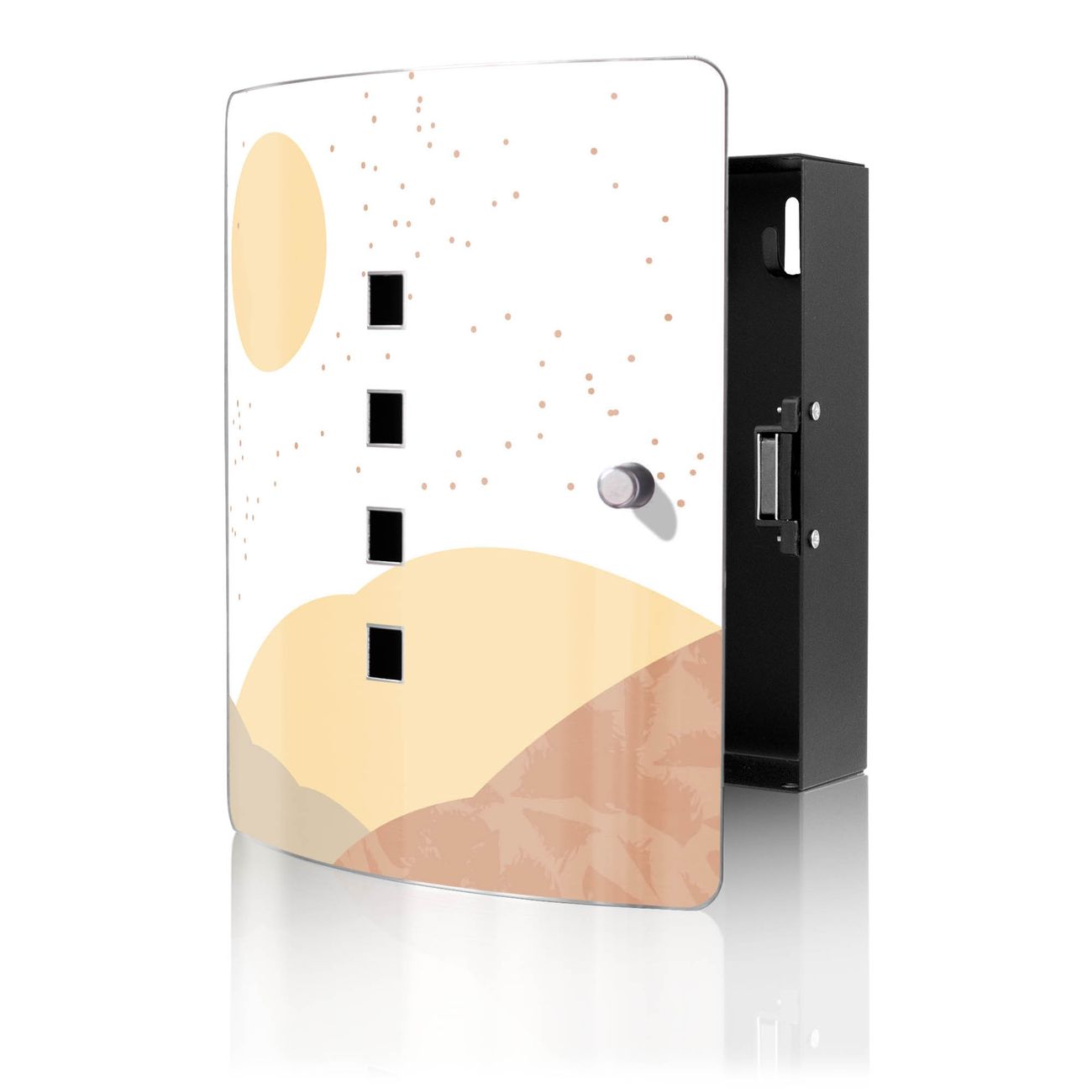 Funktion / Nutzen: Die leicht geschwungene Edelstahltür ist mit einer hochwertigen Motivfolie und dem Motiv Motiv Sommertag Abstrakt kaschiert. Ein praktischer Magnetverschluss ermöglicht Ihnen ein schnelles Öffnen und Schließen. Befestigt wird der Schlüsselkasten an 2 Stellen auf der Rückseite, passendes Montagematerial fügen wir bereits bei.