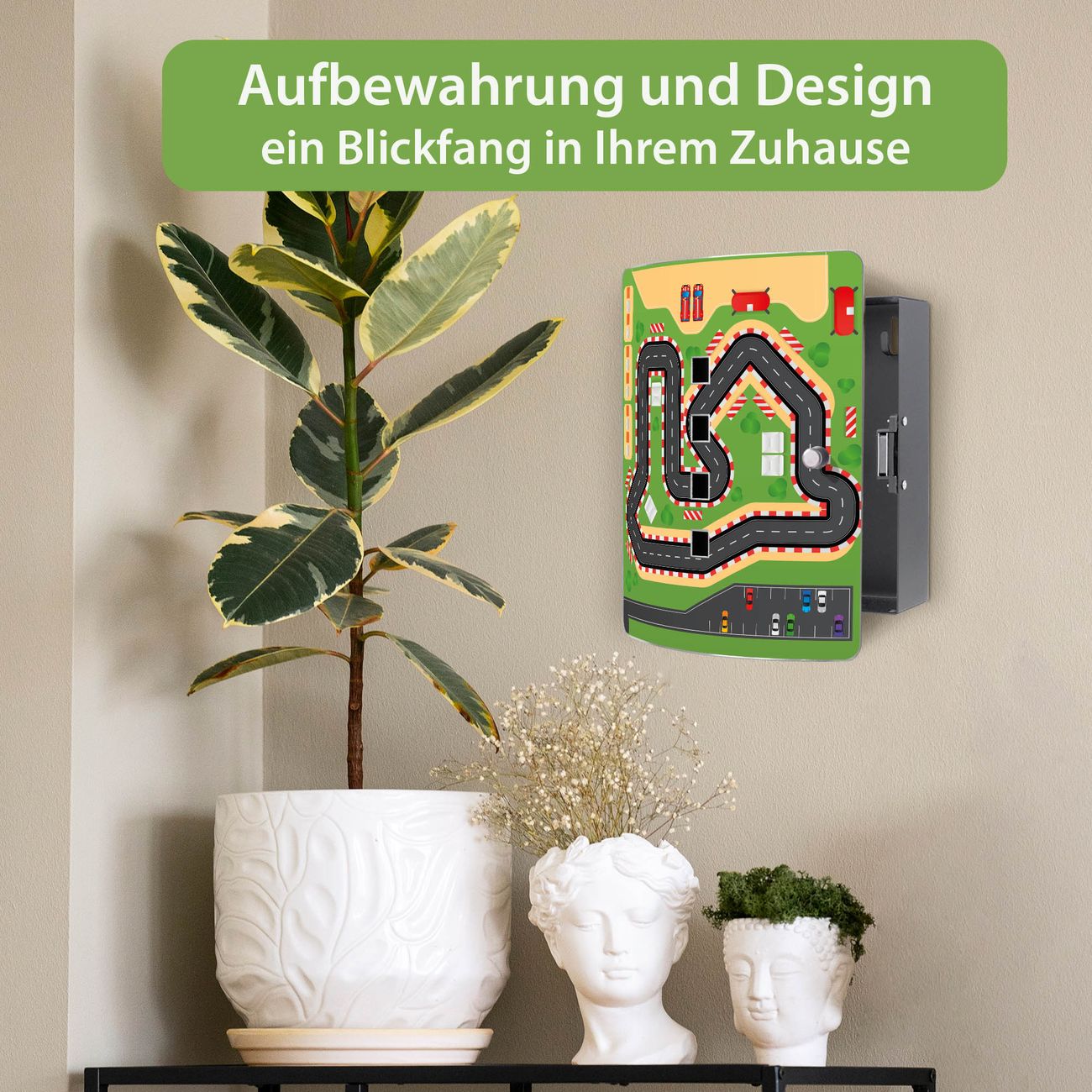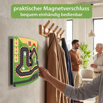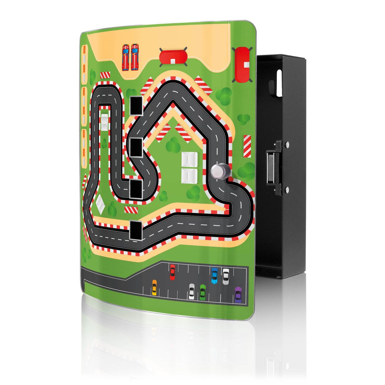 Funktion / Nutzen: Die leicht geschwungene Edelstahltür ist mit einer hochwertigen Motivfolie und dem Motiv Motiv Spielstraße 1 kaschiert. Ein praktischer Magnetverschluss ermöglicht Ihnen ein schnelles Öffnen und Schließen. Befestigt wird der Schlüsselkasten an 2 Stellen auf der Rückseite, passendes Montagematerial fügen wir bereits bei.