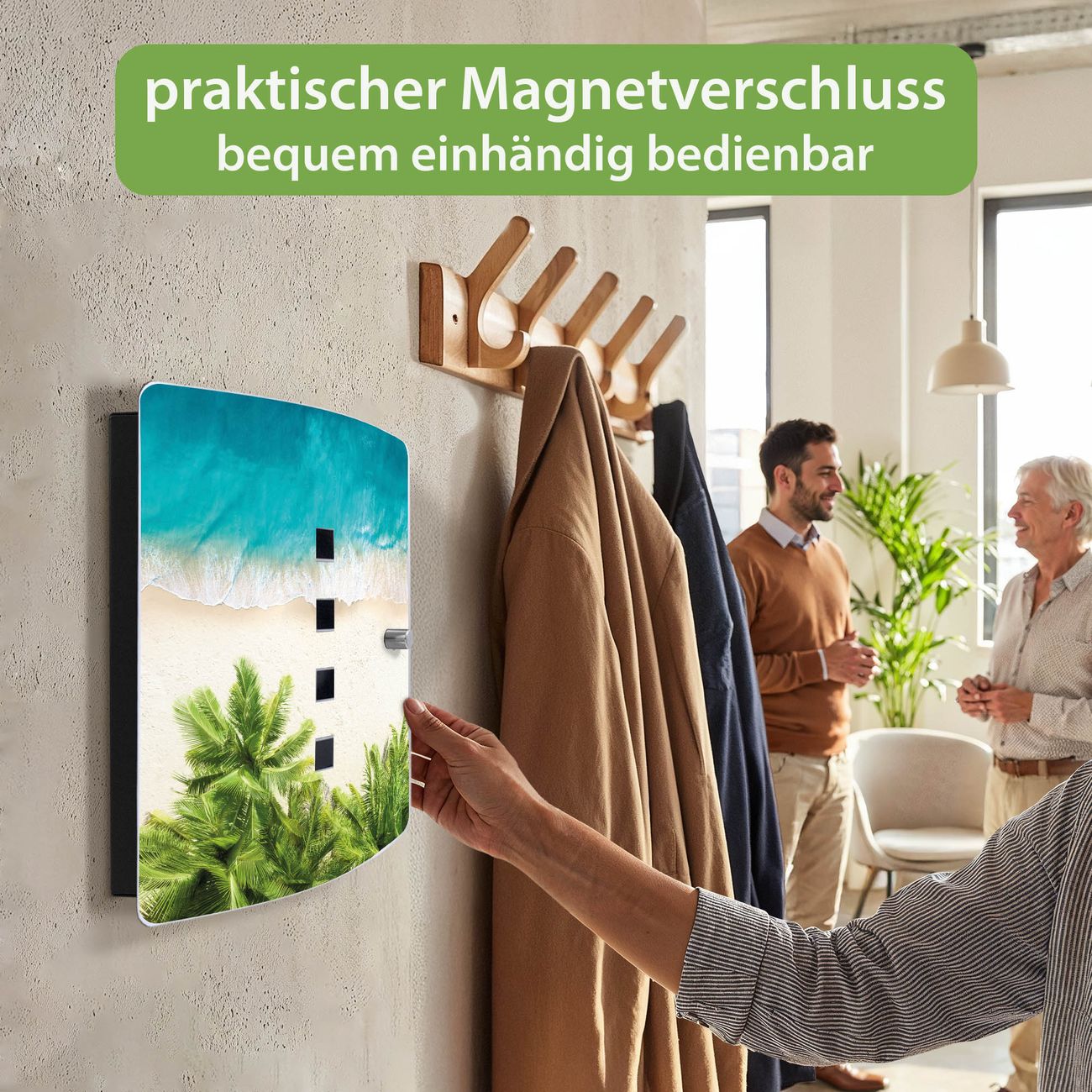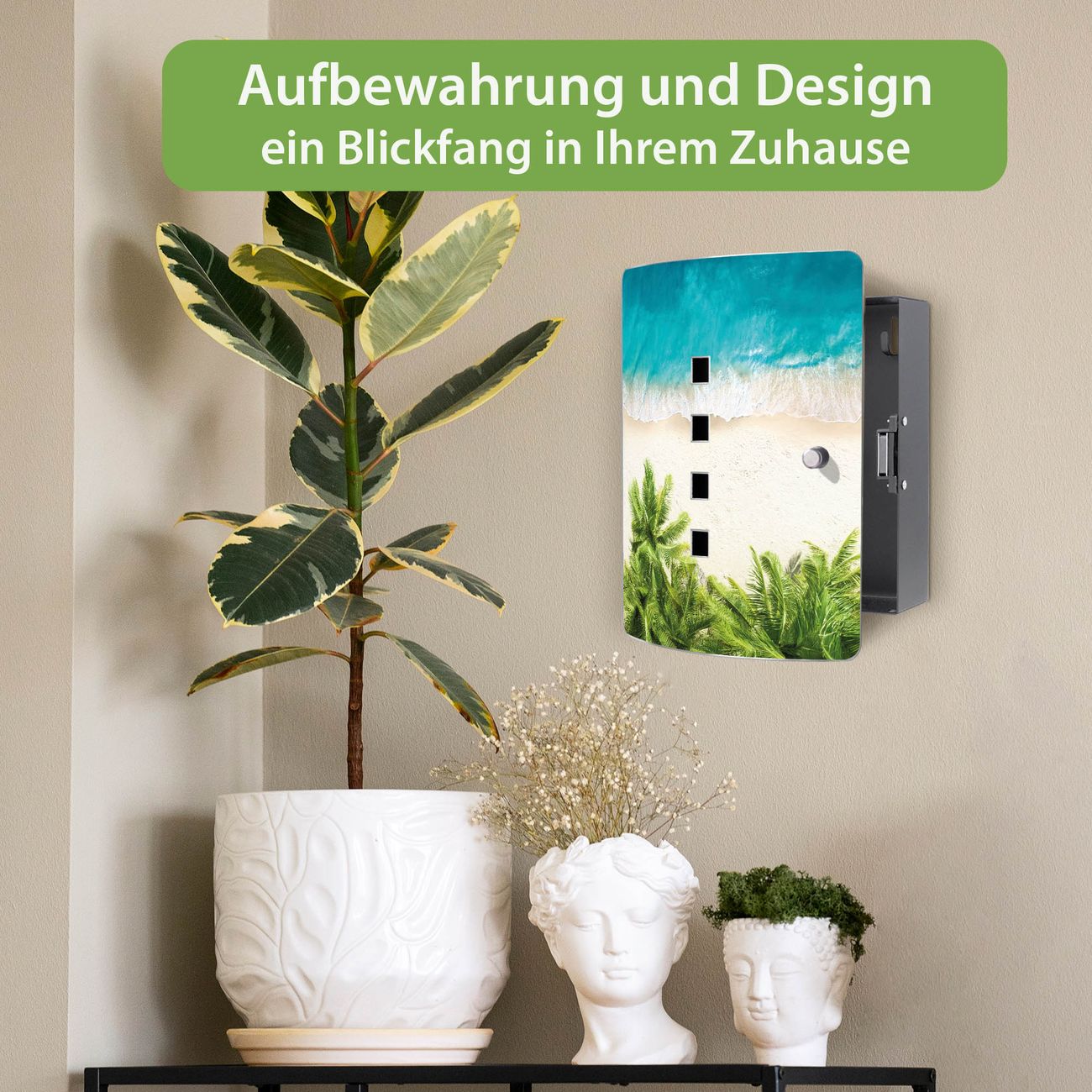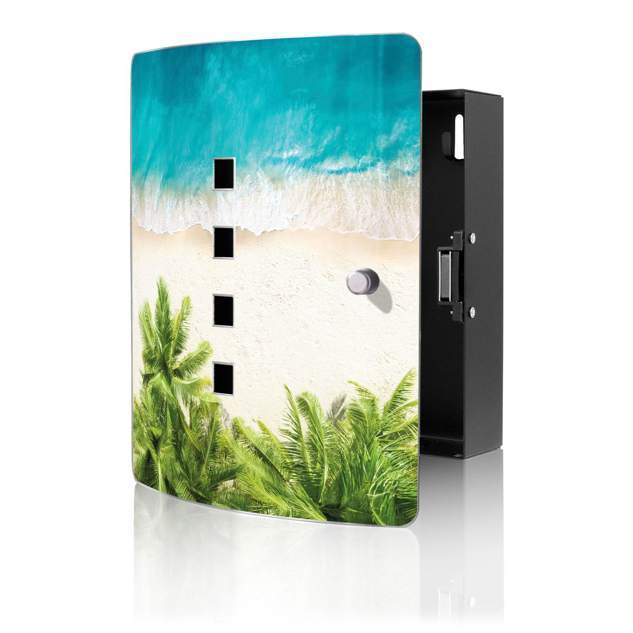 Funktion / Nutzen: Die leicht geschwungene Edelstahltür ist mit einer hochwertigen Motivfolie und dem Motiv Motiv Strandtag kaschiert. Ein praktischer Magnetverschluss ermöglicht Ihnen ein schnelles Öffnen und Schließen. Befestigt wird der Schlüsselkasten an 2 Stellen auf der Rückseite, passendes Montagematerial fügen wir bereits bei.
