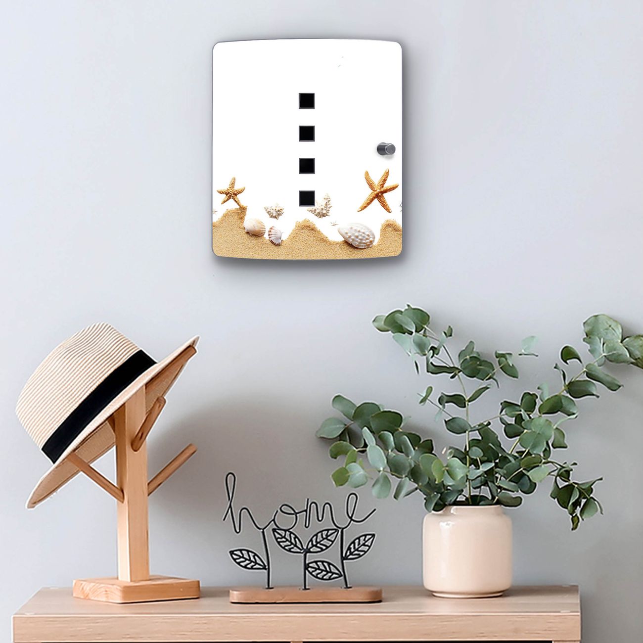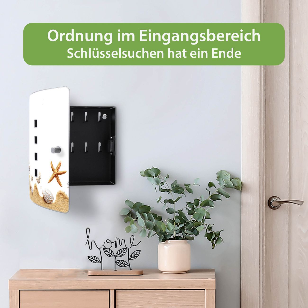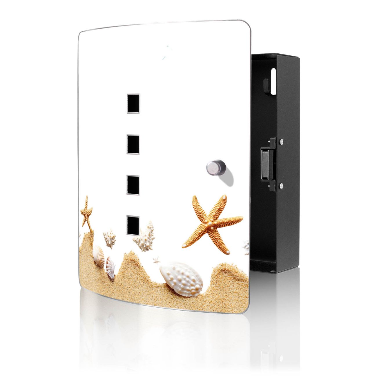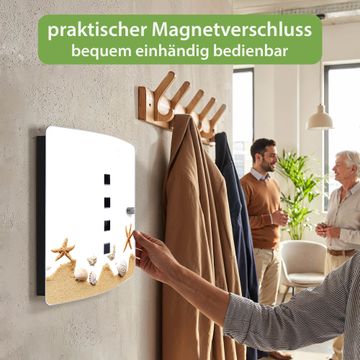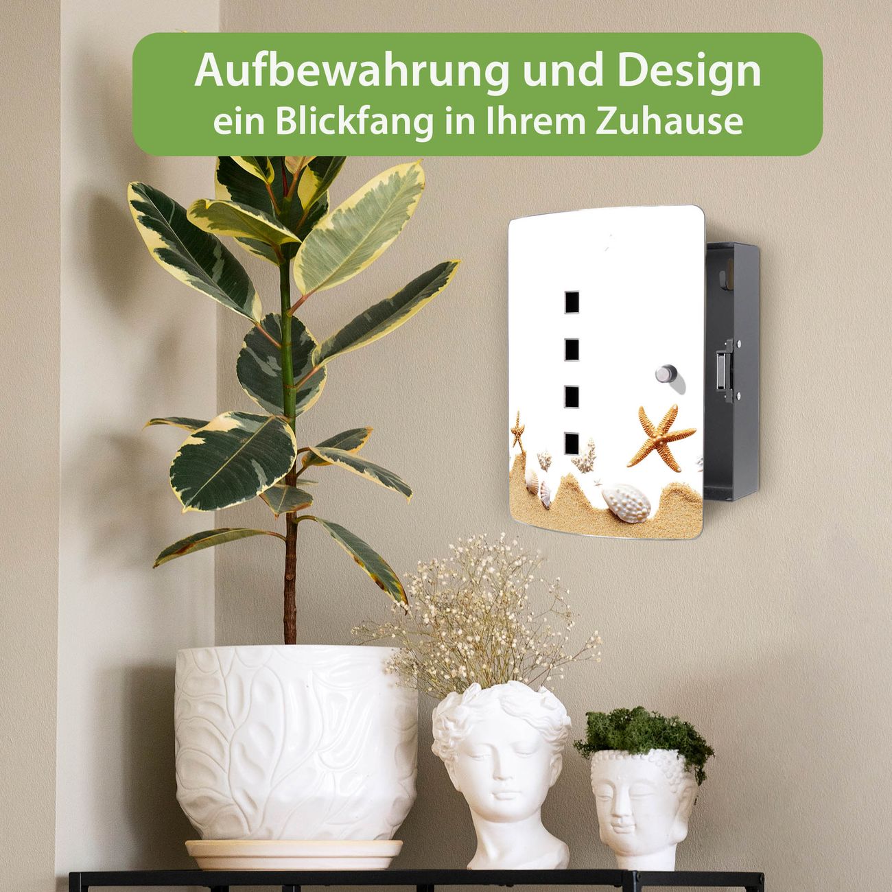 Funktion / Nutzen: Die leicht geschwungene Edelstahltür ist mit einer hochwertigen Motivfolie und dem Motiv Motiv Strandzauber kaschiert. Ein praktischer Magnetverschluss ermöglicht Ihnen ein schnelles Öffnen und Schließen. Befestigt wird der Schlüsselkasten an 2 Stellen auf der Rückseite, passendes Montagematerial fügen wir bereits bei.