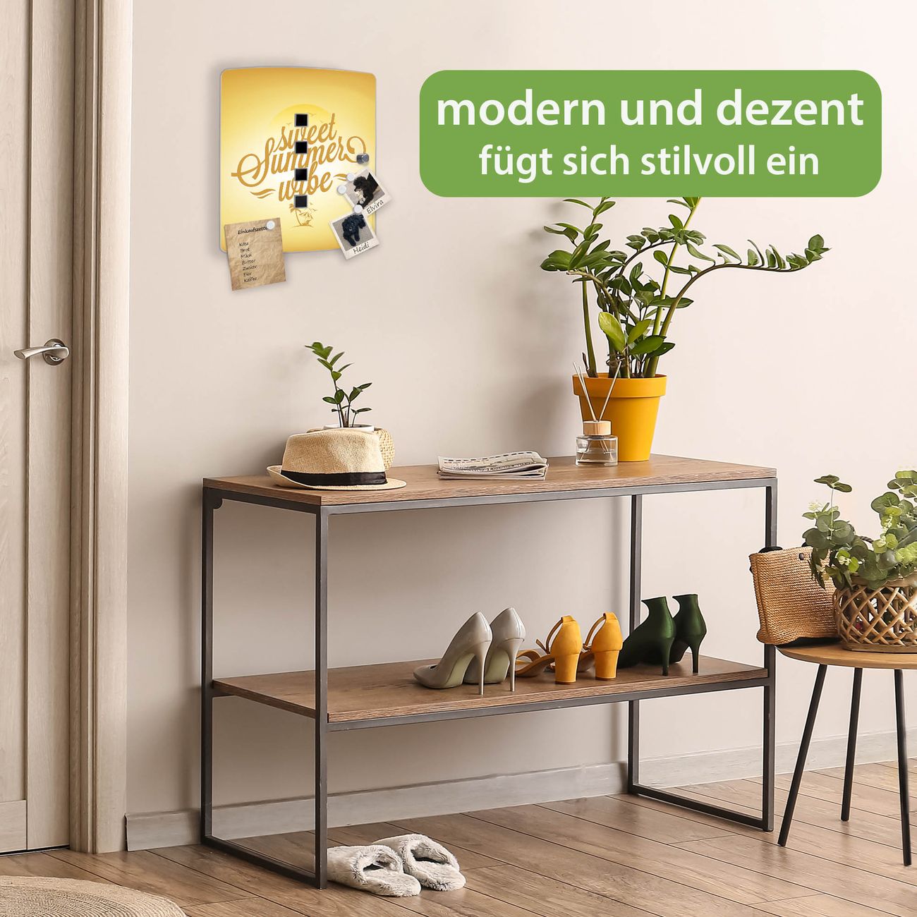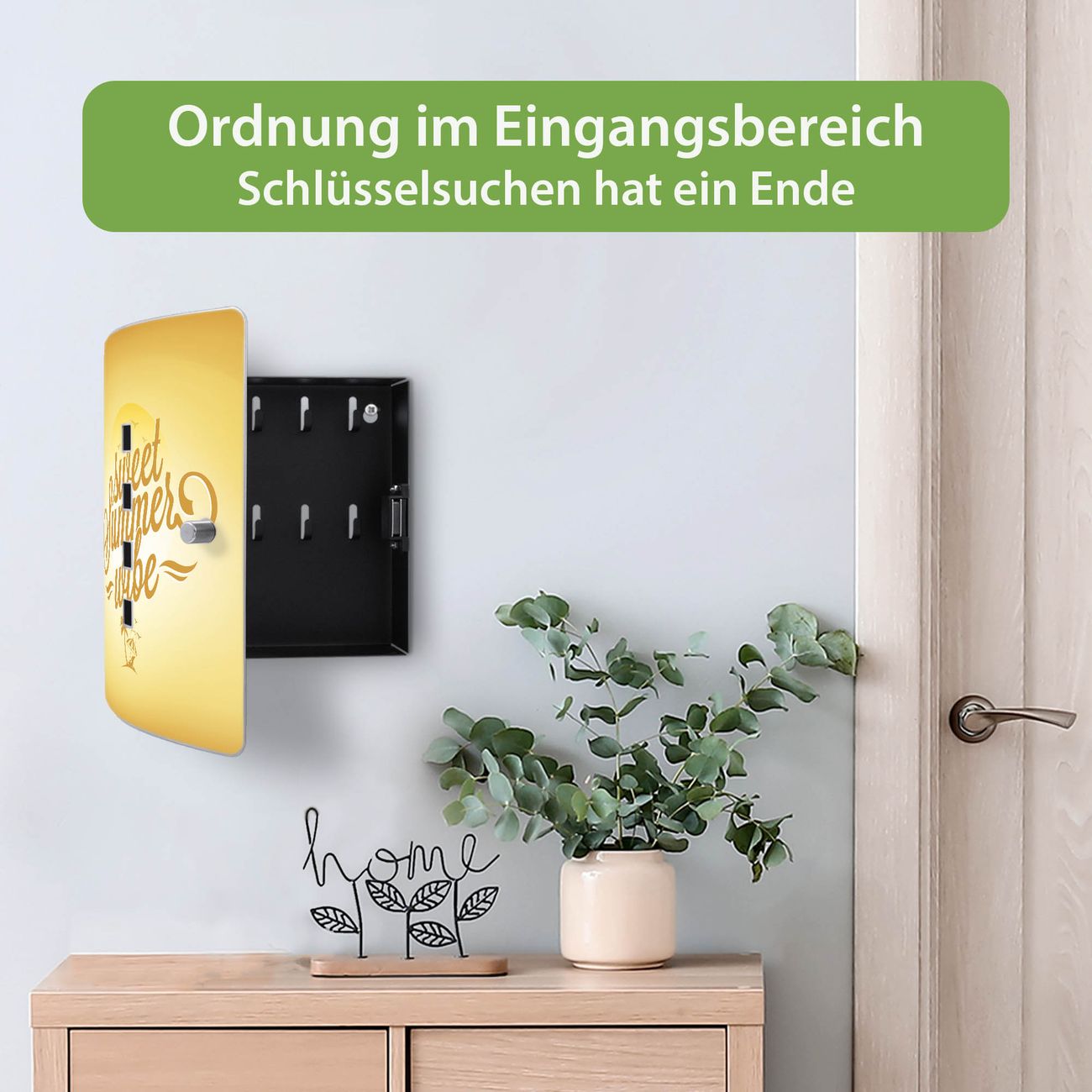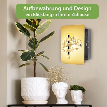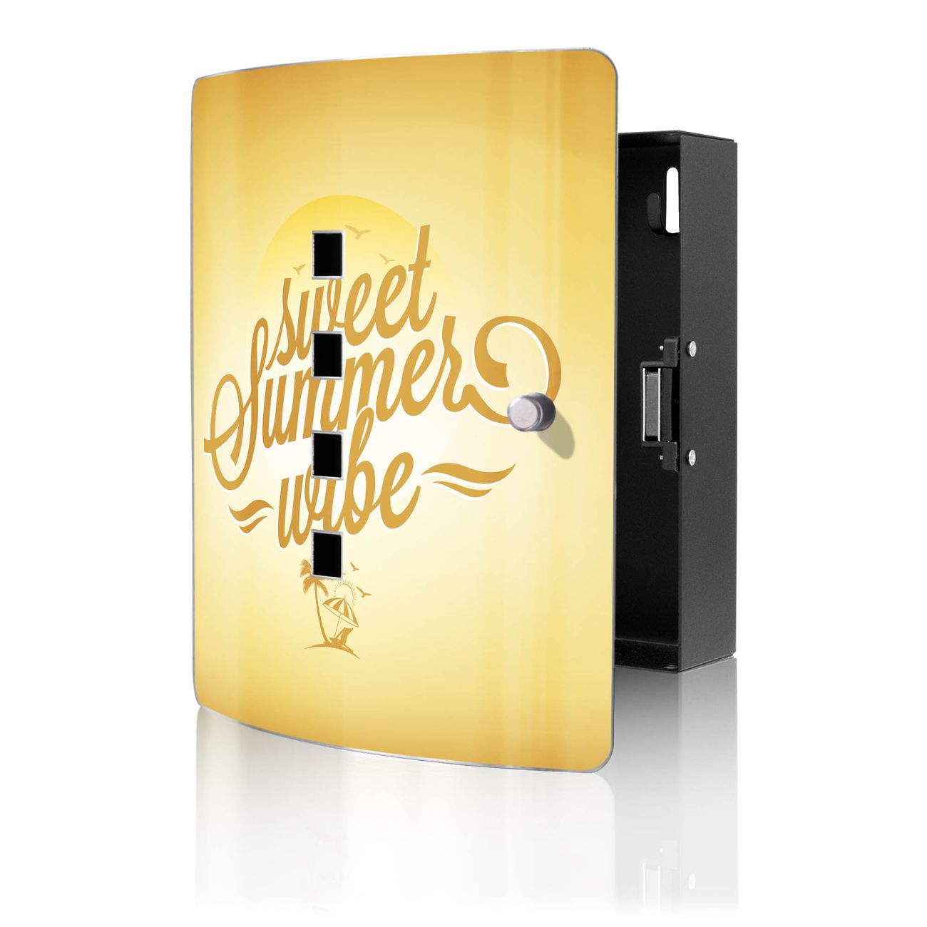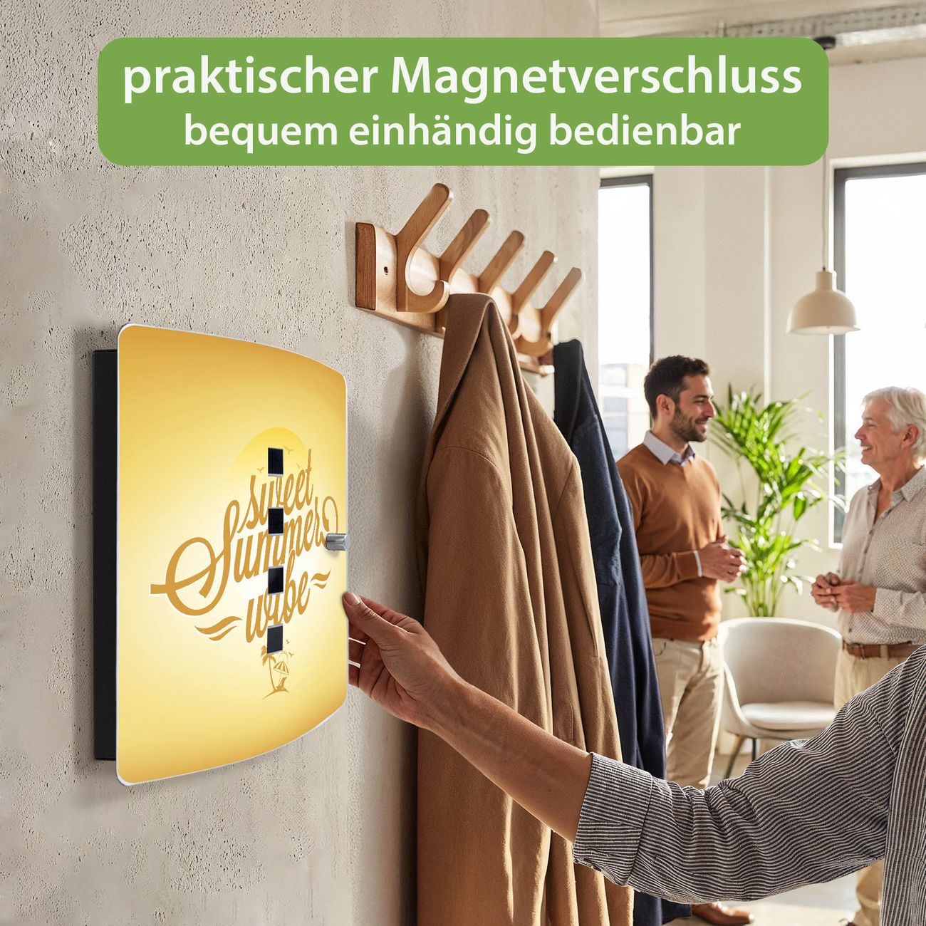 Funktion / Nutzen: Die leicht geschwungene Edelstahltür ist mit einer hochwertigen Motivfolie und dem Motiv Motiv Summer Wibe kaschiert. Ein praktischer Magnetverschluss ermöglicht Ihnen ein schnelles Öffnen und Schließen. Befestigt wird der Schlüsselkasten an 2 Stellen auf der Rückseite, passendes Montagematerial fügen wir bereits bei.
