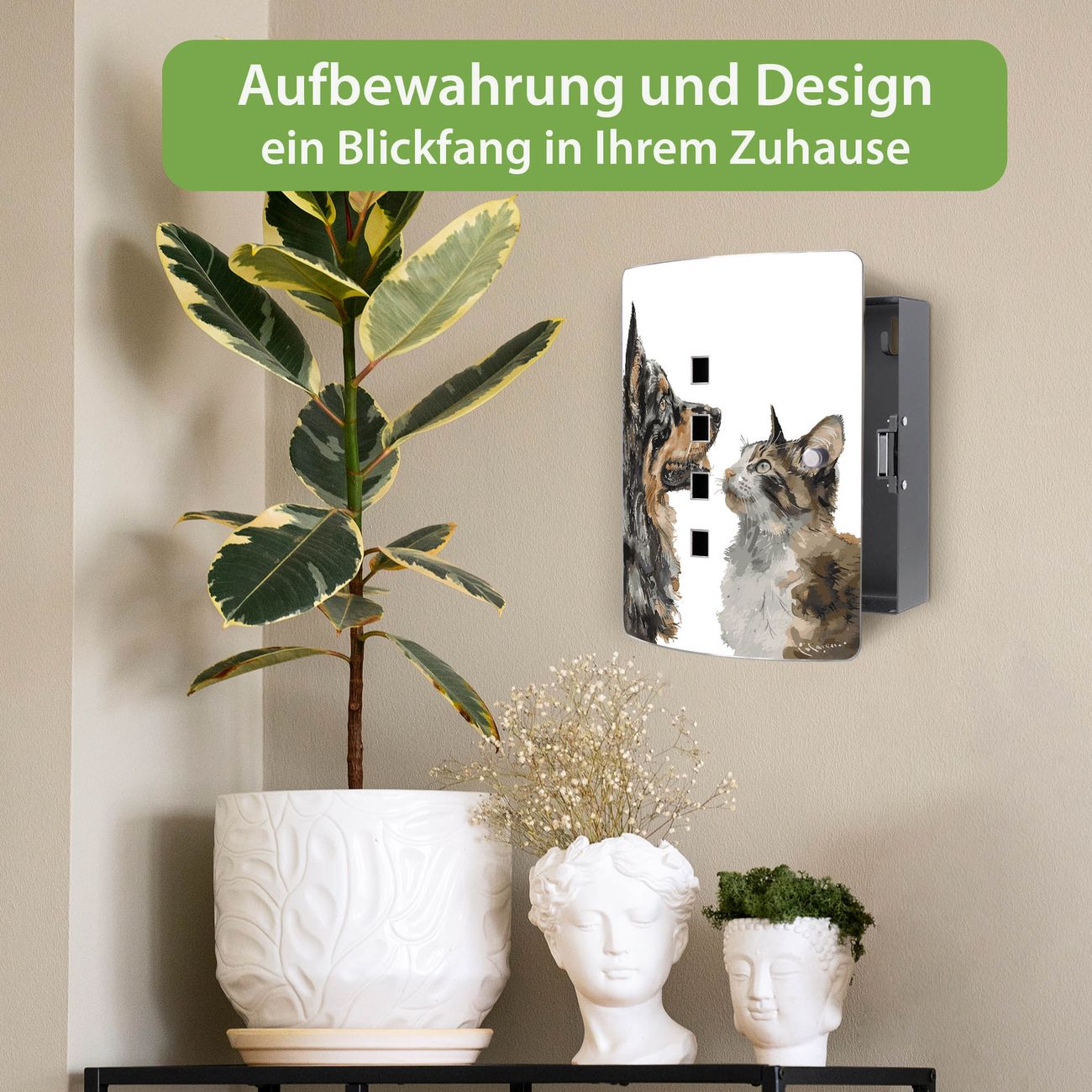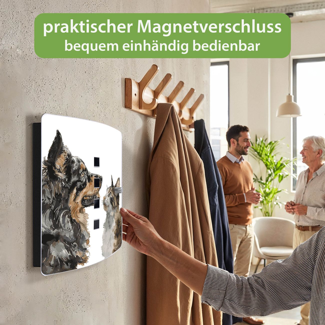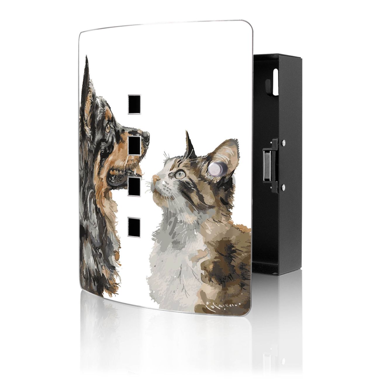 Funktion / Nutzen: Die leicht geschwungene Edelstahltür ist mit einer hochwertigen Motivfolie und dem Motiv Motiv Tierische Begegnung kaschiert. Ein praktischer Magnetverschluss ermöglicht Ihnen ein schnelles Öffnen und Schließen. Befestigt wird der Schlüsselkasten an 2 Stellen auf der Rückseite, passendes Montagematerial fügen wir bereits bei.