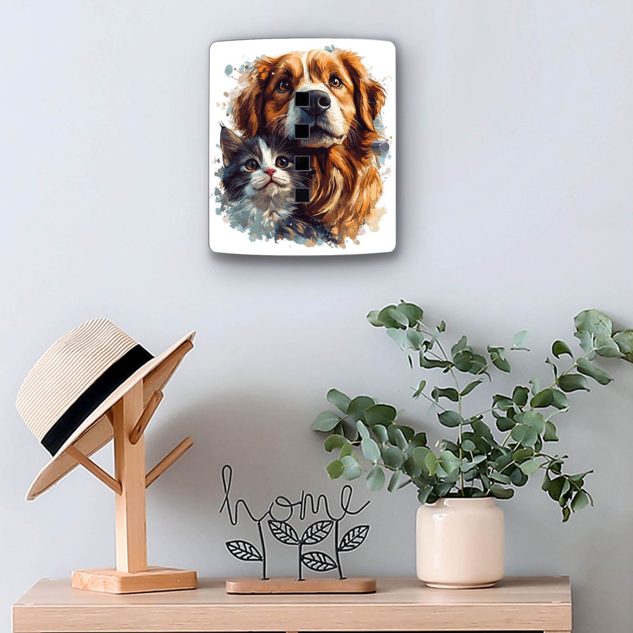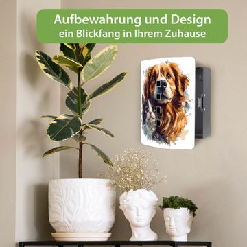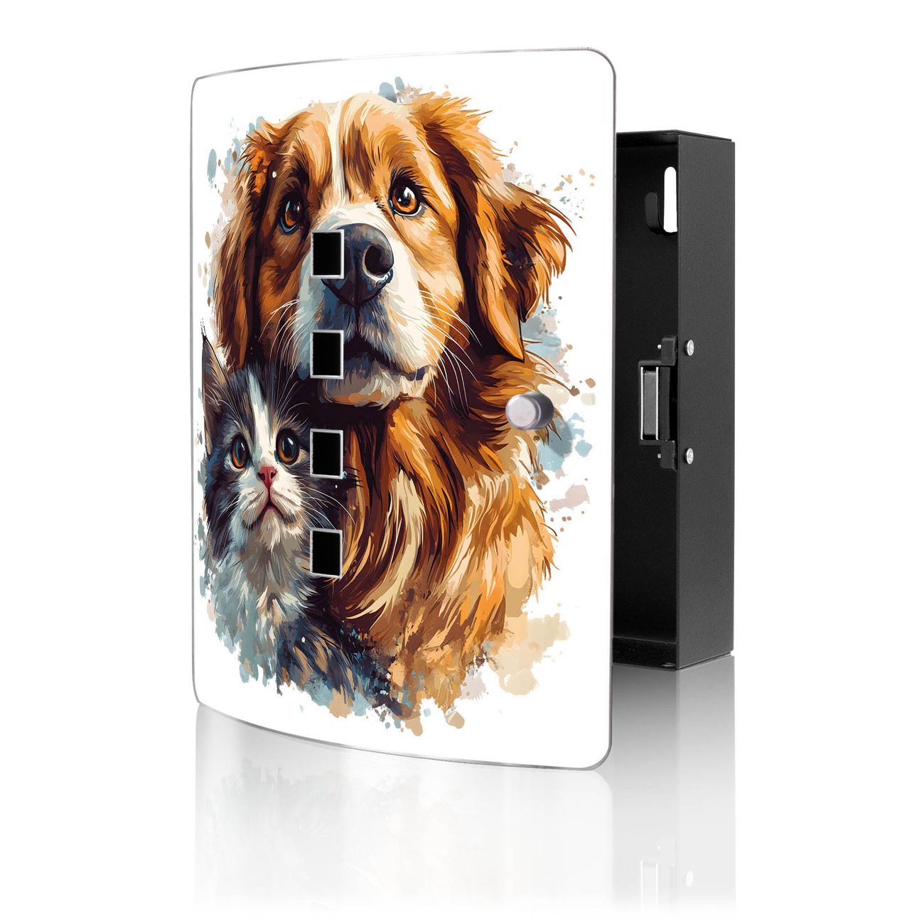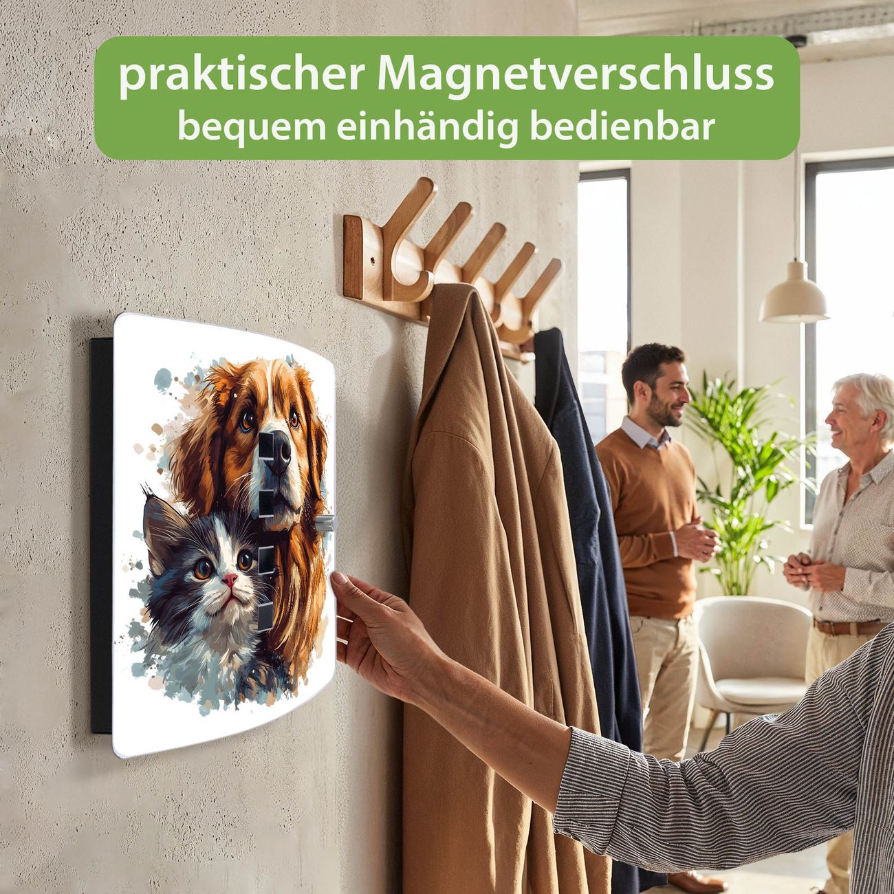 Funktion / Nutzen: Die leicht geschwungene Edelstahltür ist mit einer hochwertigen Motivfolie und dem Motiv Motiv Tierische Begleiter kaschiert. Ein praktischer Magnetverschluss ermöglicht Ihnen ein schnelles Öffnen und Schließen. Befestigt wird der Schlüsselkasten an 2 Stellen auf der Rückseite, passendes Montagematerial fügen wir bereits bei.
