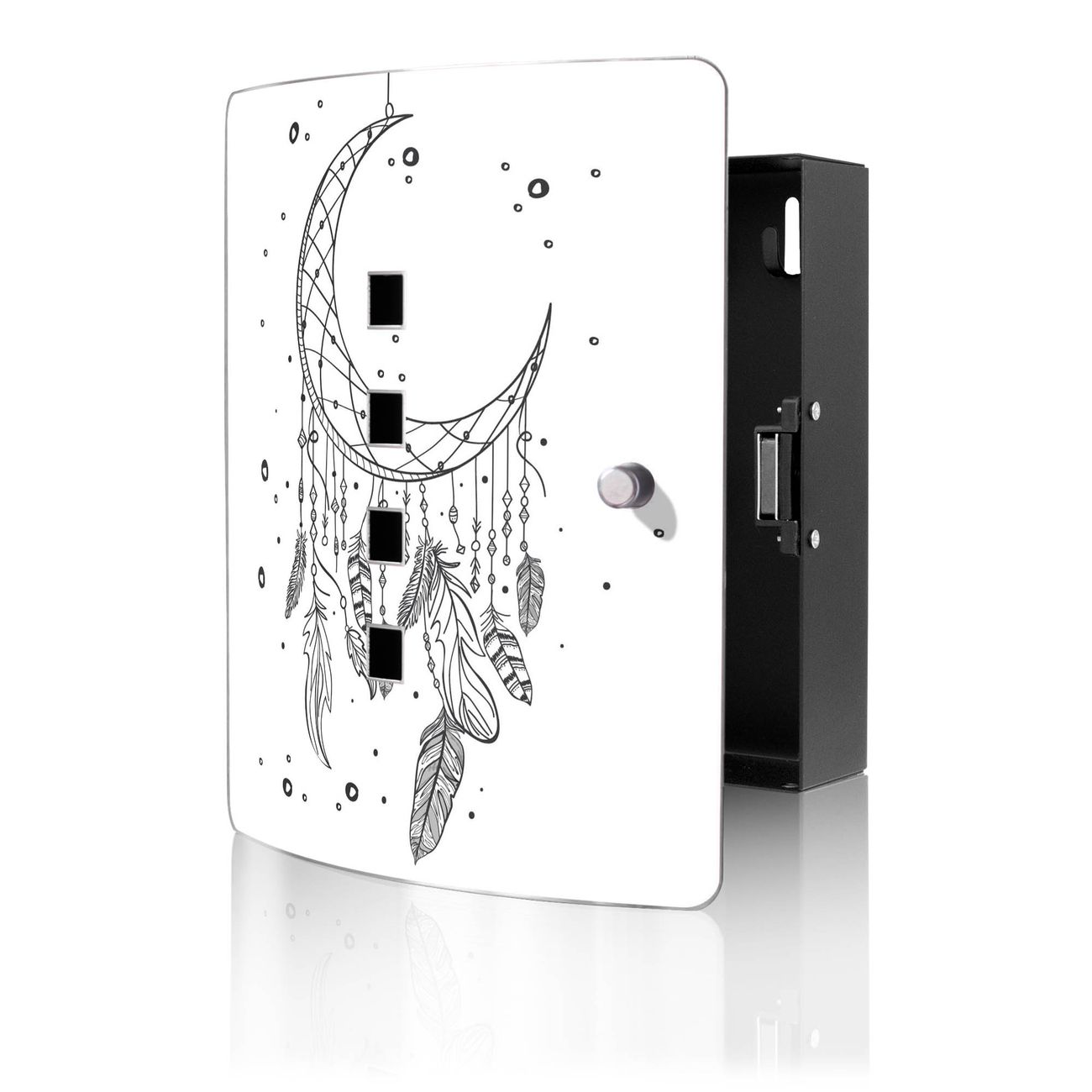 Funktion / Nutzen: Die leicht geschwungene Edelstahltür ist mit einer hochwertigen Motivfolie und dem Motiv Motiv Traumfänger 2 kaschiert. Ein praktischer Magnetverschluss ermöglicht Ihnen ein schnelles Öffnen und Schließen. Befestigt wird der Schlüsselkasten an 2 Stellen auf der Rückseite, passendes Montagematerial fügen wir bereits bei.