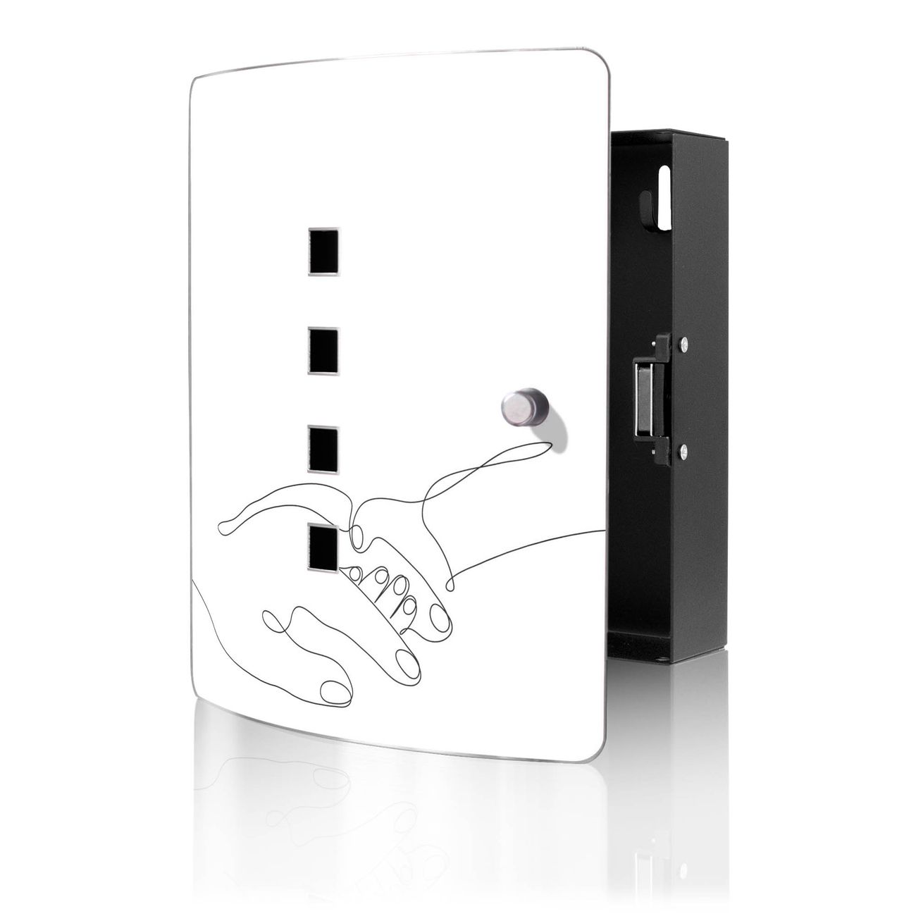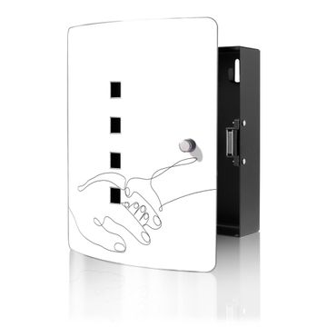 Funktion / Nutzen: Die leicht geschwungene Edelstahltür ist mit einer hochwertigen Motivfolie und dem Motiv Motiv Verbindung der Hände Lineart 2 kaschiert. Ein praktischer Magnetverschluss ermöglicht Ihnen ein schnelles Öffnen und Schließen. Befestigt wird der Schlüsselkasten an 2 Stellen auf der Rückseite, passendes Montagematerial fügen wir bereits bei.
