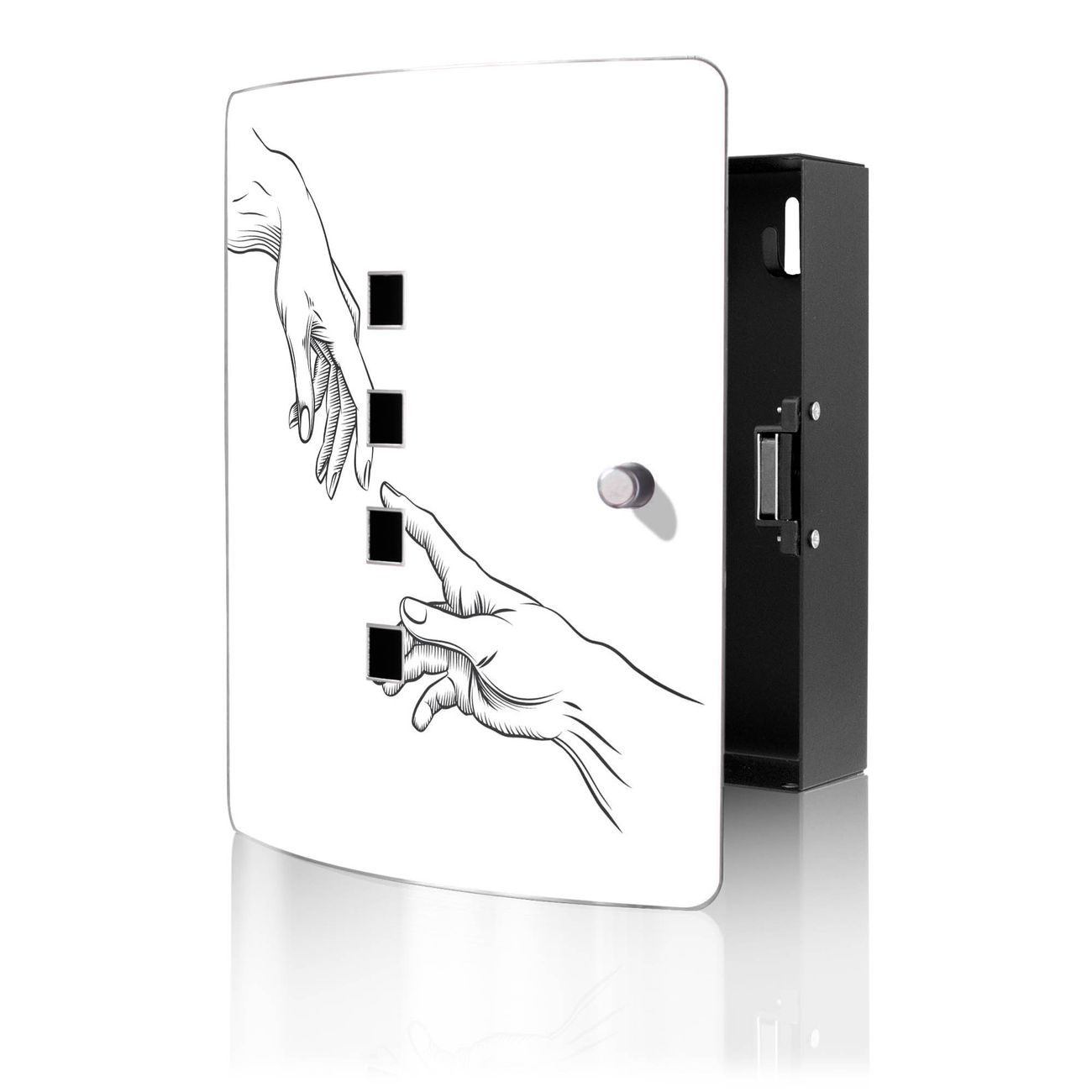 Funktion / Nutzen: Die leicht geschwungene Edelstahltür ist mit einer hochwertigen Motivfolie und dem Motiv Motiv Verbindung der Hände kaschiert. Ein praktischer Magnetverschluss ermöglicht Ihnen ein schnelles Öffnen und Schließen. Befestigt wird der Schlüsselkasten an 2 Stellen auf der Rückseite, passendes Montagematerial fügen wir bereits bei.