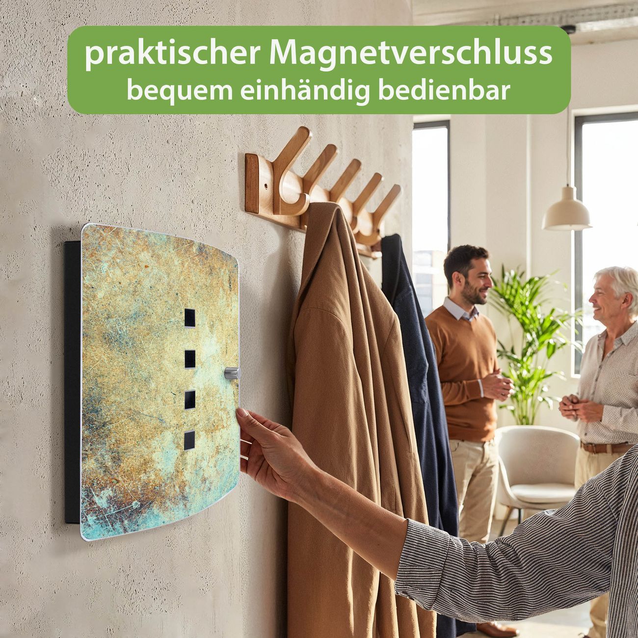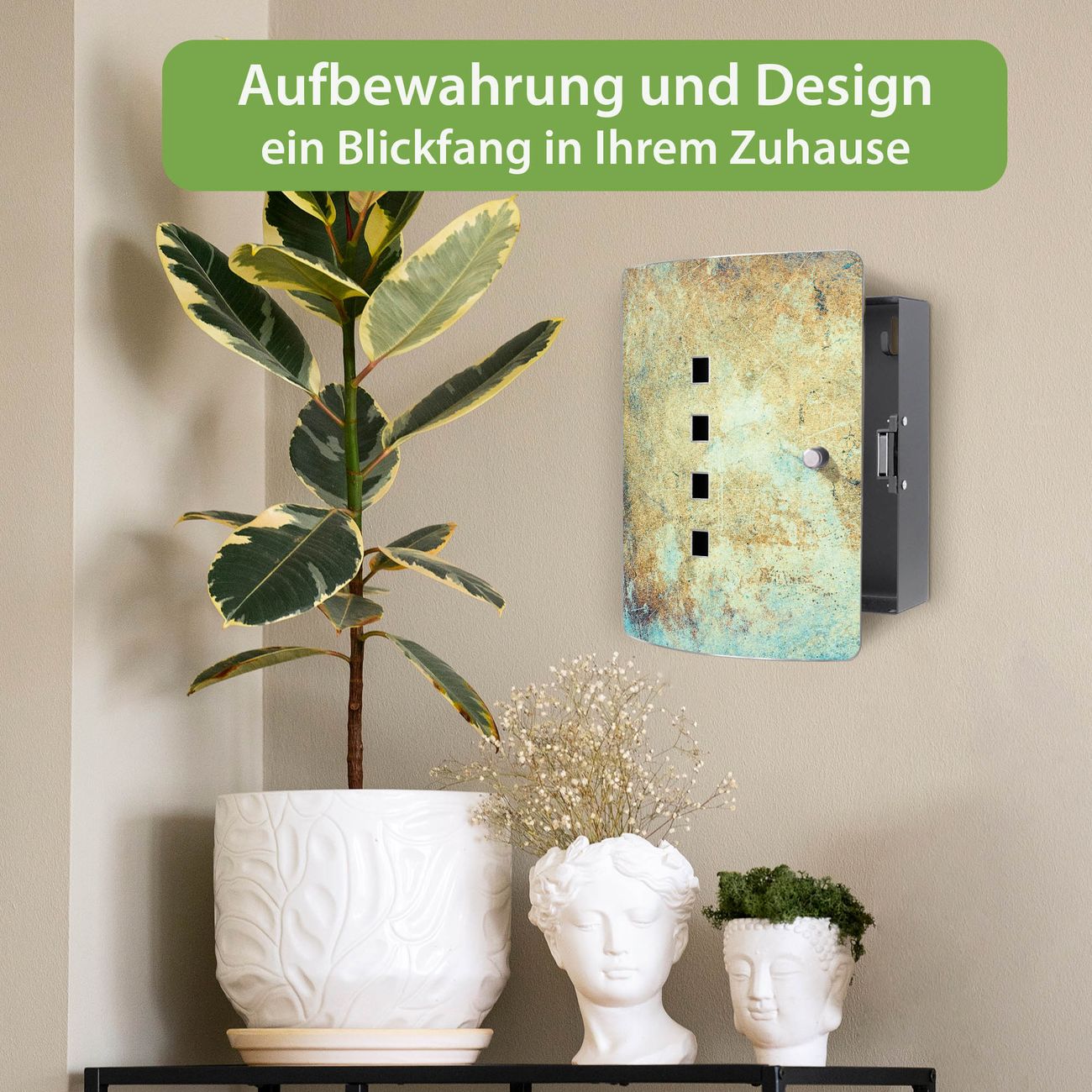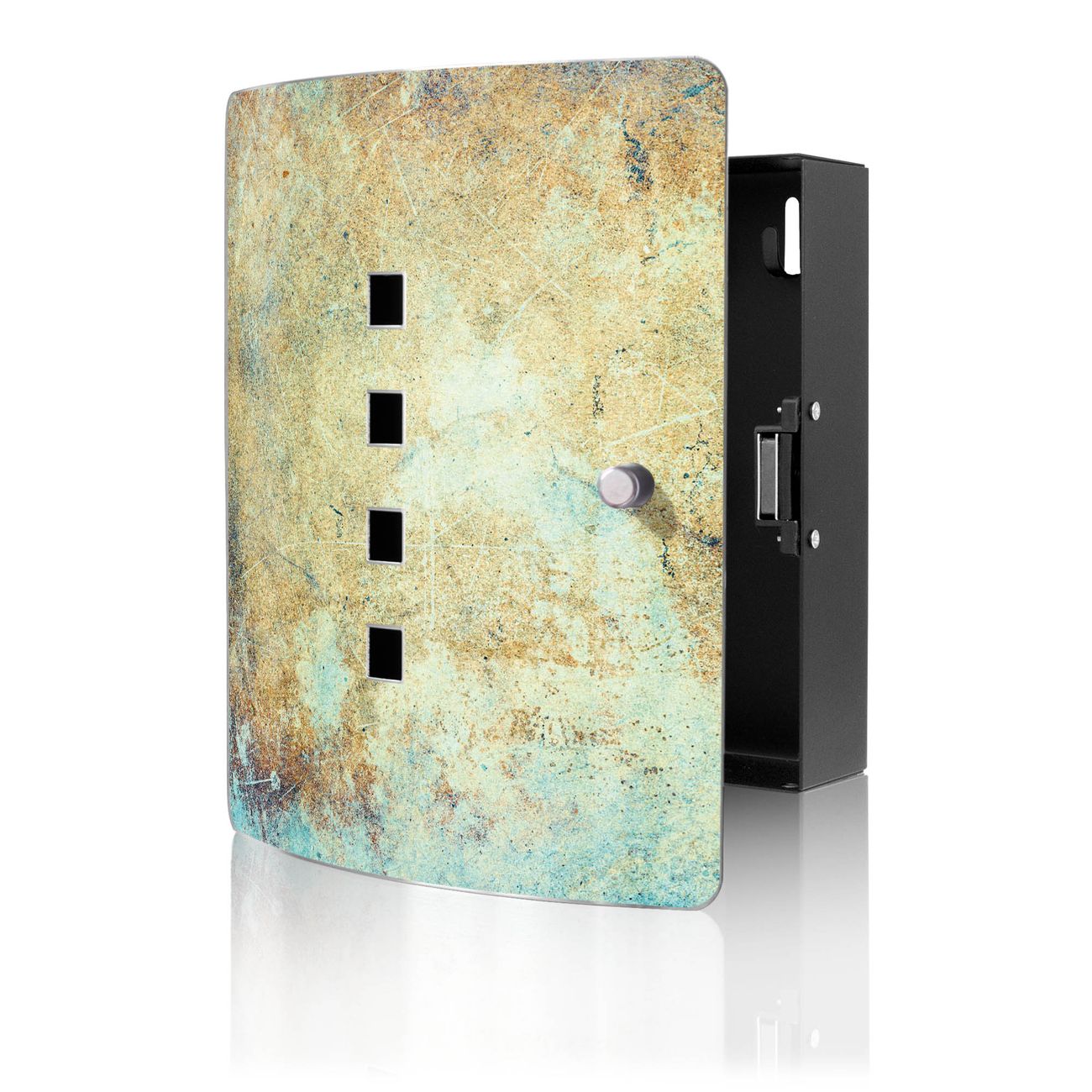 Funktion / Nutzen: Die leicht geschwungene Edelstahltür ist mit einer hochwertigen Motivfolie und dem Motiv Motiv Verwitterte Patina kaschiert. Ein praktischer Magnetverschluss ermöglicht Ihnen ein schnelles Öffnen und Schließen. Befestigt wird der Schlüsselkasten an 2 Stellen auf der Rückseite, passendes Montagematerial fügen wir bereits bei.