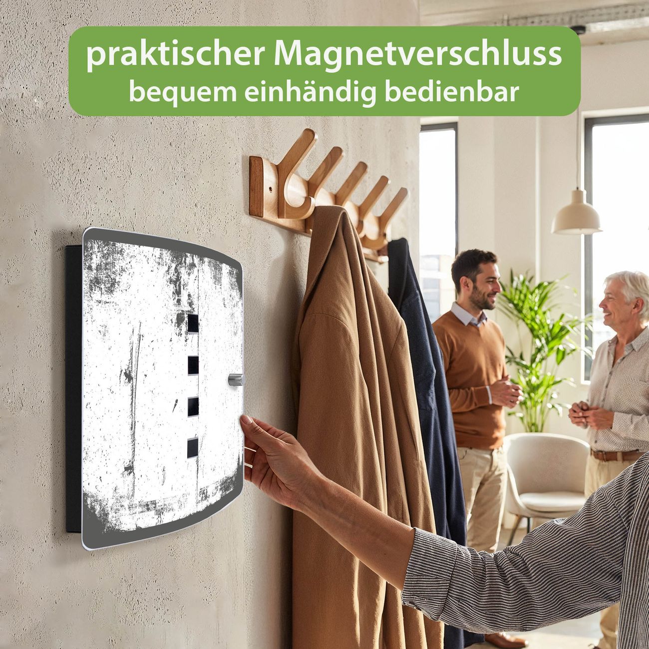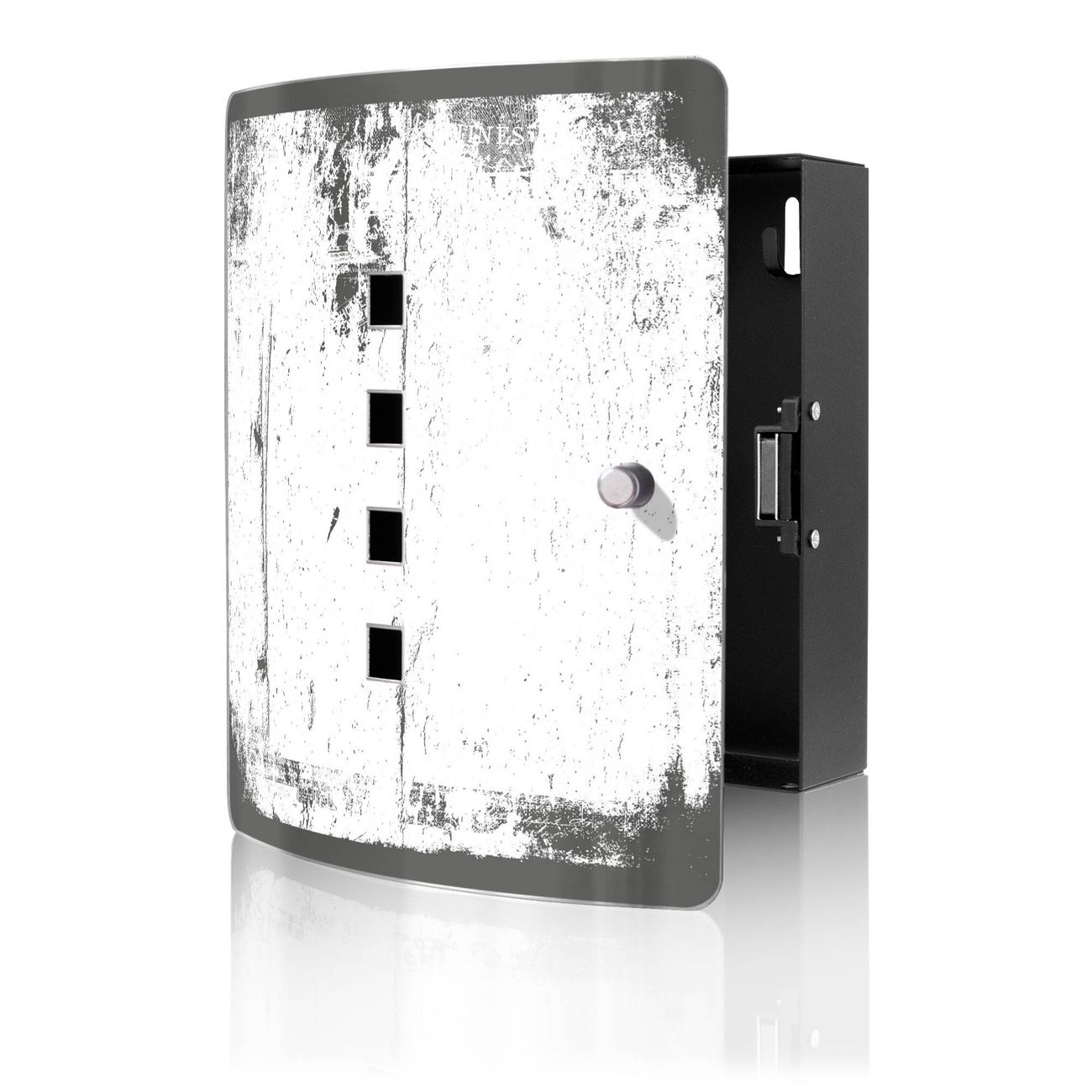 Funktion / Nutzen: Die leicht geschwungene Edelstahltür ist mit einer hochwertigen Motivfolie und dem Motiv Motiv Verwitterte Wand kaschiert. Ein praktischer Magnetverschluss ermöglicht Ihnen ein schnelles Öffnen und Schließen. Befestigt wird der Schlüsselkasten an 2 Stellen auf der Rückseite, passendes Montagematerial fügen wir bereits bei.