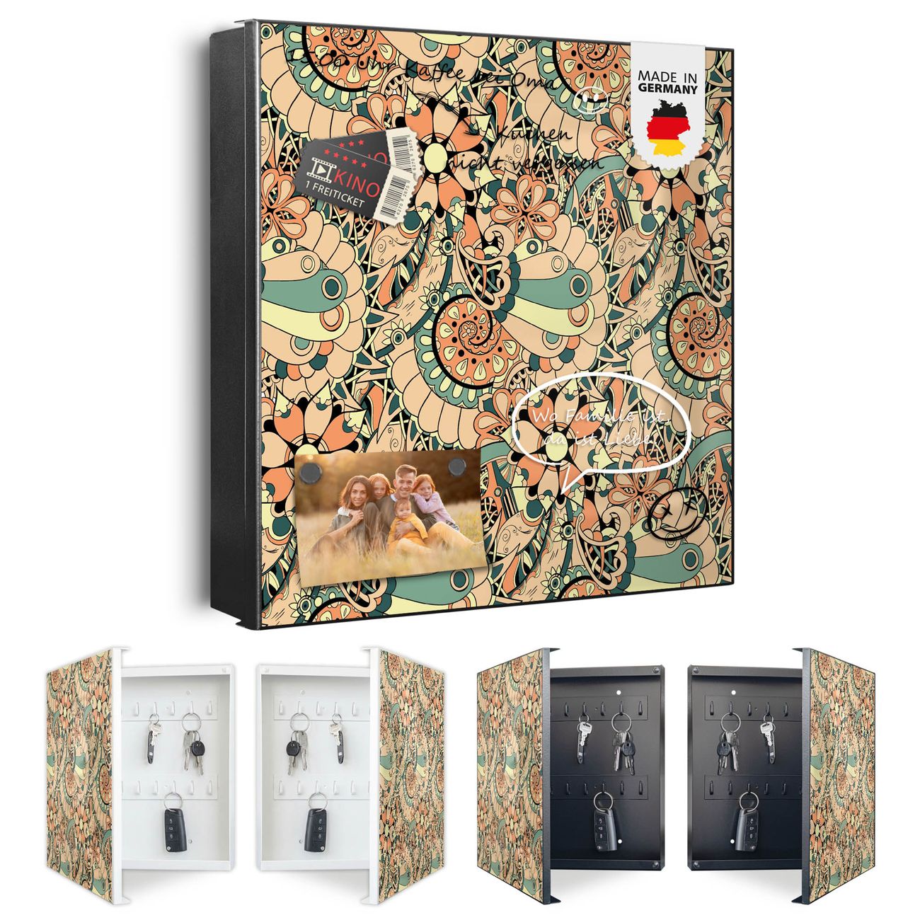 Bringe Ordnung und Eleganz in deinen Eingangsbereich mit dem banjado Schlüsselkasten Motiv Motiv Vintage Flower 3. Die moderne Schlüsselbox kombiniert funktionales Design mit hochwertiger Verarbeitung und wird so zu einem echten Hingucker in Flur, Büro oder Ferienwohnung. ✅ Stilvolle Schlüsselaufbewahrung mit Motiv Motiv Vintage Flower 3 Der Design-Schlüsselkasten Motiv Motiv Vintage Flower 3 bietet Platz für bis zu 32 Schlüssel, die auf 4 stabilen Reihen mit je 8 Haken übersichtlich verstaut werden. Mit seinen kompakten Maßen von 30 x 30 x 5 cm passt die Schlüsselbox perfekt auch in kleinere Räume. Der schwarz lackierte Stahlkorpus mit rechts angeschlagenem Türscharnier harmoniert mit gedruckten Folie auf der Front und fügt sich nahtlos in jedes Wohnambiente ein. Ob als Schlüsselorganizer für Zuhause oder als praktische Lösung für Büros, Praxen und Gewerbe, der banjado Schlüsselkasten sorgt für Ordnung und Übersicht. Dank der magnetischen, mit Kreidestiften beschreibbaren Folie auf der Front kannst du Notizen anheften oder Termine direkt auf der Oberfläche festhalten. Die Schlüsselbox Motiv Motiv Vintage Flower 3 zur Wandmontage wird inklusive Befestigungsmaterial geliefert und ist schnell angebracht. So hast du deine Schlüssel jederzeit griffbereit und zugleich stilvoll verstaut. Mit diesem banjado Schlüsselkasten Motiv Motiv Vintage Flower 3 kombinierst du praktische Aufbewahrung mit stilvollem Wohndesign. Ob privat oder geschäftlich, die Schlüsselbox sorgt für mehr Ordnung, Übersicht und ein wohnliches Ambiente.Vorteile im Überblick