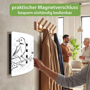 Funktion / Nutzen: Die leicht geschwungene Edelstahltür ist mit einer hochwertigen Motivfolie und dem Motiv Motiv Vogel auf Blütenzweig kaschiert. Ein praktischer Magnetverschluss ermöglicht Ihnen ein schnelles Öffnen und Schließen. Befestigt wird der Schlüsselkasten an 2 Stellen auf der Rückseite, passendes Montagematerial fügen wir bereits bei.