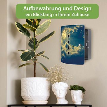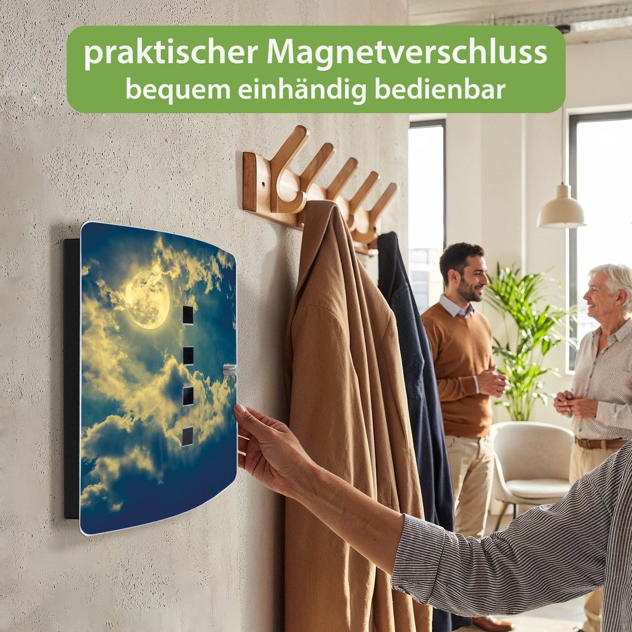 Funktion / Nutzen: Die leicht geschwungene Edelstahltür ist mit einer hochwertigen Motivfolie und dem Motiv Motiv Vollmond 2 kaschiert. Ein praktischer Magnetverschluss ermöglicht Ihnen ein schnelles Öffnen und Schließen. Befestigt wird der Schlüsselkasten an 2 Stellen auf der Rückseite, passendes Montagematerial fügen wir bereits bei.