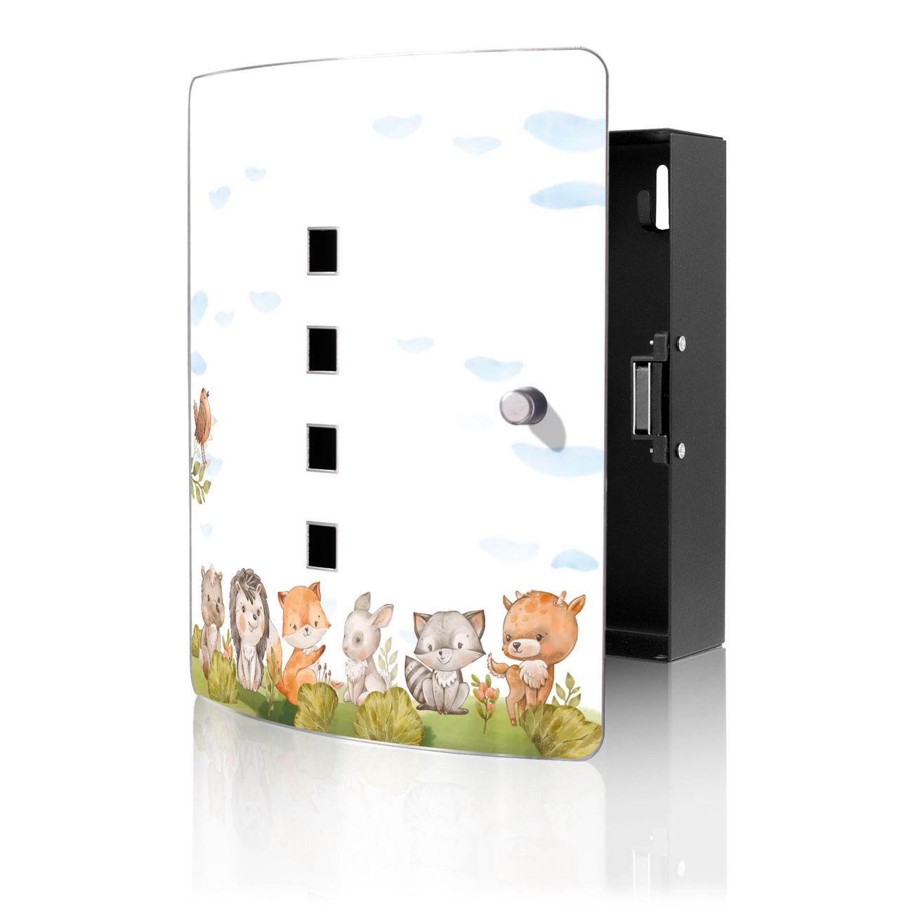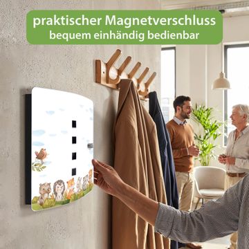 Funktion / Nutzen: Die leicht geschwungene Edelstahltür ist mit einer hochwertigen Motivfolie und dem Motiv Motiv Waldfreunde 2 kaschiert. Ein praktischer Magnetverschluss ermöglicht Ihnen ein schnelles Öffnen und Schließen. Befestigt wird der Schlüsselkasten an 2 Stellen auf der Rückseite, passendes Montagematerial fügen wir bereits bei.