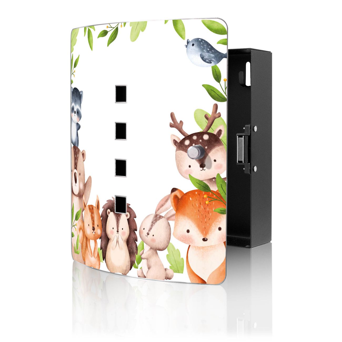 Funktion / Nutzen: Die leicht geschwungene Edelstahltür ist mit einer hochwertigen Motivfolie und dem Motiv Motiv Waldtier Freunde 2 kaschiert. Ein praktischer Magnetverschluss ermöglicht Ihnen ein schnelles Öffnen und Schließen. Befestigt wird der Schlüsselkasten an 2 Stellen auf der Rückseite, passendes Montagematerial fügen wir bereits bei.