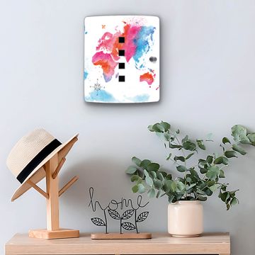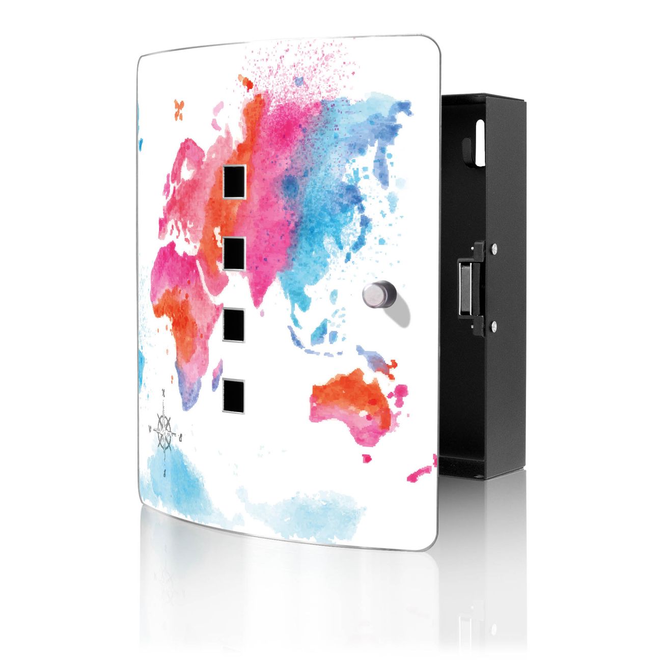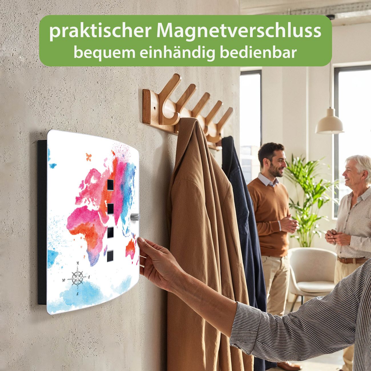 Funktion / Nutzen: Die leicht geschwungene Edelstahltür ist mit einer hochwertigen Motivfolie und dem Motiv Motiv Weltkarte pastell kaschiert. Ein praktischer Magnetverschluss ermöglicht Ihnen ein schnelles Öffnen und Schließen. Befestigt wird der Schlüsselkasten an 2 Stellen auf der Rückseite, passendes Montagematerial fügen wir bereits bei.
