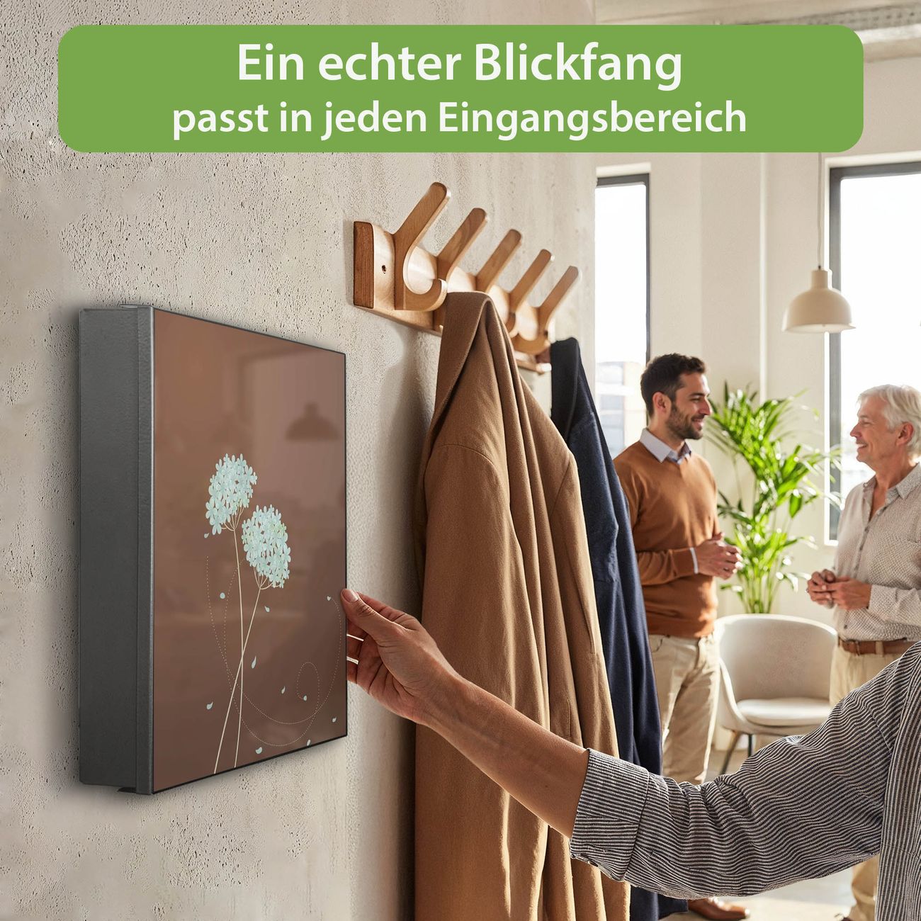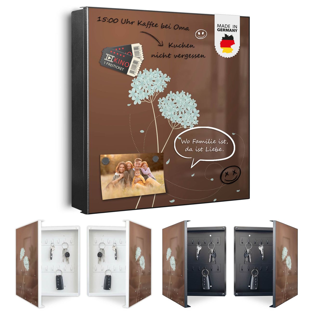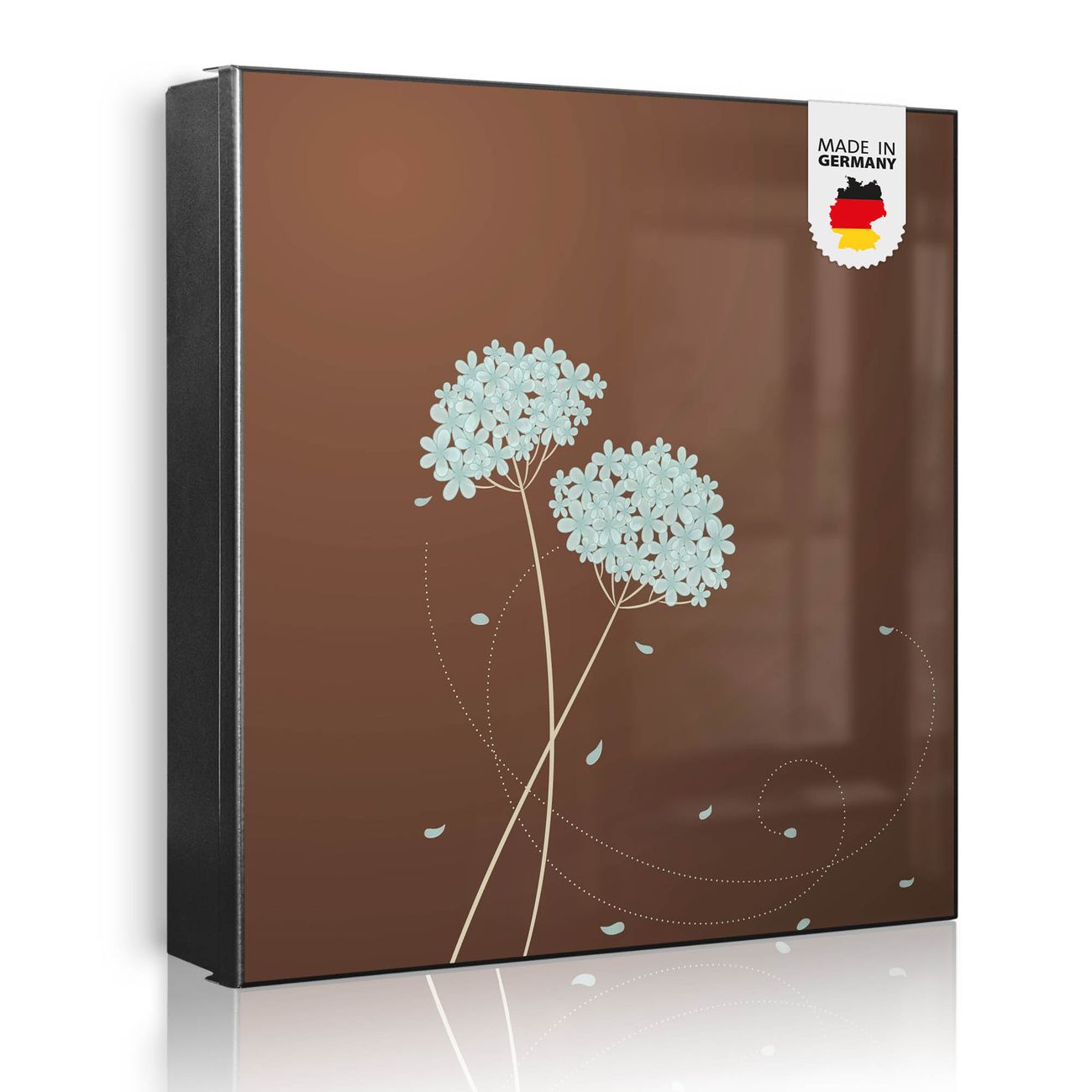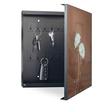 Bringe Ordnung und Eleganz in deinen Eingangsbereich mit dem banjado Schlüsselkasten Motiv Motiv WT Blaue Hortensie. Die moderne Schlüsselbox kombiniert funktionales Design mit hochwertiger Verarbeitung und wird so zu einem echten Hingucker in Flur, Büro oder Ferienwohnung. ✅ Stilvolle Schlüsselaufbewahrung mit Motiv Motiv WT Blaue Hortensie Der Design-Schlüsselkasten Motiv Motiv WT Blaue Hortensie bietet Platz für bis zu 32 Schlüssel, die auf 4 stabilen Reihen mit je 8 Haken übersichtlich verstaut werden. Mit seinen kompakten Maßen von 30 x 30 x 5 cm passt die Schlüsselbox perfekt auch in kleinere Räume. Der schwarz lackierte Stahlkorpus mit rechts angeschlagenem Türscharnier harmoniert mit gedruckten Folie auf der Front und fügt sich nahtlos in jedes Wohnambiente ein. Ob als Schlüsselorganizer für Zuhause oder als praktische Lösung für Büros, Praxen und Gewerbe, der banjado Schlüsselkasten sorgt für Ordnung und Übersicht. Dank der magnetischen, mit Kreidestiften beschreibbaren Folie auf der Front kannst du Notizen anheften oder Termine direkt auf der Oberfläche festhalten. Die Schlüsselbox Motiv Motiv WT Blaue Hortensie zur Wandmontage wird inklusive Befestigungsmaterial geliefert und ist schnell angebracht. So hast du deine Schlüssel jederzeit griffbereit und zugleich stilvoll verstaut. Mit diesem banjado Schlüsselkasten Motiv Motiv WT Blaue Hortensie kombinierst du praktische Aufbewahrung mit stilvollem Wohndesign. Ob privat oder geschäftlich, die Schlüsselbox sorgt für mehr Ordnung, Übersicht und ein wohnliches Ambiente.Vorteile im Überblick
