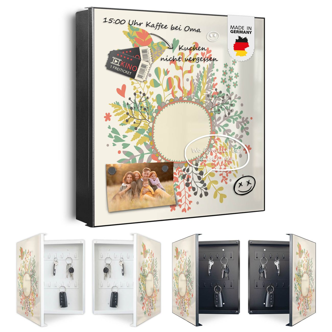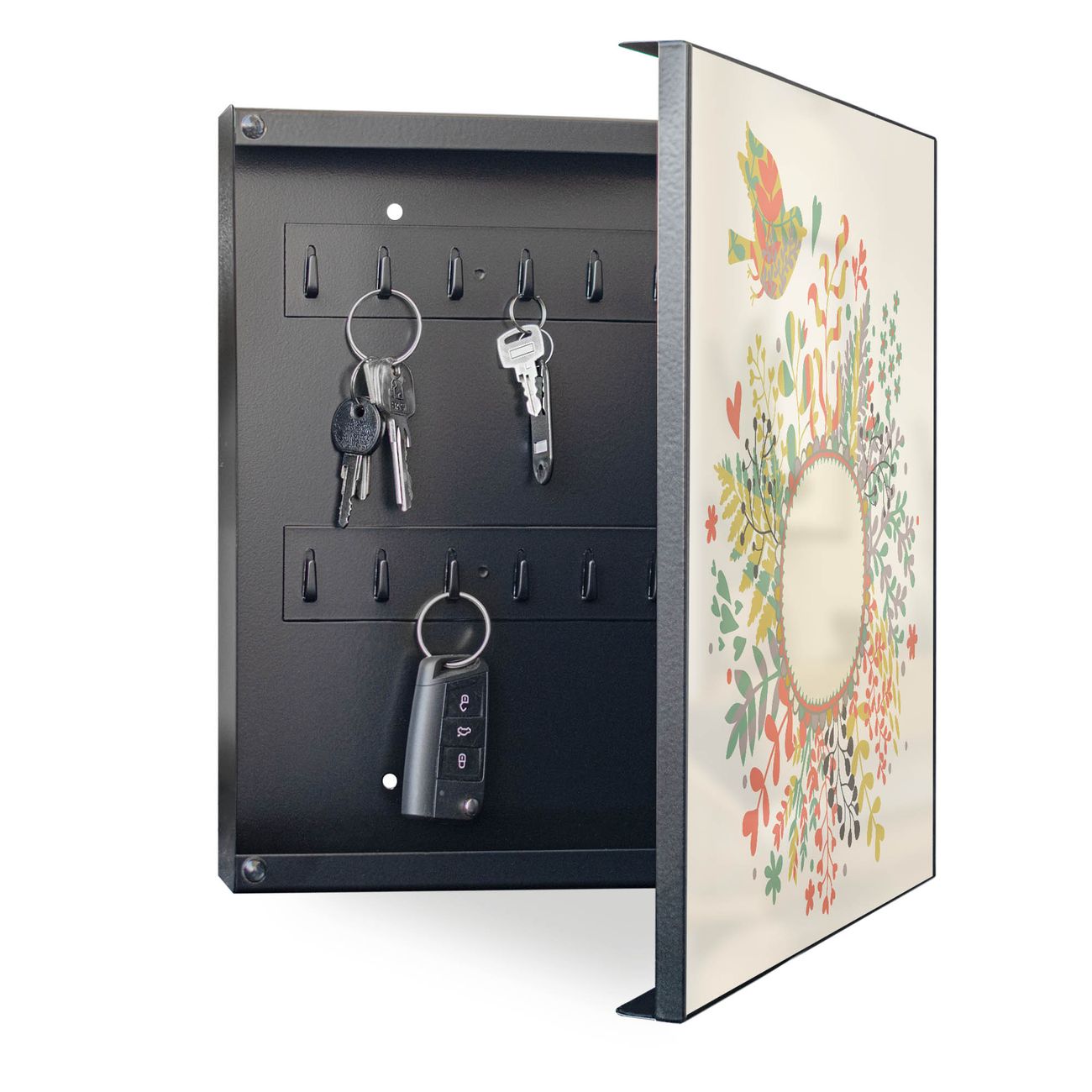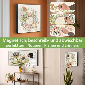 Bringe Ordnung und Eleganz in deinen Eingangsbereich mit dem banjado Schlüsselkasten Motiv Motiv WT Frühling. Die moderne Schlüsselbox kombiniert funktionales Design mit hochwertiger Verarbeitung und wird so zu einem echten Hingucker in Flur, Büro oder Ferienwohnung. ✅ Stilvolle Schlüsselaufbewahrung mit Motiv Motiv WT Frühling Der Design-Schlüsselkasten Motiv Motiv WT Frühling bietet Platz für bis zu 32 Schlüssel, die auf 4 stabilen Reihen mit je 8 Haken übersichtlich verstaut werden. Mit seinen kompakten Maßen von 30 x 30 x 5 cm passt die Schlüsselbox perfekt auch in kleinere Räume. Der schwarz lackierte Stahlkorpus mit rechts angeschlagenem Türscharnier harmoniert mit gedruckten Folie auf der Front und fügt sich nahtlos in jedes Wohnambiente ein. Ob als Schlüsselorganizer für Zuhause oder als praktische Lösung für Büros, Praxen und Gewerbe, der banjado Schlüsselkasten sorgt für Ordnung und Übersicht. Dank der magnetischen, mit Kreidestiften beschreibbaren Folie auf der Front kannst du Notizen anheften oder Termine direkt auf der Oberfläche festhalten. Die Schlüsselbox Motiv Motiv WT Frühling zur Wandmontage wird inklusive Befestigungsmaterial geliefert und ist schnell angebracht. So hast du deine Schlüssel jederzeit griffbereit und zugleich stilvoll verstaut. Mit diesem banjado Schlüsselkasten Motiv Motiv WT Frühling kombinierst du praktische Aufbewahrung mit stilvollem Wohndesign. Ob privat oder geschäftlich, die Schlüsselbox sorgt für mehr Ordnung, Übersicht und ein wohnliches Ambiente.Vorteile im Überblick