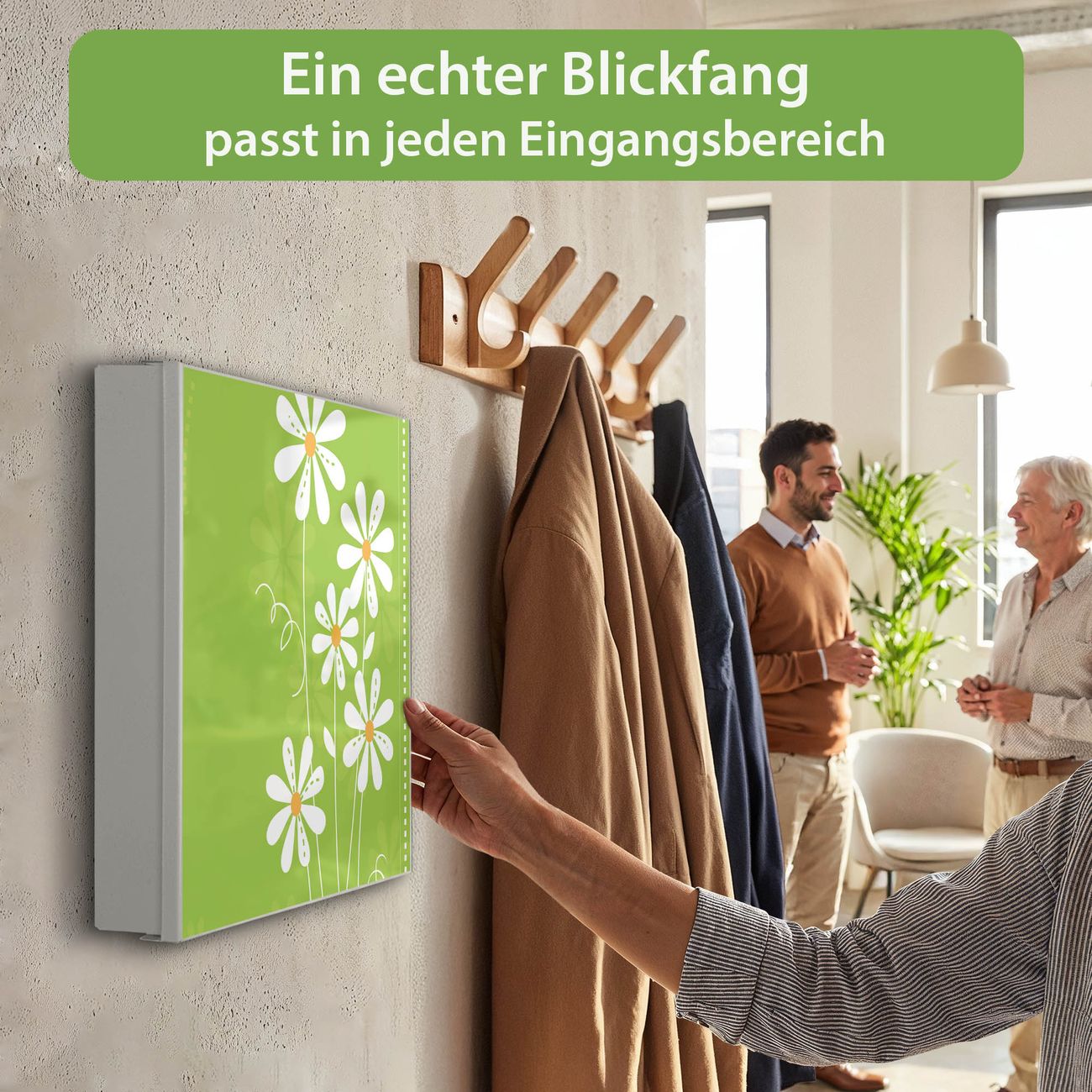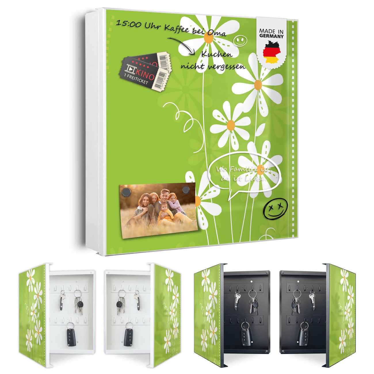 Bringe Ordnung und Eleganz in deinen Eingangsbereich mit dem banjado Schlüsselkasten Motiv Motiv WT Gänseblümchen. Die moderne Schlüsselbox kombiniert funktionales Design mit hochwertiger Verarbeitung und wird so zu einem echten Hingucker in Flur, Büro oder Ferienwohnung. ✅ Stilvolle Schlüsselaufbewahrung mit Motiv Motiv WT Gänseblümchen Der Design-Schlüsselkasten Motiv Motiv WT Gänseblümchen bietet Platz für bis zu 32 Schlüssel, die auf 4 stabilen Reihen mit je 8 Haken übersichtlich verstaut werden. Mit seinen kompakten Maßen von 30 x 30 x 5 cm passt die Schlüsselbox perfekt auch in kleinere Räume. Der weiß lackierte Stahlkorpus mit rechts angeschlagenem Türscharnier harmoniert mit gedruckten Folie auf der Front und fügt sich nahtlos in jedes Wohnambiente ein. Ob als Schlüsselorganizer für Zuhause oder als praktische Lösung für Büros, Praxen und Gewerbe, der banjado Schlüsselkasten sorgt für Ordnung und Übersicht. Dank der magnetischen, mit Kreidestiften beschreibbaren Folie auf der Front kannst du Notizen anheften oder Termine direkt auf der Oberfläche festhalten. Die Schlüsselbox Motiv Motiv WT Gänseblümchen zur Wandmontage wird inklusive Befestigungsmaterial geliefert und ist schnell angebracht. So hast du deine Schlüssel jederzeit griffbereit und zugleich stilvoll verstaut. Mit diesem banjado Schlüsselkasten Motiv Motiv WT Gänseblümchen kombinierst du praktische Aufbewahrung mit stilvollem Wohndesign. Ob privat oder geschäftlich, die Schlüsselbox sorgt für mehr Ordnung, Übersicht und ein wohnliches Ambiente.Vorteile im Überblick