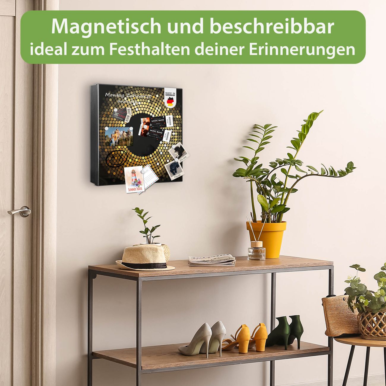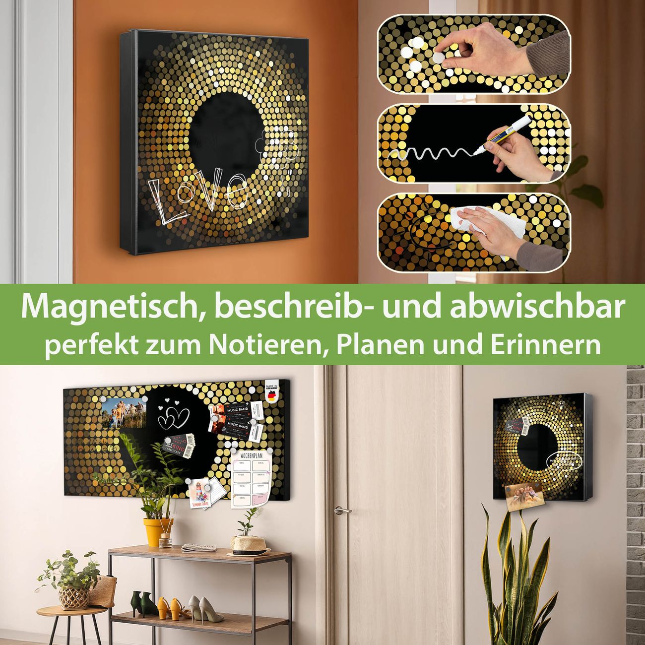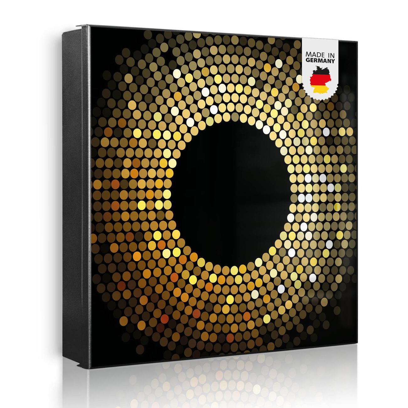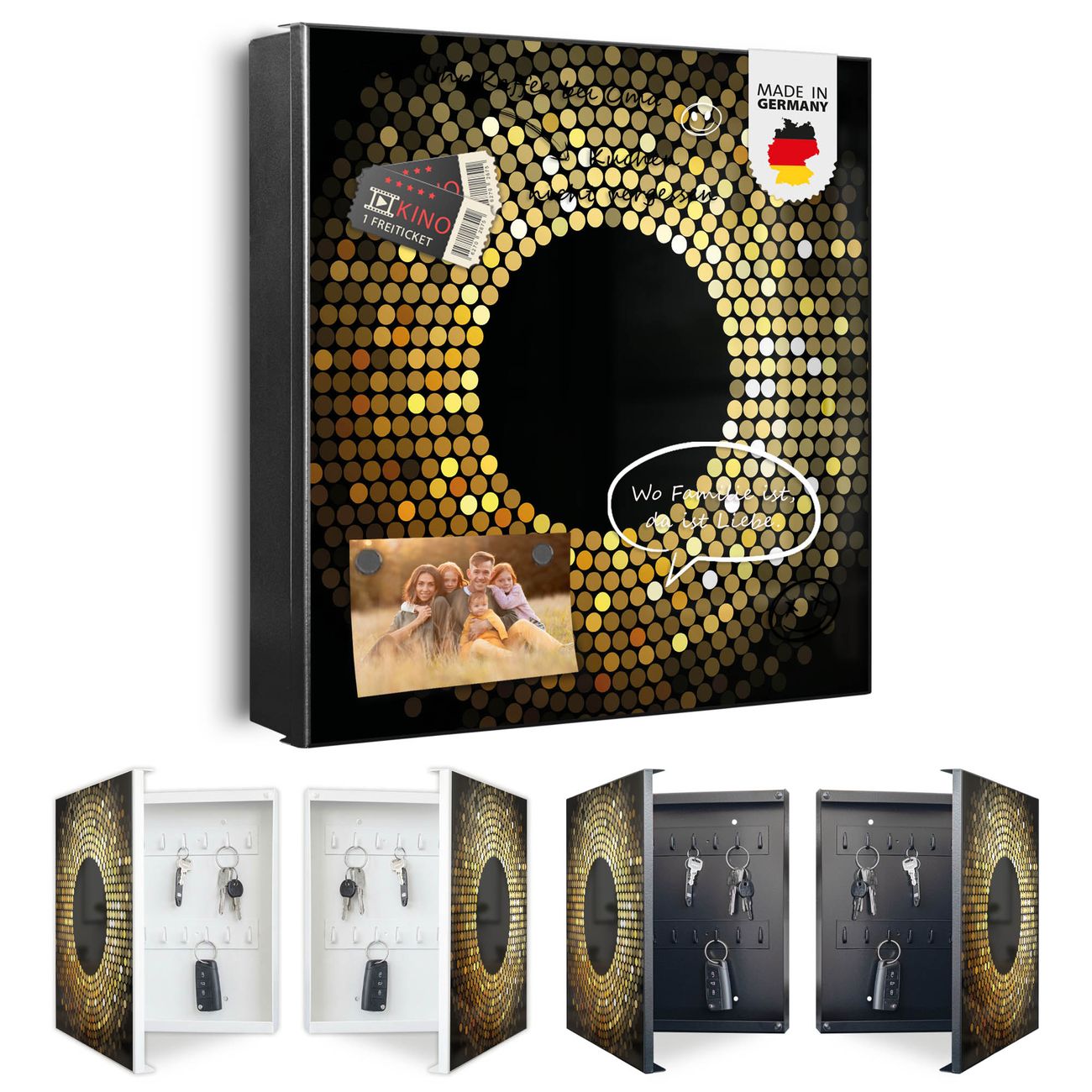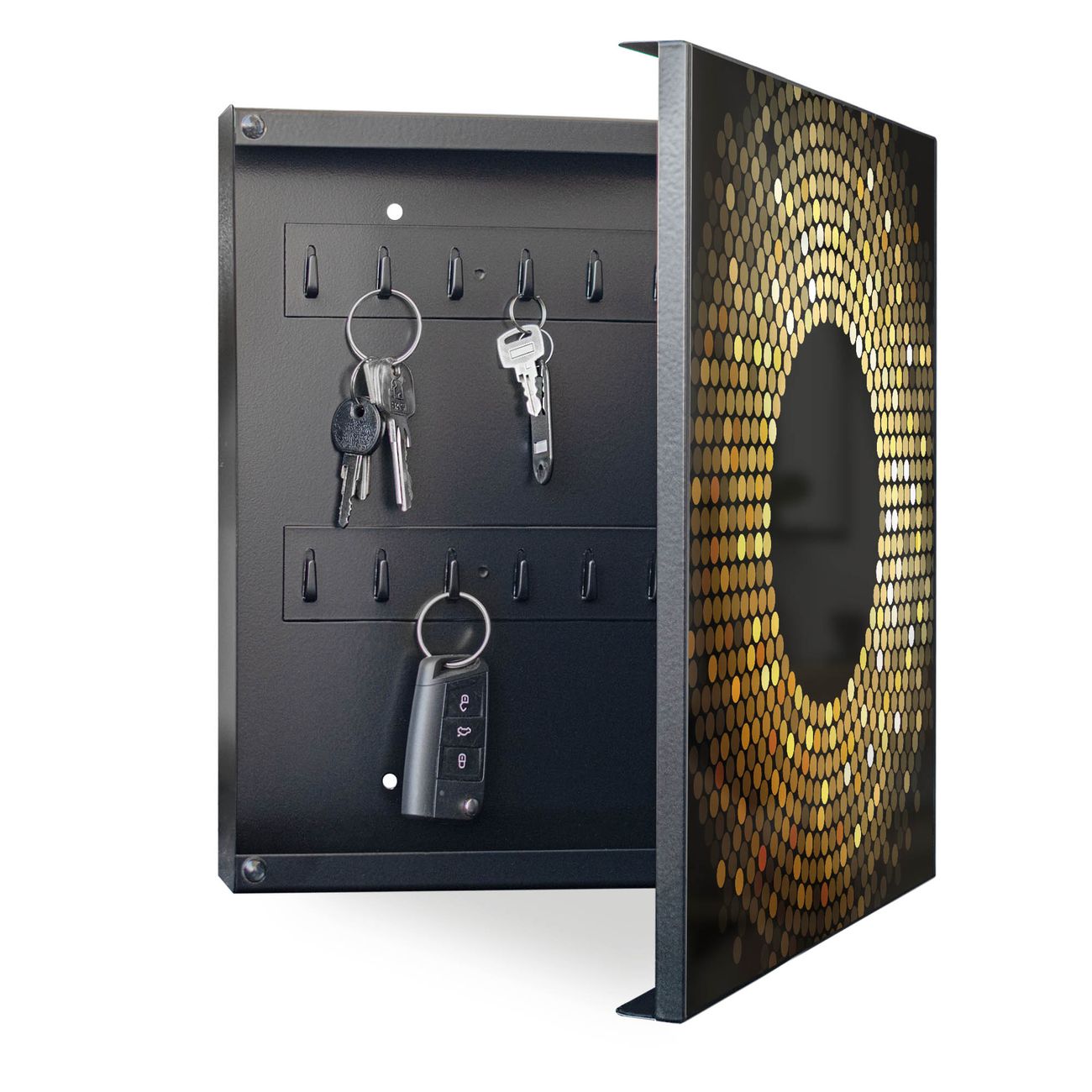 Bringe Ordnung und Eleganz in deinen Eingangsbereich mit dem banjado Schlüsselkasten Motiv Motiv WT Gold Disco. Die moderne Schlüsselbox kombiniert funktionales Design mit hochwertiger Verarbeitung und wird so zu einem echten Hingucker in Flur, Büro oder Ferienwohnung. ✅ Stilvolle Schlüsselaufbewahrung mit Motiv Motiv WT Gold Disco Der Design-Schlüsselkasten Motiv Motiv WT Gold Disco bietet Platz für bis zu 32 Schlüssel, die auf 4 stabilen Reihen mit je 8 Haken übersichtlich verstaut werden. Mit seinen kompakten Maßen von 30 x 30 x 5 cm passt die Schlüsselbox perfekt auch in kleinere Räume. Der schwarz lackierte Stahlkorpus mit rechts angeschlagenem Türscharnier harmoniert mit gedruckten Folie auf der Front und fügt sich nahtlos in jedes Wohnambiente ein. Ob als Schlüsselorganizer für Zuhause oder als praktische Lösung für Büros, Praxen und Gewerbe, der banjado Schlüsselkasten sorgt für Ordnung und Übersicht. Dank der magnetischen, mit Kreidestiften beschreibbaren Folie auf der Front kannst du Notizen anheften oder Termine direkt auf der Oberfläche festhalten. Die Schlüsselbox Motiv Motiv WT Gold Disco zur Wandmontage wird inklusive Befestigungsmaterial geliefert und ist schnell angebracht. So hast du deine Schlüssel jederzeit griffbereit und zugleich stilvoll verstaut. Mit diesem banjado Schlüsselkasten Motiv Motiv WT Gold Disco kombinierst du praktische Aufbewahrung mit stilvollem Wohndesign. Ob privat oder geschäftlich, die Schlüsselbox sorgt für mehr Ordnung, Übersicht und ein wohnliches Ambiente.Vorteile im Überblick