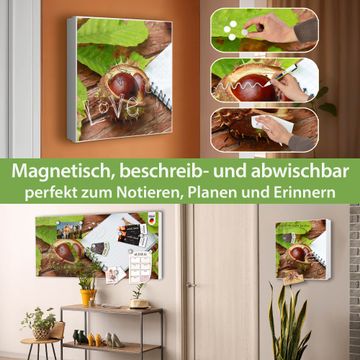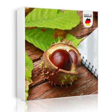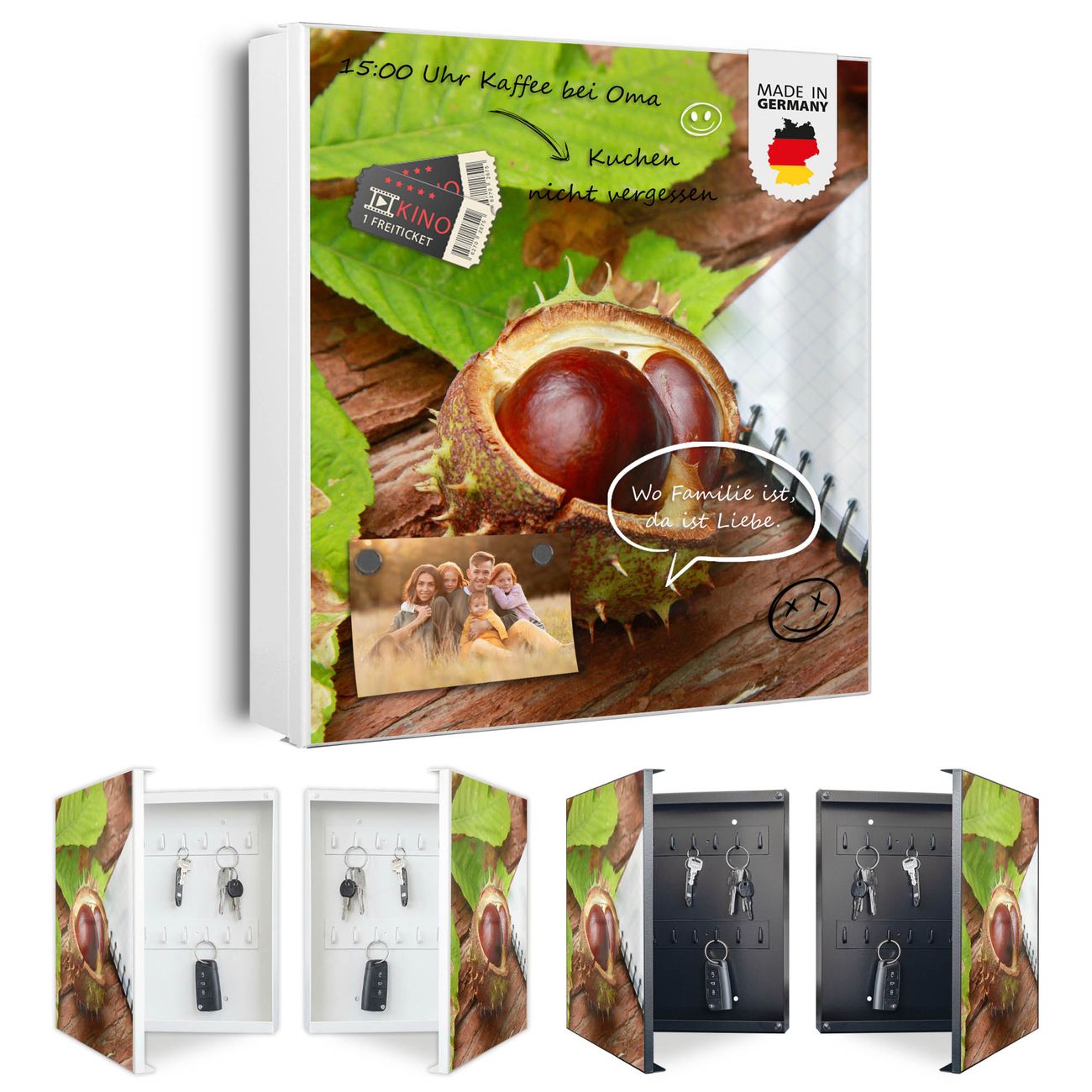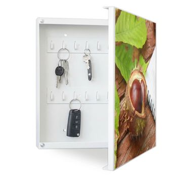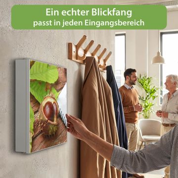 Bringe Ordnung und Eleganz in deinen Eingangsbereich mit dem banjado Schlüsselkasten Motiv Motiv WT Kastanie. Die moderne Schlüsselbox kombiniert funktionales Design mit hochwertiger Verarbeitung und wird so zu einem echten Hingucker in Flur, Büro oder Ferienwohnung. ✅ Stilvolle Schlüsselaufbewahrung mit Motiv Motiv WT Kastanie Der Design-Schlüsselkasten Motiv Motiv WT Kastanie bietet Platz für bis zu 32 Schlüssel, die auf 4 stabilen Reihen mit je 8 Haken übersichtlich verstaut werden. Mit seinen kompakten Maßen von 30 x 30 x 5 cm passt die Schlüsselbox perfekt auch in kleinere Räume. Der weiß lackierte Stahlkorpus mit rechts angeschlagenem Türscharnier harmoniert mit gedruckten Folie auf der Front und fügt sich nahtlos in jedes Wohnambiente ein. Ob als Schlüsselorganizer für Zuhause oder als praktische Lösung für Büros, Praxen und Gewerbe, der banjado Schlüsselkasten sorgt für Ordnung und Übersicht. Dank der magnetischen, mit Kreidestiften beschreibbaren Folie auf der Front kannst du Notizen anheften oder Termine direkt auf der Oberfläche festhalten. Die Schlüsselbox Motiv Motiv WT Kastanie zur Wandmontage wird inklusive Befestigungsmaterial geliefert und ist schnell angebracht. So hast du deine Schlüssel jederzeit griffbereit und zugleich stilvoll verstaut. Mit diesem banjado Schlüsselkasten Motiv Motiv WT Kastanie kombinierst du praktische Aufbewahrung mit stilvollem Wohndesign. Ob privat oder geschäftlich, die Schlüsselbox sorgt für mehr Ordnung, Übersicht und ein wohnliches Ambiente.Vorteile im Überblick