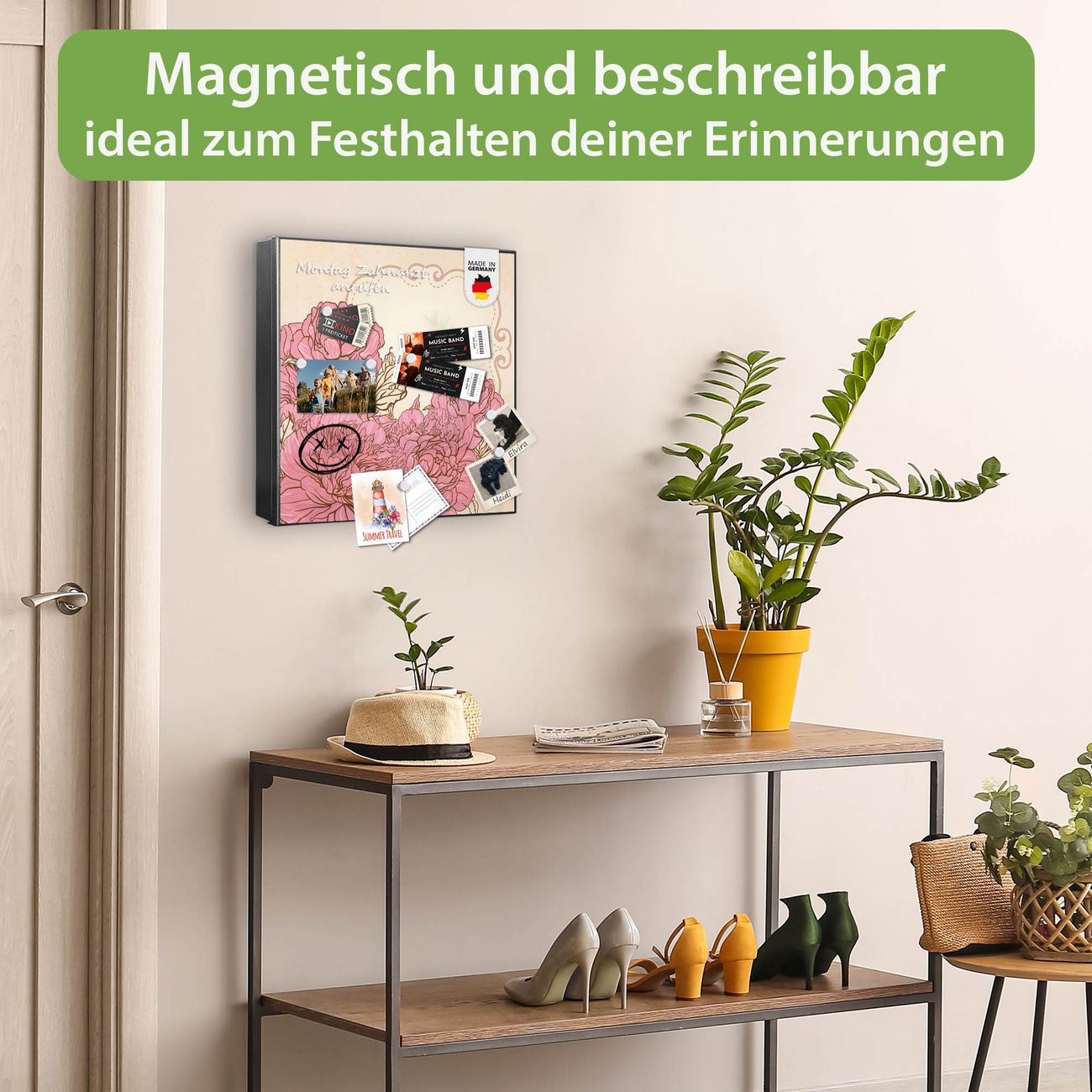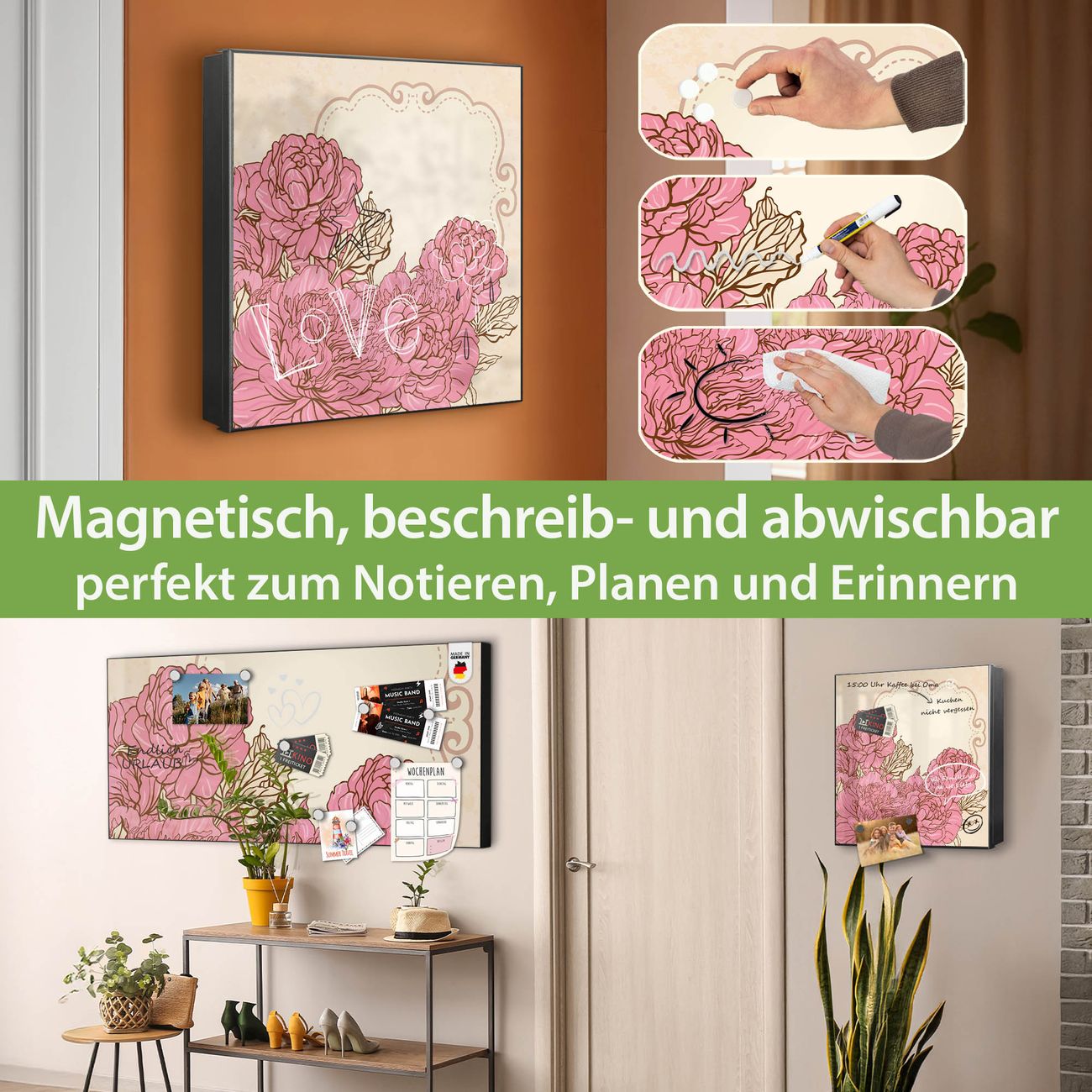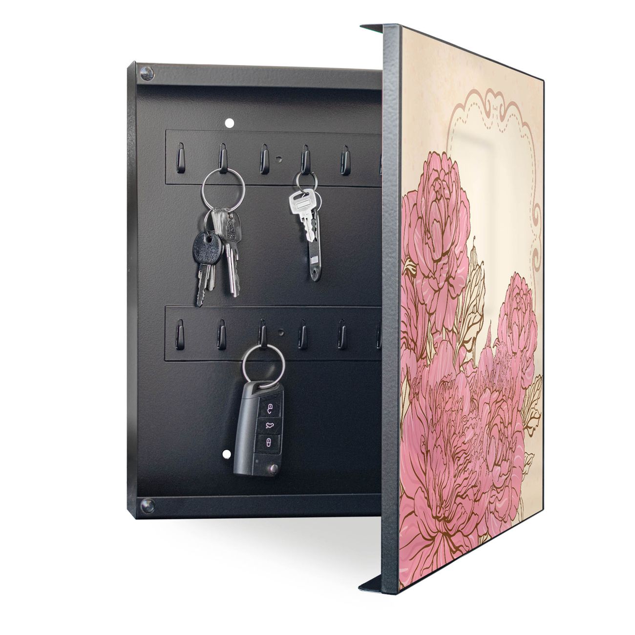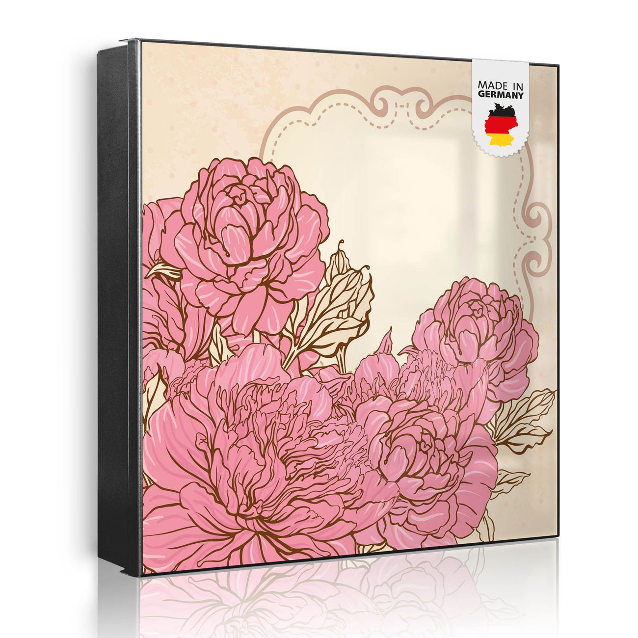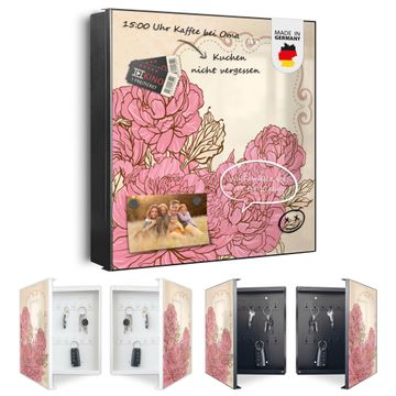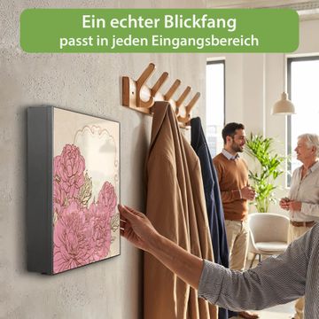 Bringe Ordnung und Eleganz in deinen Eingangsbereich mit dem banjado Schlüsselkasten Motiv Motiv WT Pfingstrose. Die moderne Schlüsselbox kombiniert funktionales Design mit hochwertiger Verarbeitung und wird so zu einem echten Hingucker in Flur, Büro oder Ferienwohnung. ✅ Stilvolle Schlüsselaufbewahrung mit Motiv Motiv WT Pfingstrose Der Design-Schlüsselkasten Motiv Motiv WT Pfingstrose bietet Platz für bis zu 32 Schlüssel, die auf 4 stabilen Reihen mit je 8 Haken übersichtlich verstaut werden. Mit seinen kompakten Maßen von 30 x 30 x 5 cm passt die Schlüsselbox perfekt auch in kleinere Räume. Der schwarz lackierte Stahlkorpus mit rechts angeschlagenem Türscharnier harmoniert mit gedruckten Folie auf der Front und fügt sich nahtlos in jedes Wohnambiente ein. Ob als Schlüsselorganizer für Zuhause oder als praktische Lösung für Büros, Praxen und Gewerbe, der banjado Schlüsselkasten sorgt für Ordnung und Übersicht. Dank der magnetischen, mit Kreidestiften beschreibbaren Folie auf der Front kannst du Notizen anheften oder Termine direkt auf der Oberfläche festhalten. Die Schlüsselbox Motiv Motiv WT Pfingstrose zur Wandmontage wird inklusive Befestigungsmaterial geliefert und ist schnell angebracht. So hast du deine Schlüssel jederzeit griffbereit und zugleich stilvoll verstaut. Mit diesem banjado Schlüsselkasten Motiv Motiv WT Pfingstrose kombinierst du praktische Aufbewahrung mit stilvollem Wohndesign. Ob privat oder geschäftlich, die Schlüsselbox sorgt für mehr Ordnung, Übersicht und ein wohnliches Ambiente.Vorteile im Überblick