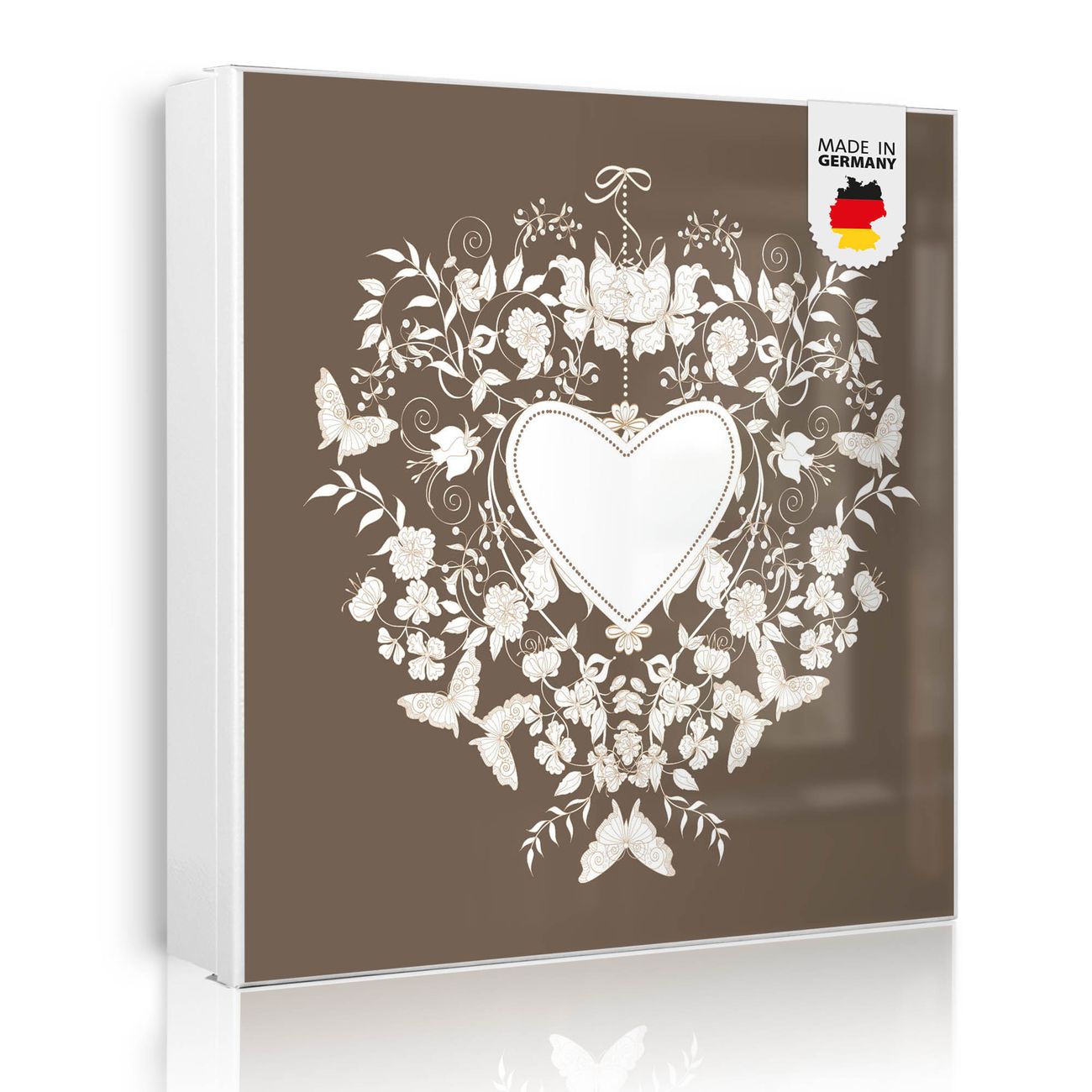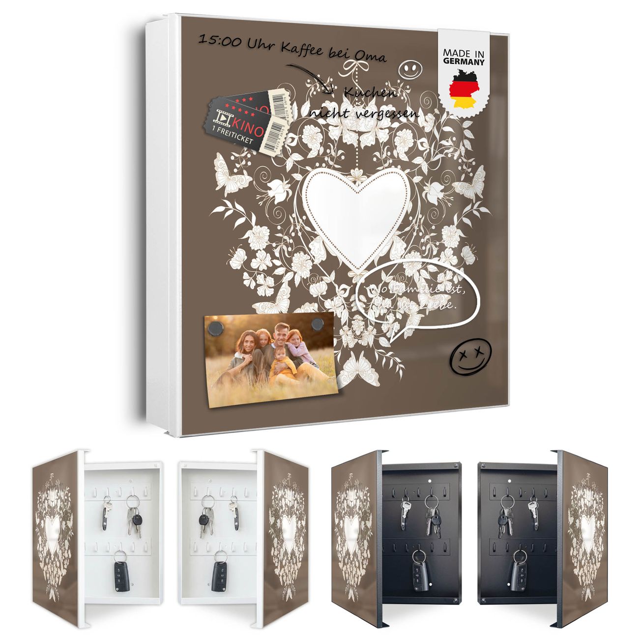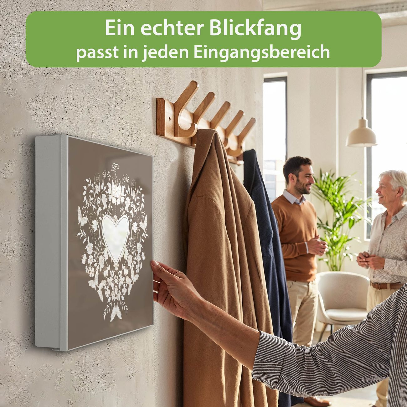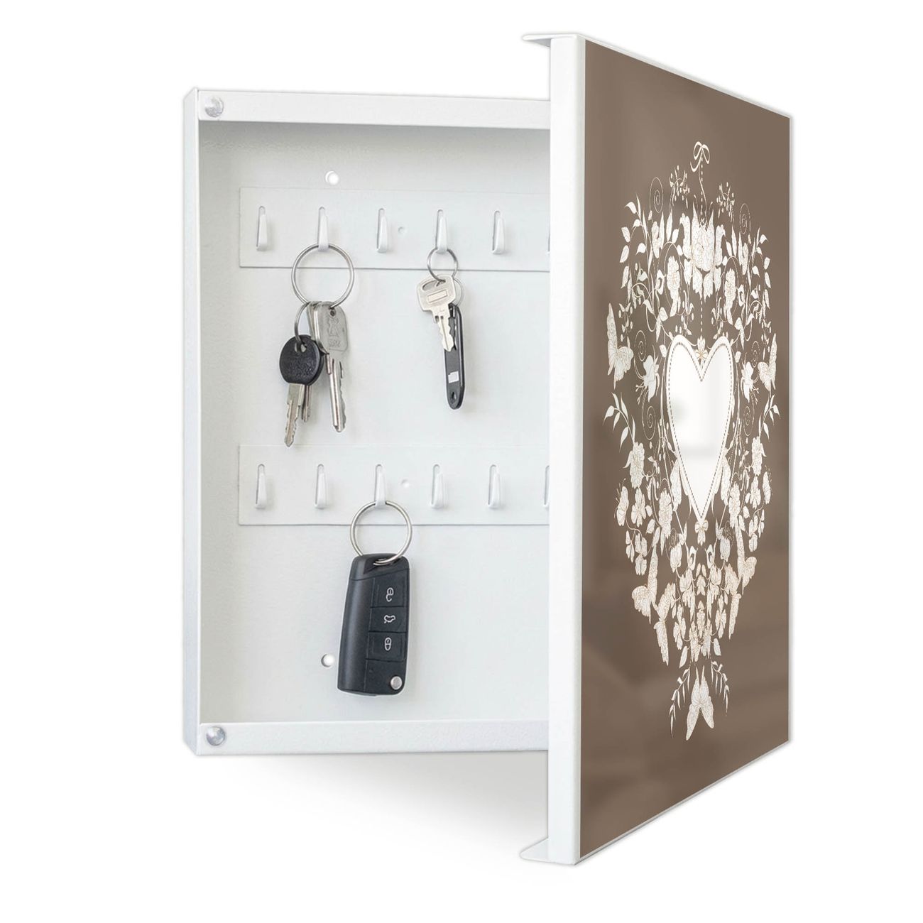 Bringe Ordnung und Eleganz in deinen Eingangsbereich mit dem banjado Schlüsselkasten Motiv Motiv WT Schmetterlinge. Die moderne Schlüsselbox kombiniert funktionales Design mit hochwertiger Verarbeitung und wird so zu einem echten Hingucker in Flur, Büro oder Ferienwohnung. ✅ Stilvolle Schlüsselaufbewahrung mit Motiv Motiv WT Schmetterlinge Der Design-Schlüsselkasten Motiv Motiv WT Schmetterlinge bietet Platz für bis zu 32 Schlüssel, die auf 4 stabilen Reihen mit je 8 Haken übersichtlich verstaut werden. Mit seinen kompakten Maßen von 30 x 30 x 5 cm passt die Schlüsselbox perfekt auch in kleinere Räume. Der weiß lackierte Stahlkorpus mit rechts angeschlagenem Türscharnier harmoniert mit gedruckten Folie auf der Front und fügt sich nahtlos in jedes Wohnambiente ein. Ob als Schlüsselorganizer für Zuhause oder als praktische Lösung für Büros, Praxen und Gewerbe, der banjado Schlüsselkasten sorgt für Ordnung und Übersicht. Dank der magnetischen, mit Kreidestiften beschreibbaren Folie auf der Front kannst du Notizen anheften oder Termine direkt auf der Oberfläche festhalten. Die Schlüsselbox Motiv Motiv WT Schmetterlinge zur Wandmontage wird inklusive Befestigungsmaterial geliefert und ist schnell angebracht. So hast du deine Schlüssel jederzeit griffbereit und zugleich stilvoll verstaut. Mit diesem banjado Schlüsselkasten Motiv Motiv WT Schmetterlinge kombinierst du praktische Aufbewahrung mit stilvollem Wohndesign. Ob privat oder geschäftlich, die Schlüsselbox sorgt für mehr Ordnung, Übersicht und ein wohnliches Ambiente.Vorteile im Überblick
