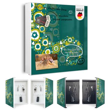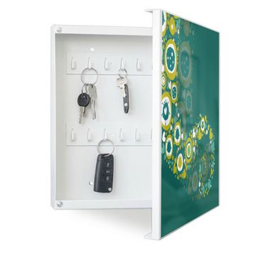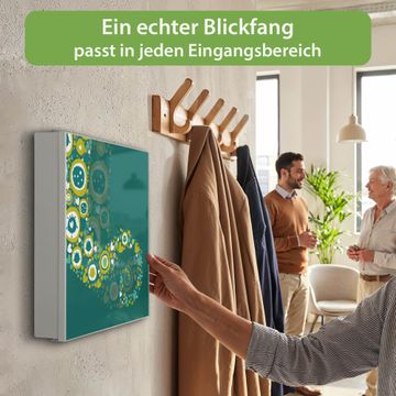 Bringe Ordnung und Eleganz in deinen Eingangsbereich mit dem banjado Schlüsselkasten Motiv Motiv WT Strömende Herzen. Die moderne Schlüsselbox kombiniert funktionales Design mit hochwertiger Verarbeitung und wird so zu einem echten Hingucker in Flur, Büro oder Ferienwohnung. ✅ Stilvolle Schlüsselaufbewahrung mit Motiv Motiv WT Strömende Herzen Der Design-Schlüsselkasten Motiv Motiv WT Strömende Herzen bietet Platz für bis zu 32 Schlüssel, die auf 4 stabilen Reihen mit je 8 Haken übersichtlich verstaut werden. Mit seinen kompakten Maßen von 30 x 30 x 5 cm passt die Schlüsselbox perfekt auch in kleinere Räume. Der weiß lackierte Stahlkorpus mit rechts angeschlagenem Türscharnier harmoniert mit gedruckten Folie auf der Front und fügt sich nahtlos in jedes Wohnambiente ein. Ob als Schlüsselorganizer für Zuhause oder als praktische Lösung für Büros, Praxen und Gewerbe, der banjado Schlüsselkasten sorgt für Ordnung und Übersicht. Dank der magnetischen, mit Kreidestiften beschreibbaren Folie auf der Front kannst du Notizen anheften oder Termine direkt auf der Oberfläche festhalten. Die Schlüsselbox Motiv Motiv WT Strömende Herzen zur Wandmontage wird inklusive Befestigungsmaterial geliefert und ist schnell angebracht. So hast du deine Schlüssel jederzeit griffbereit und zugleich stilvoll verstaut. Mit diesem banjado Schlüsselkasten Motiv Motiv WT Strömende Herzen kombinierst du praktische Aufbewahrung mit stilvollem Wohndesign. Ob privat oder geschäftlich, die Schlüsselbox sorgt für mehr Ordnung, Übersicht und ein wohnliches Ambiente.Vorteile im Überblick