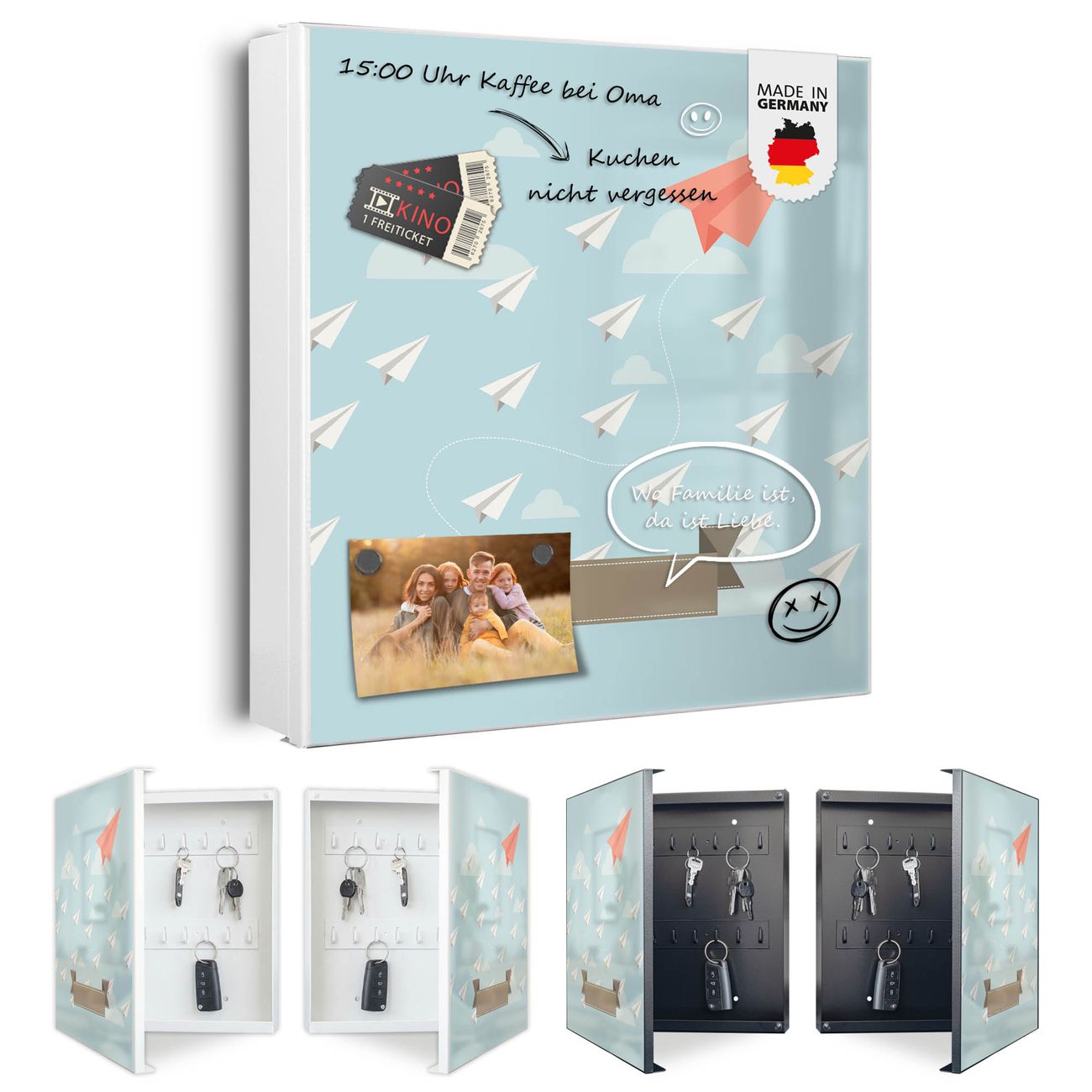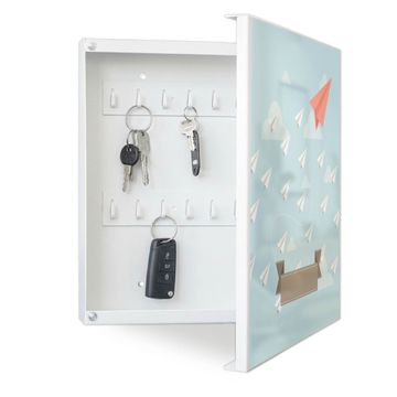 Bringe Ordnung und Eleganz in deinen Eingangsbereich mit dem banjado Schlüsselkasten Motiv Motiv WT Wolken. Die moderne Schlüsselbox kombiniert funktionales Design mit hochwertiger Verarbeitung und wird so zu einem echten Hingucker in Flur, Büro oder Ferienwohnung. ✅ Stilvolle Schlüsselaufbewahrung mit Motiv Motiv WT Wolken Der Design-Schlüsselkasten Motiv Motiv WT Wolken bietet Platz für bis zu 32 Schlüssel, die auf 4 stabilen Reihen mit je 8 Haken übersichtlich verstaut werden. Mit seinen kompakten Maßen von 30 x 30 x 5 cm passt die Schlüsselbox perfekt auch in kleinere Räume. Der weiß lackierte Stahlkorpus mit rechts angeschlagenem Türscharnier harmoniert mit gedruckten Folie auf der Front und fügt sich nahtlos in jedes Wohnambiente ein. Ob als Schlüsselorganizer für Zuhause oder als praktische Lösung für Büros, Praxen und Gewerbe, der banjado Schlüsselkasten sorgt für Ordnung und Übersicht. Dank der magnetischen, mit Kreidestiften beschreibbaren Folie auf der Front kannst du Notizen anheften oder Termine direkt auf der Oberfläche festhalten. Die Schlüsselbox Motiv Motiv WT Wolken zur Wandmontage wird inklusive Befestigungsmaterial geliefert und ist schnell angebracht. So hast du deine Schlüssel jederzeit griffbereit und zugleich stilvoll verstaut. Mit diesem banjado Schlüsselkasten Motiv Motiv WT Wolken kombinierst du praktische Aufbewahrung mit stilvollem Wohndesign. Ob privat oder geschäftlich, die Schlüsselbox sorgt für mehr Ordnung, Übersicht und ein wohnliches Ambiente.Vorteile im Überblick
