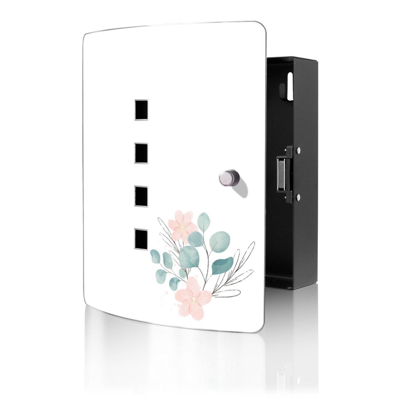 Funktion / Nutzen: Die leicht geschwungene Edelstahltür ist mit einer hochwertigen Motivfolie und dem Motiv Motiv Zarte Blumenkomposition kaschiert. Ein praktischer Magnetverschluss ermöglicht Ihnen ein schnelles Öffnen und Schließen. Befestigt wird der Schlüsselkasten an 2 Stellen auf der Rückseite, passendes Montagematerial fügen wir bereits bei.