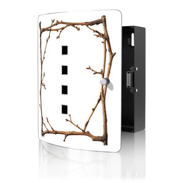 Funktion / Nutzen: Die leicht geschwungene Edelstahltür ist mit einer hochwertigen Motivfolie und dem Motiv Motiv Zweigrahmen kaschiert. Ein praktischer Magnetverschluss ermöglicht Ihnen ein schnelles Öffnen und Schließen. Befestigt wird der Schlüsselkasten an 2 Stellen auf der Rückseite, passendes Montagematerial fügen wir bereits bei.