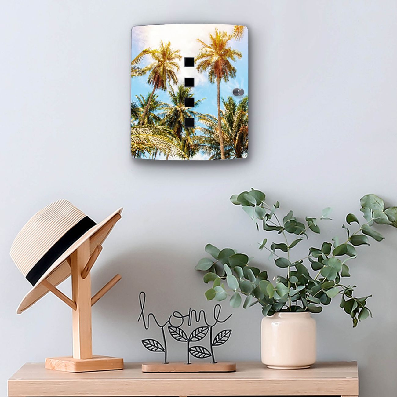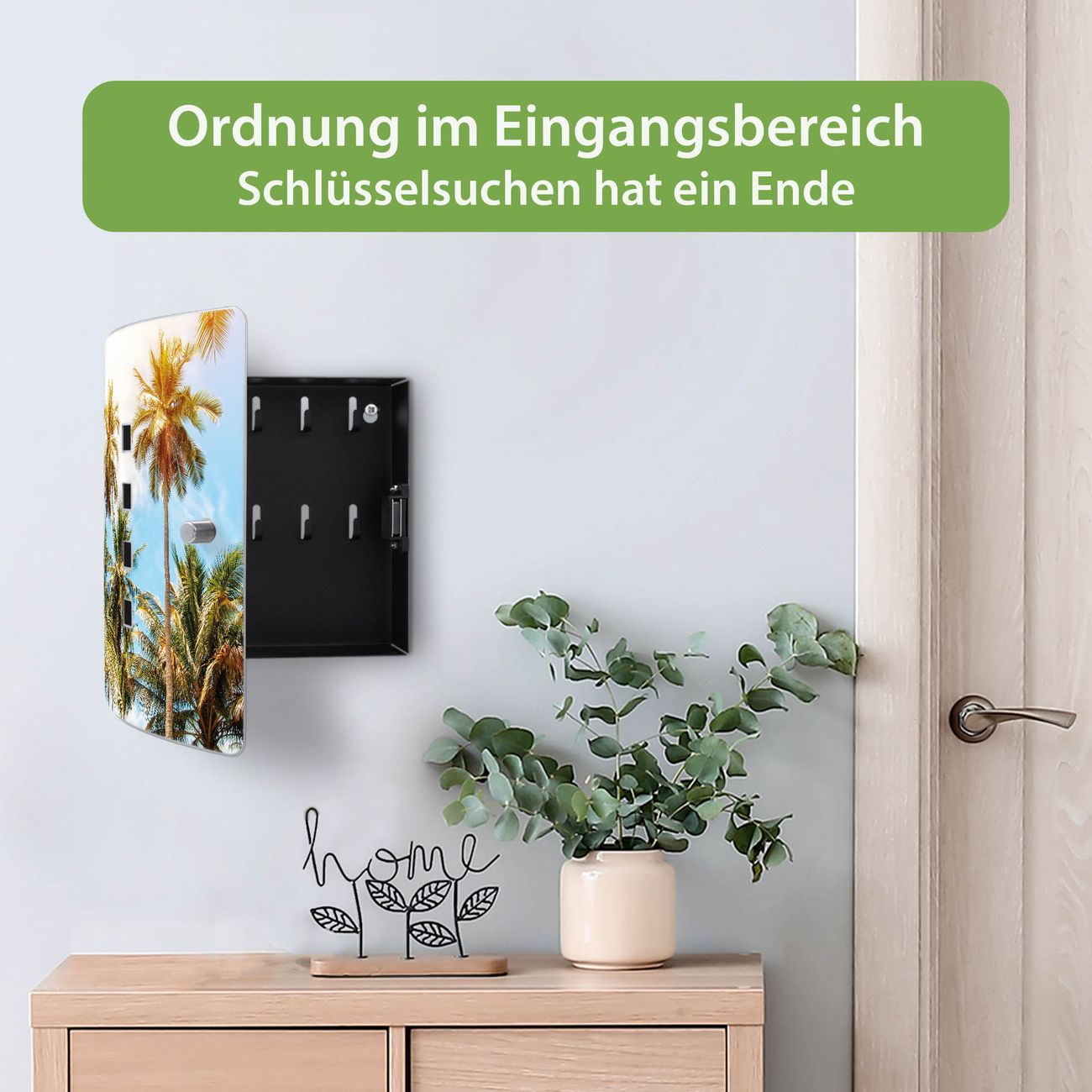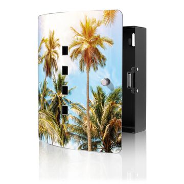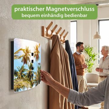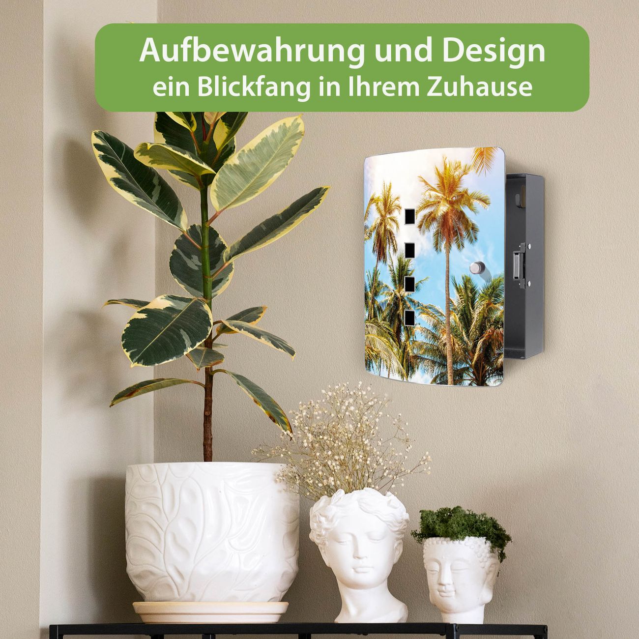 Funktion / Nutzen: Die leicht geschwungene Edelstahltür ist mit einer hochwertigen Motivfolie und dem Motiv Motiv Zwischen Palmen kaschiert. Ein praktischer Magnetverschluss ermöglicht Ihnen ein schnelles Öffnen und Schließen. Befestigt wird der Schlüsselkasten an 2 Stellen auf der Rückseite, passendes Montagematerial fügen wir bereits bei.
