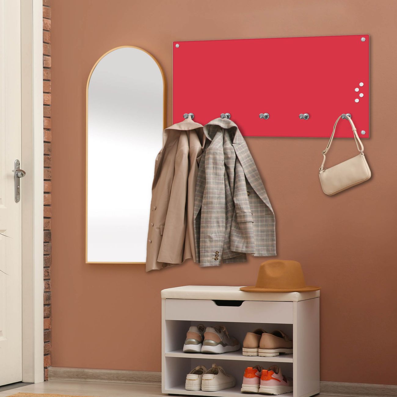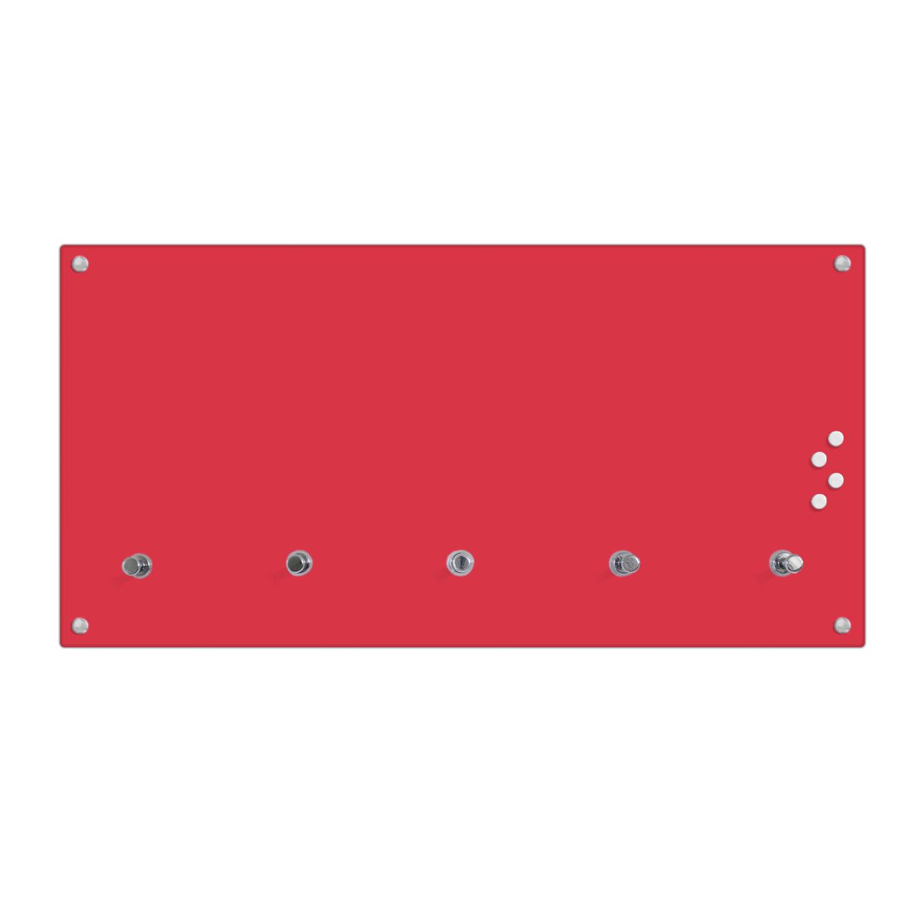 Bitte beachten Sie, dass an dieser Garderobe nur starke Neodym-Magnete halten! FUNKTION: Die banjado Wandgarderobe mit Farbe Feuerrot ist Ihr täglicher Begleiter. Zuverlässig hängen hier Ihre Jacken und Mäntel griffbereit. Gleichzeitig ist die Design Garderobe magnetisch, Sie können Notizen anheften und durch das Echtglas ist Ihr Paneel auch beschreibbar und wieder abwischbar. DESIGN: Sie erhalten eine Garderobenleiste aus elegantem Echtglas mit dem Farbbrillanten Farbe Feuerrot hinterklebt. Das Design ist zeitlos klassisch, ohne dabei auf Funktionalität zu verzichten. Suchen Sie aus einer Vielzahl von Farbeen das für Ihre Einrichtung Passende aus. DETAILS: Die Flurgarderobe besteht aus 4mm gehärtetem Sicherheitsglas. Sie ist 80cm breit, 40cm hoch und 6cm tief. Die Garderobenhaken zur Selbstmontage präsentieren sich in Edelstahl-Optik, ebenso die Abstandshalter für die Wandmontage. Ihre neue Garderobe ist sofort einsatzbereit. NUTZEN: Ihre neue Garderobe hält nicht nur zuverlässig Ihre Kleidung, sie ist auch optisch ein Blickfang. Durch die magnetische Wirkung können Sie mit 4 beigefügten extrastarken Neodym-Magneten Notizen anheften und mit wasserlöslichen Kreidestiften oder Whiteboard-Markern auch Nachrichten hinterlassen. BANJADO: Wir sind ein kleines kreatives Team aus Sachsen und entwickeln Produkte die Design und Funktionalität verbinden sollen. Viel Freude mit Ihrer neuen Garderobe wünscht das banjado-Team!