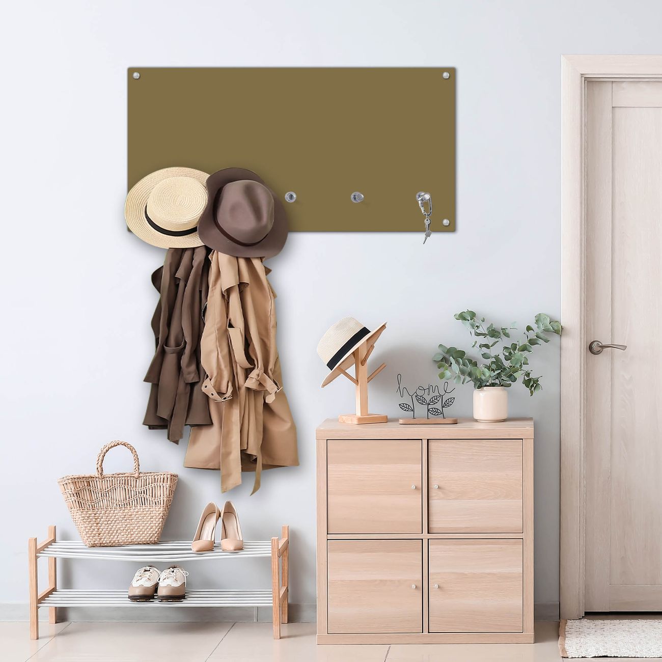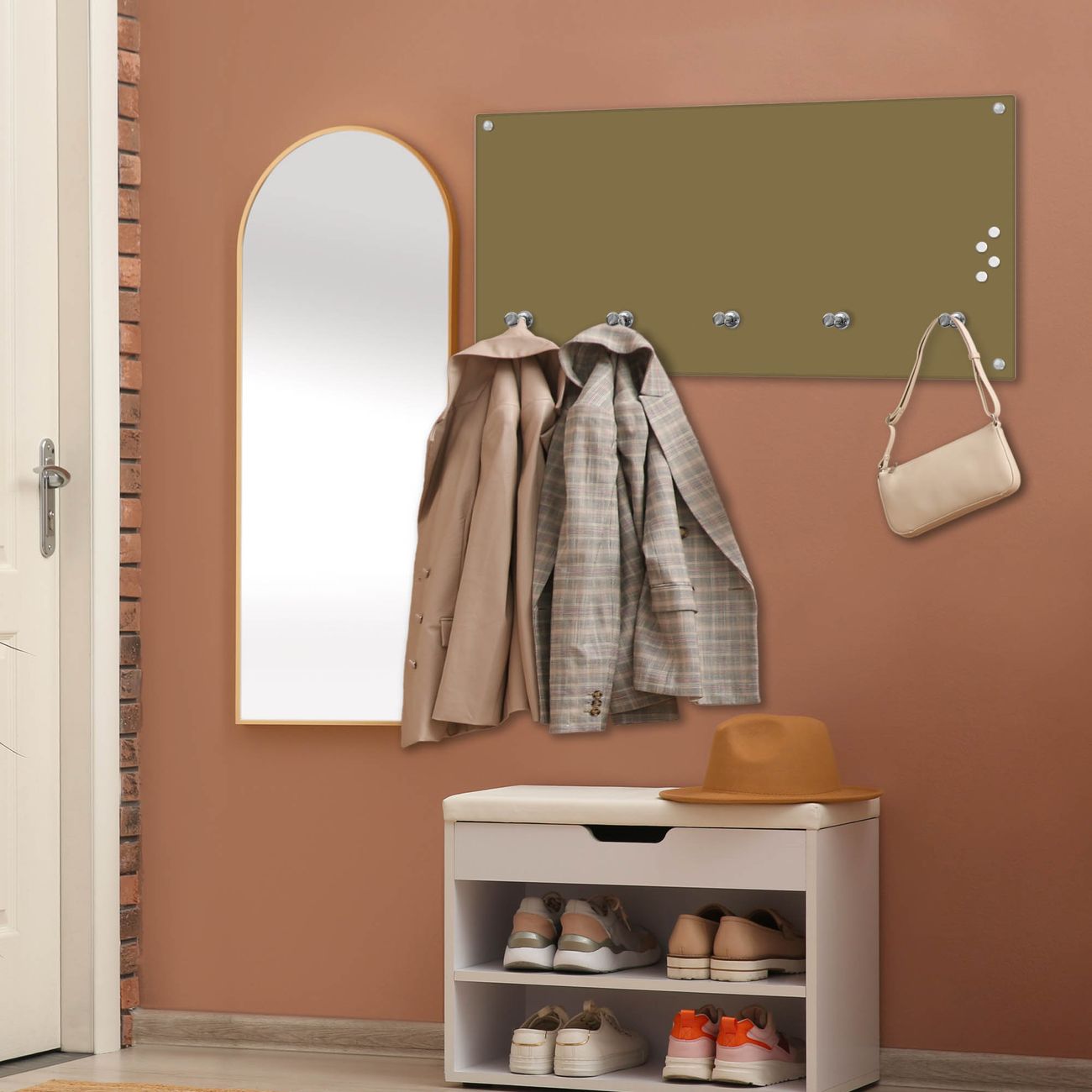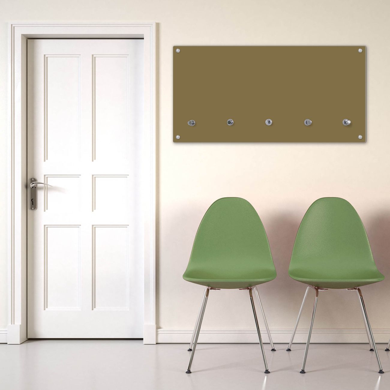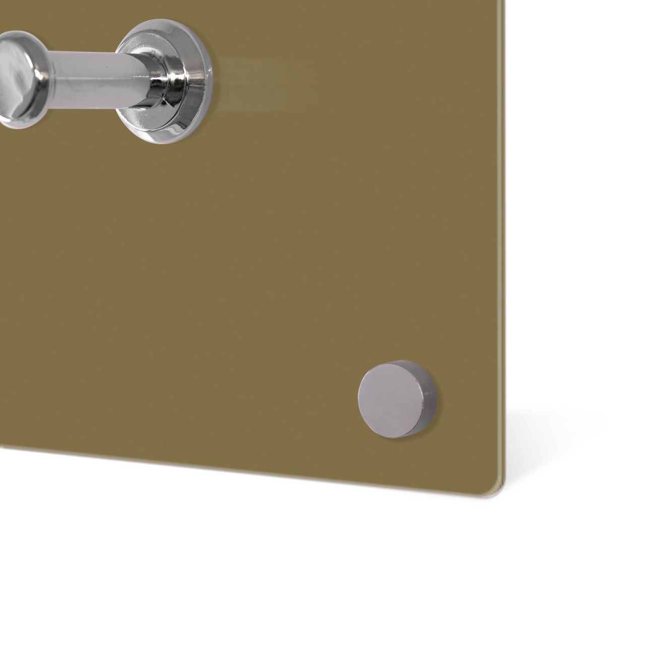 Bitte beachten Sie, dass an dieser Garderobe nur starke Neodym-Magnete halten! FUNKTION: Die banjado Wandgarderobe mit Farbe Gold Metallic ist Ihr täglicher Begleiter. Zuverlässig hängen hier Ihre Jacken und Mäntel griffbereit. Gleichzeitig ist die Design Garderobe magnetisch, Sie können Notizen anheften und durch das Echtglas ist Ihr Paneel auch beschreibbar und wieder abwischbar. DESIGN: Sie erhalten eine Garderobenleiste aus elegantem Echtglas mit dem Farbbrillanten Farbe Gold Metallic hinterklebt. Das Design ist zeitlos klassisch, ohne dabei auf Funktionalität zu verzichten. Suchen Sie aus einer Vielzahl von Farbeen das für Ihre Einrichtung Passende aus. DETAILS: Die Flurgarderobe besteht aus 4mm gehärtetem Sicherheitsglas. Sie ist 80cm breit, 40cm hoch und 6cm tief. Die Garderobenhaken zur Selbstmontage präsentieren sich in Edelstahl-Optik, ebenso die Abstandshalter für die Wandmontage. Ihre neue Garderobe ist sofort einsatzbereit. NUTZEN: Ihre neue Garderobe hält nicht nur zuverlässig Ihre Kleidung, sie ist auch optisch ein Blickfang. Durch die magnetische Wirkung können Sie mit 4 beigefügten extrastarken Neodym-Magneten Notizen anheften und mit wasserlöslichen Kreidestiften oder Whiteboard-Markern auch Nachrichten hinterlassen. BANJADO: Wir sind ein kleines kreatives Team aus Sachsen und entwickeln Produkte die Design und Funktionalität verbinden sollen. Viel Freude mit Ihrer neuen Garderobe wünscht das banjado-Team!