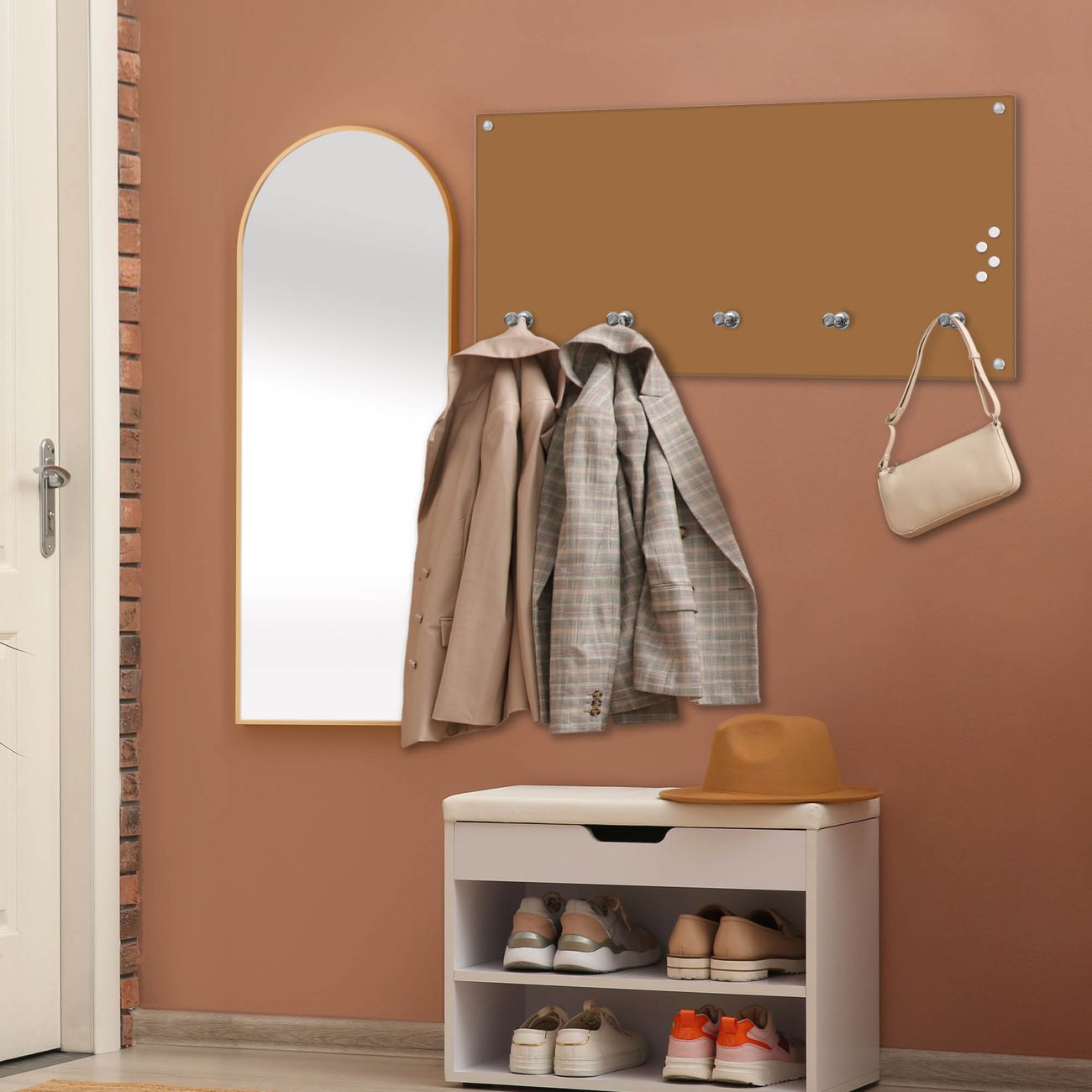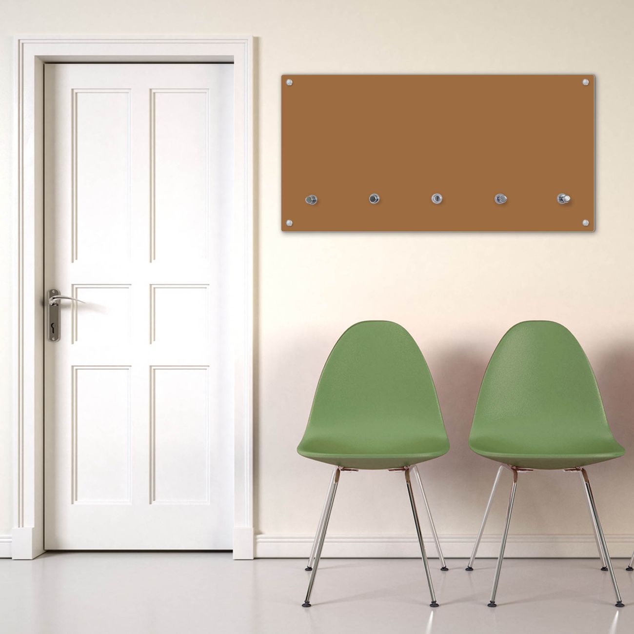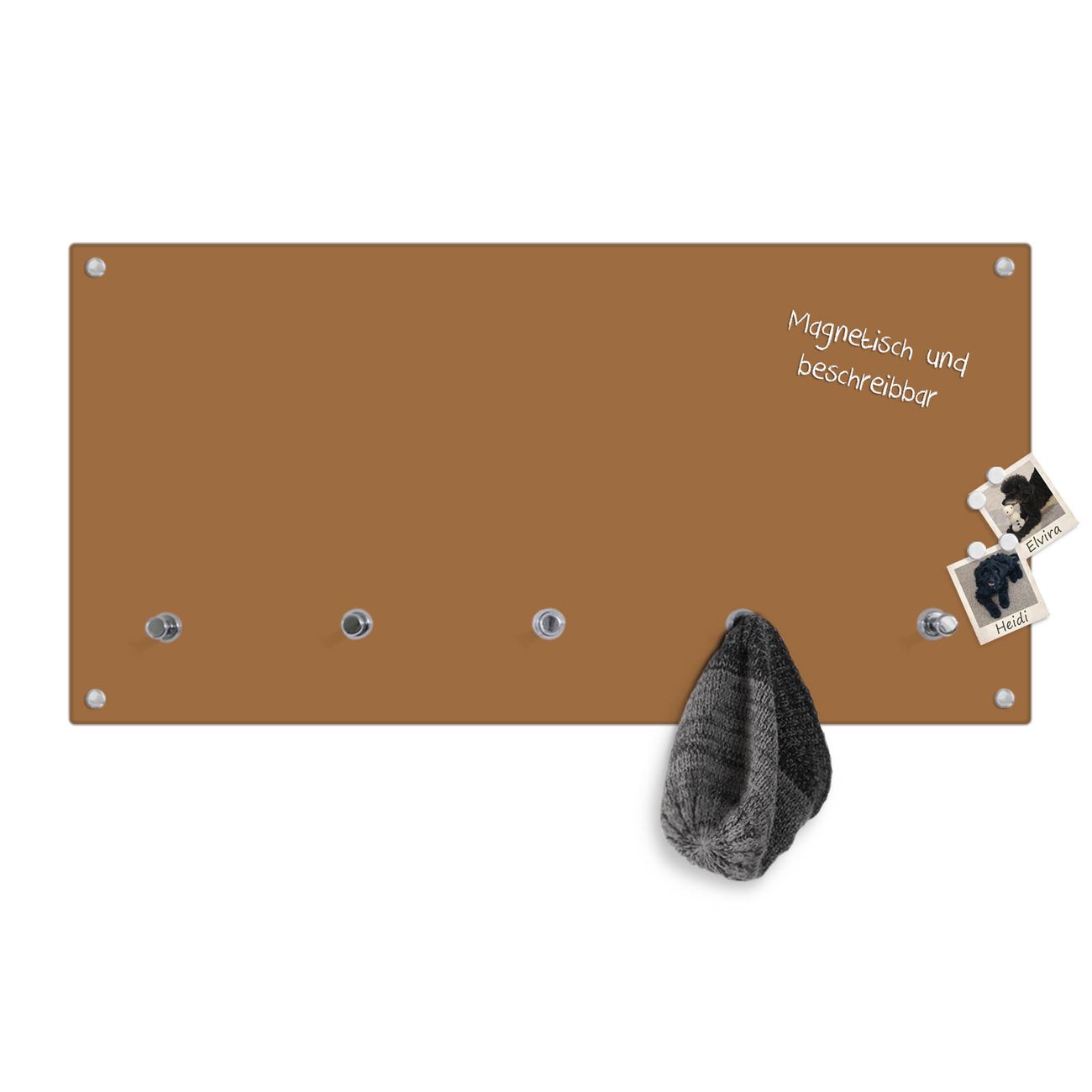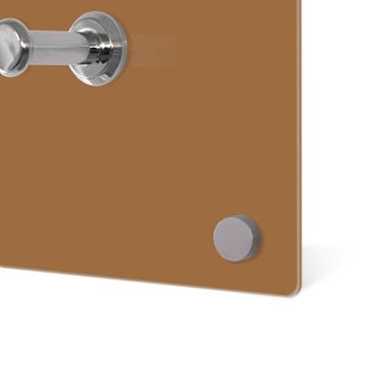 Bitte beachten Sie, dass an dieser Garderobe nur starke Neodym-Magnete halten! FUNKTION: Die banjado Wandgarderobe mit Farbe Kupfer Metallic ist Ihr täglicher Begleiter. Zuverlässig hängen hier Ihre Jacken und Mäntel griffbereit. Gleichzeitig ist die Design Garderobe magnetisch, Sie können Notizen anheften und durch das Echtglas ist Ihr Paneel auch beschreibbar und wieder abwischbar. DESIGN: Sie erhalten eine Garderobenleiste aus elegantem Echtglas mit dem Farbbrillanten Farbe Kupfer Metallic hinterklebt. Das Design ist zeitlos klassisch, ohne dabei auf Funktionalität zu verzichten. Suchen Sie aus einer Vielzahl von Farbeen das für Ihre Einrichtung Passende aus. DETAILS: Die Flurgarderobe besteht aus 4mm gehärtetem Sicherheitsglas. Sie ist 80cm breit, 40cm hoch und 6cm tief. Die Garderobenhaken zur Selbstmontage präsentieren sich in Edelstahl-Optik, ebenso die Abstandshalter für die Wandmontage. Ihre neue Garderobe ist sofort einsatzbereit. NUTZEN: Ihre neue Garderobe hält nicht nur zuverlässig Ihre Kleidung, sie ist auch optisch ein Blickfang. Durch die magnetische Wirkung können Sie mit 4 beigefügten extrastarken Neodym-Magneten Notizen anheften und mit wasserlöslichen Kreidestiften oder Whiteboard-Markern auch Nachrichten hinterlassen. BANJADO: Wir sind ein kleines kreatives Team aus Sachsen und entwickeln Produkte die Design und Funktionalität verbinden sollen. Viel Freude mit Ihrer neuen Garderobe wünscht das banjado-Team!