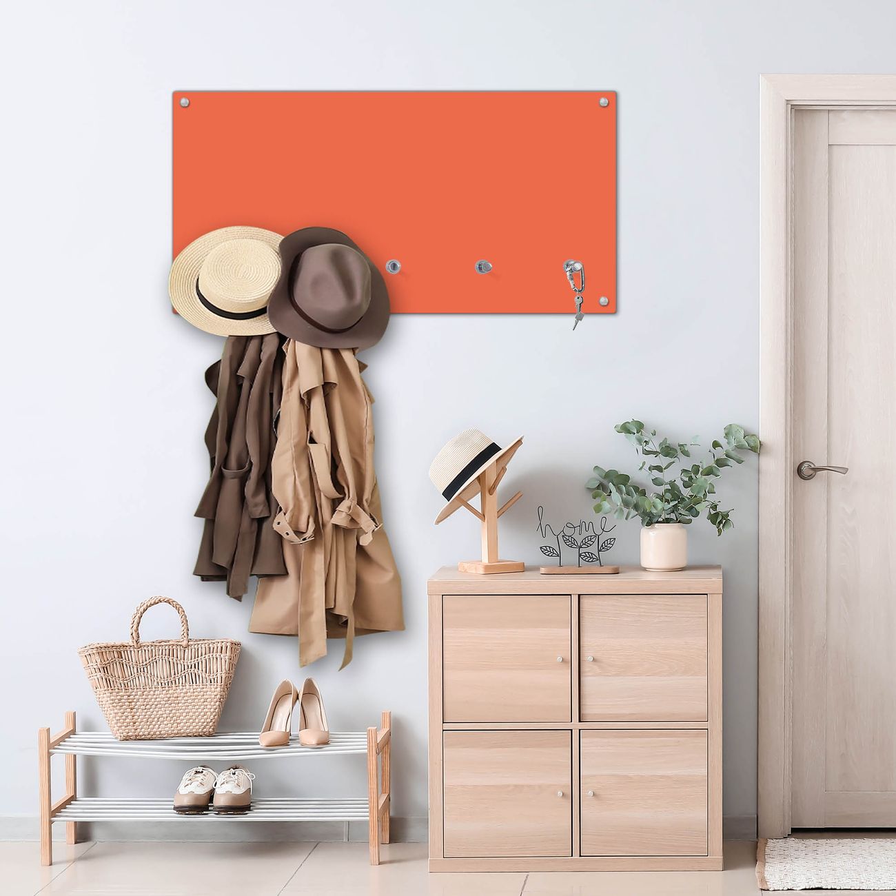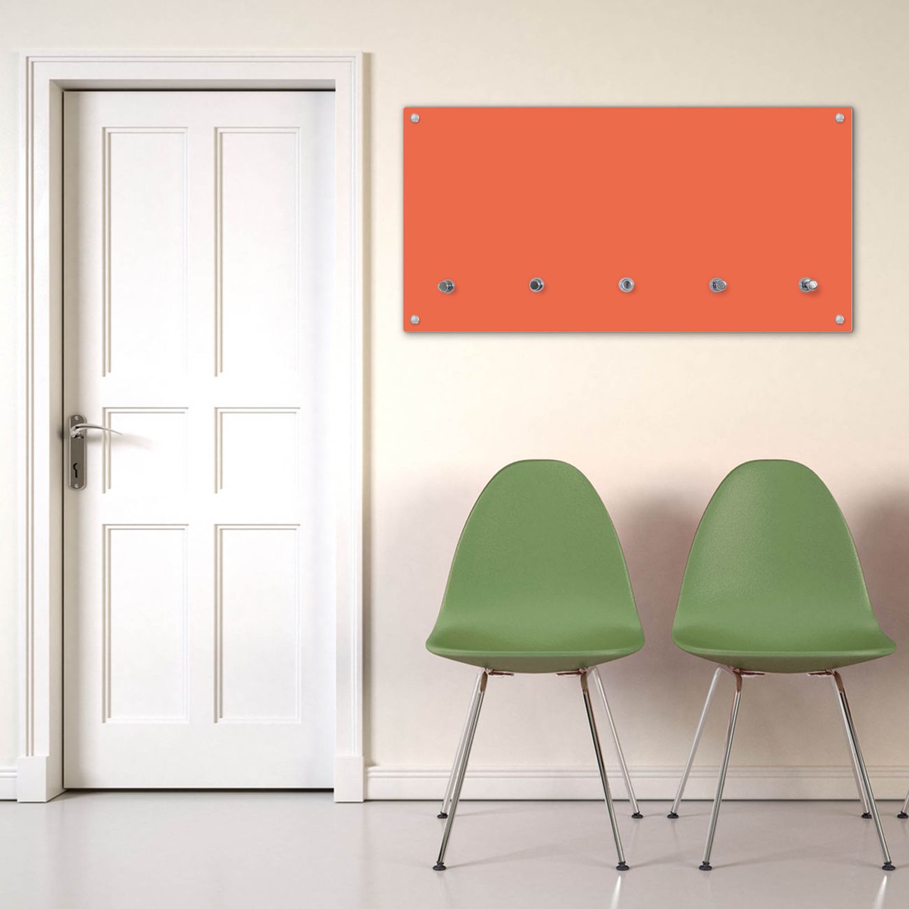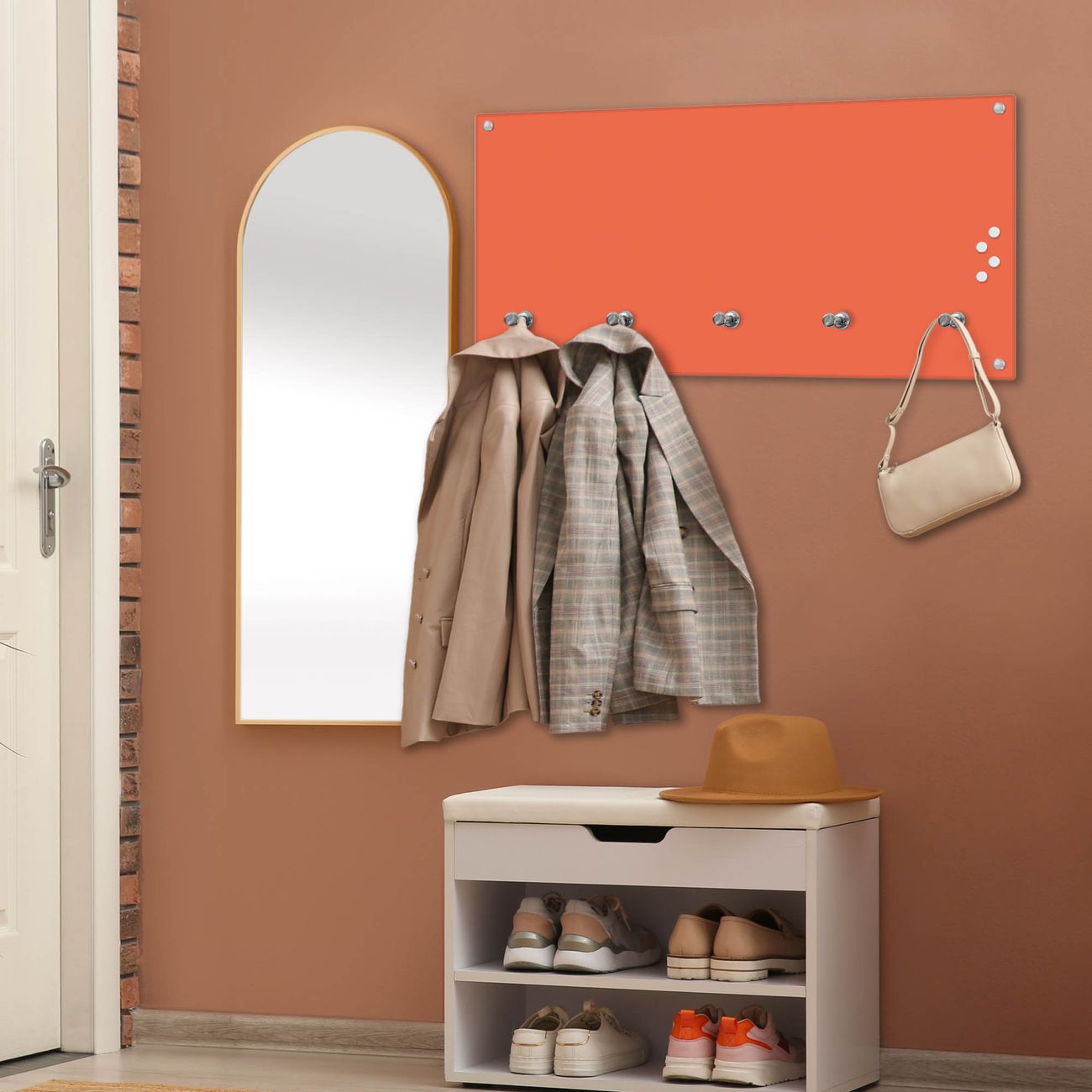 Bitte beachten Sie, dass an dieser Garderobe nur starke Neodym-Magnete halten! FUNKTION: Die banjado Wandgarderobe mit Farbe Orange ist Ihr täglicher Begleiter. Zuverlässig hängen hier Ihre Jacken und Mäntel griffbereit. Gleichzeitig ist die Design Garderobe magnetisch, Sie können Notizen anheften und durch das Echtglas ist Ihr Paneel auch beschreibbar und wieder abwischbar. DESIGN: Sie erhalten eine Garderobenleiste aus elegantem Echtglas mit dem Farbbrillanten Farbe Orange hinterklebt. Das Design ist zeitlos klassisch, ohne dabei auf Funktionalität zu verzichten. Suchen Sie aus einer Vielzahl von Farbeen das für Ihre Einrichtung Passende aus. DETAILS: Die Flurgarderobe besteht aus 4mm gehärtetem Sicherheitsglas. Sie ist 80cm breit, 40cm hoch und 6cm tief. Die Garderobenhaken zur Selbstmontage präsentieren sich in Edelstahl-Optik, ebenso die Abstandshalter für die Wandmontage. Ihre neue Garderobe ist sofort einsatzbereit. NUTZEN: Ihre neue Garderobe hält nicht nur zuverlässig Ihre Kleidung, sie ist auch optisch ein Blickfang. Durch die magnetische Wirkung können Sie mit 4 beigefügten extrastarken Neodym-Magneten Notizen anheften und mit wasserlöslichen Kreidestiften oder Whiteboard-Markern auch Nachrichten hinterlassen. BANJADO: Wir sind ein kleines kreatives Team aus Sachsen und entwickeln Produkte die Design und Funktionalität verbinden sollen. Viel Freude mit Ihrer neuen Garderobe wünscht das banjado-Team!