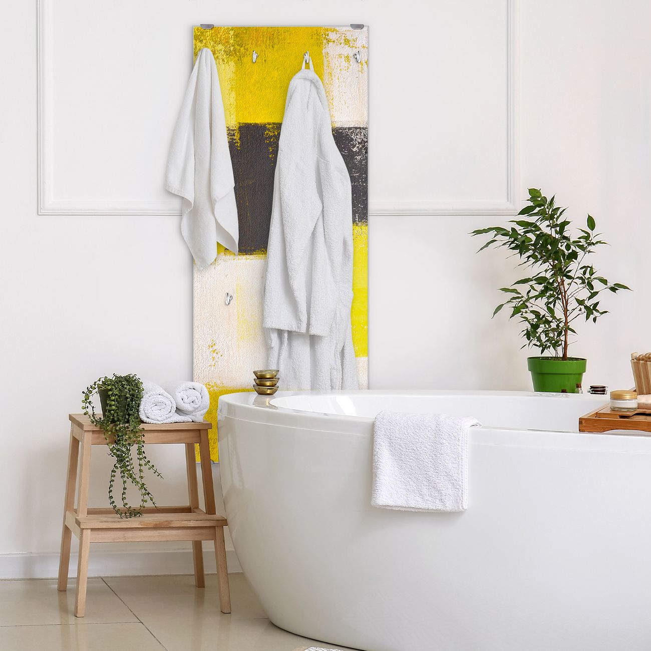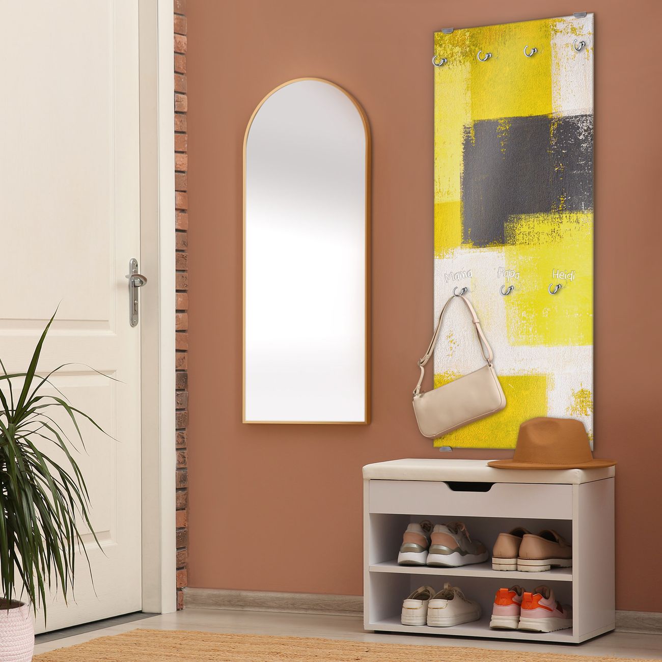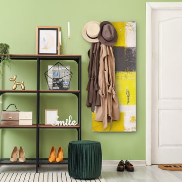 FUNKTION: Die banjado Wandgarderobe mit Motiv Abstrakt Gelb ist Ihr täglicher Begleiter. Zuverlässig hängen hier Ihre Jacken und Mäntel griffbereit. Das Echtglas ist Ihr Paneel auch beschreibbar und wieder abwischbar. DESIGN: Sie erhalten eine Garderobenleiste aus elegantem Echtglas mit dem Farbbrillanten Motiv Abstrakt Gelb hinterklebt. Das Design ist zeitlos klassisch, ohne dabei auf Funktionalität zu verzichten. Suchen Sie aus einer Vielzahl von Motiven das für Ihre Einrichtung Passende aus. DETAILS: Die Flurgarderobe besteht aus 4mm gehärtetem Sicherheitsglas. Sie ist 50cm breit, 125cm hoch und 6cm tief. Die Garderobenhaken zur Selbstmontage präsentieren sich in Edelstahl-Optik, ebenso die Abstandshalter für die Wandmontage. Ihre neue Garderobe ist sofort einsatzbereit. NUTZEN: Ihre neue Garderobe hält nicht nur zuverlässig Ihre Kleidung, sie ist auch optisch ein Blickfang. Durch das Glas können Sie an der Garderobe mit wasserlöslichen Kreidestiften oder Whiteboard-Markern auch Nachrichten hinterlassen. BANJADO: Wir sind ein kleines kreatives Team aus Sachsen und entwickeln Produkte die Design und Funktionalität verbinden sollen. Viel Freude mit Ihrer neuen Garderobe wünscht das banjado-Team!