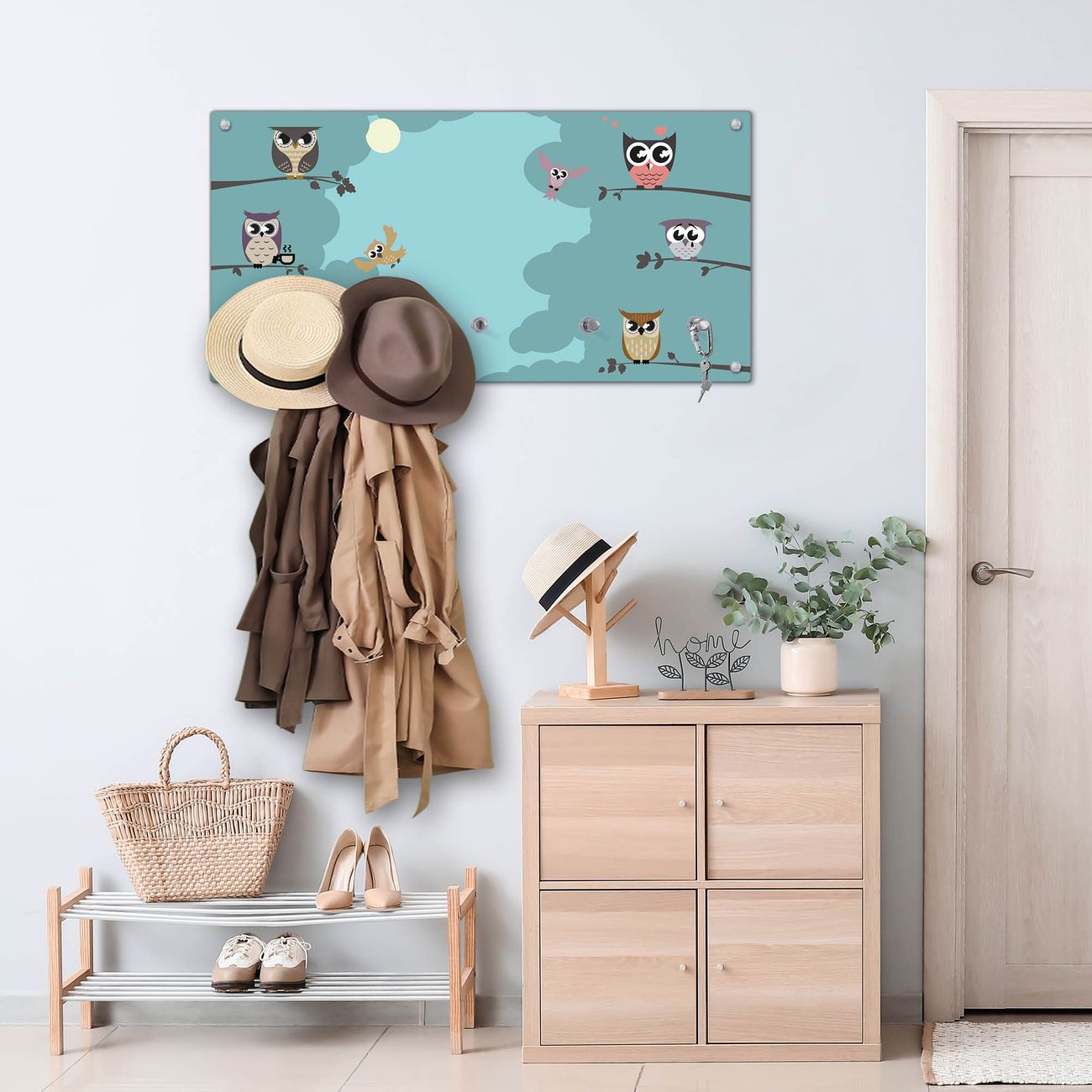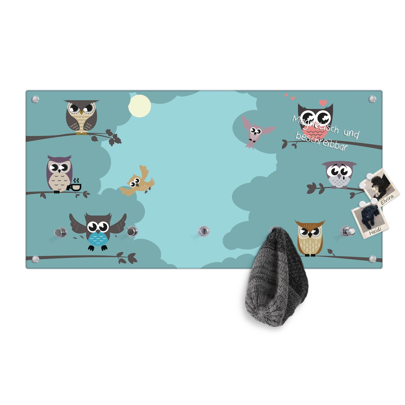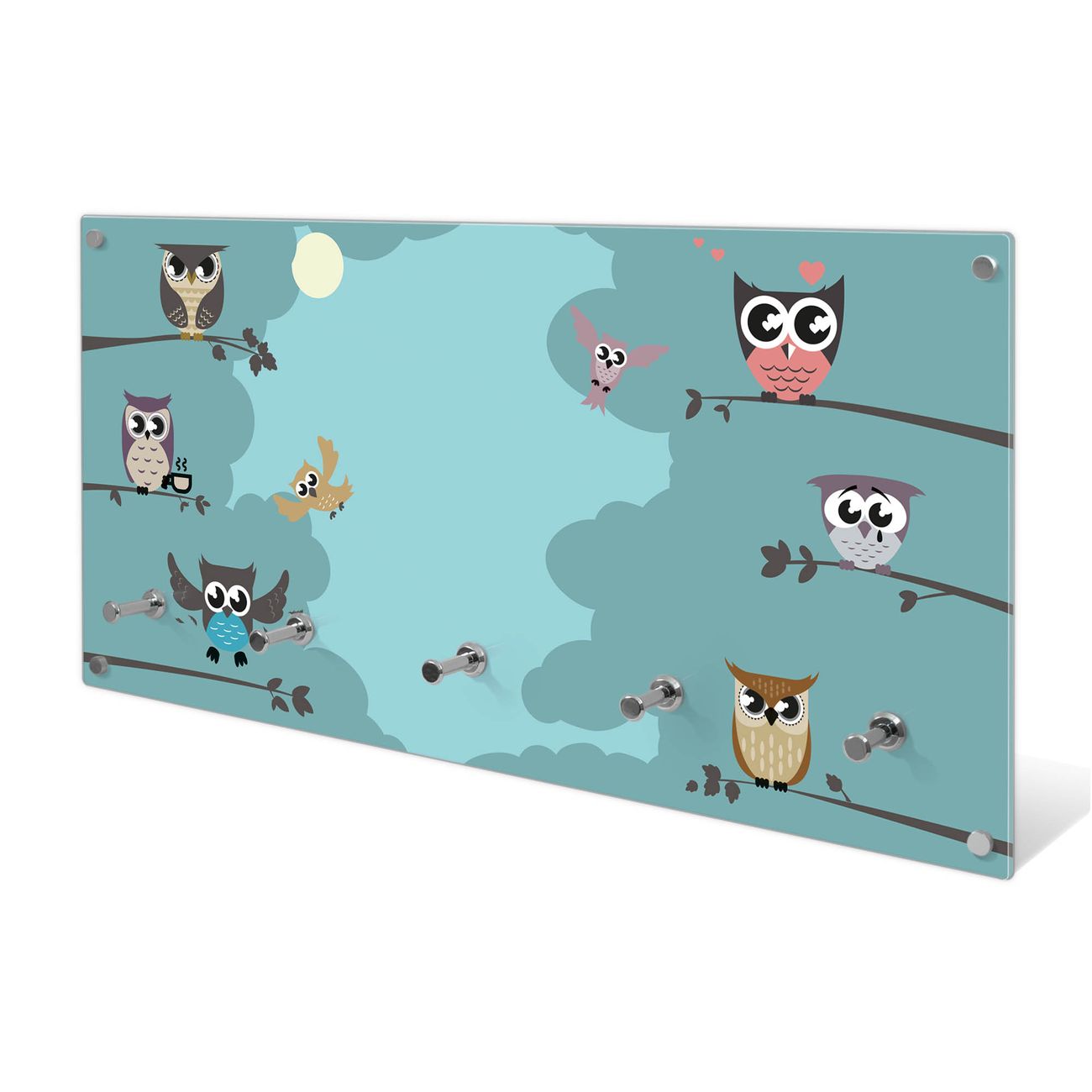 Wandgarderobe Glas 80x40cm Motiv Acht Eulen