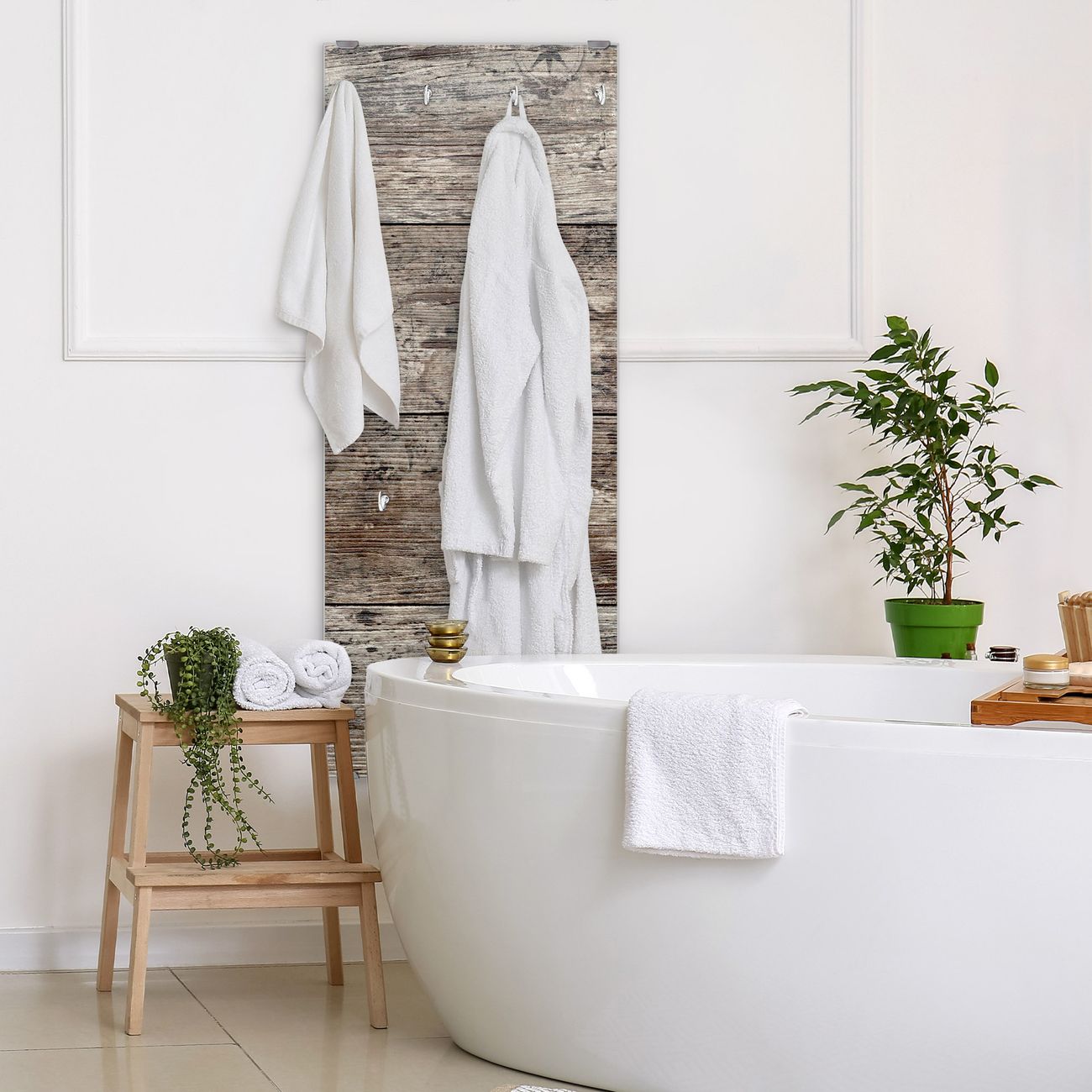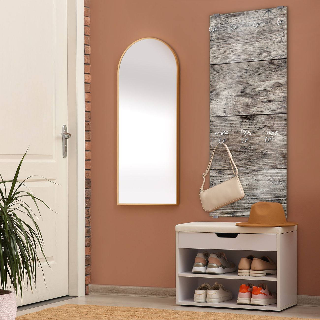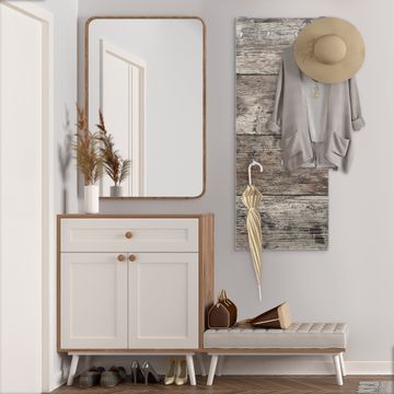 FUNKTION: Die banjado Wandgarderobe mit Motiv Alte Planken ist Ihr täglicher Begleiter. Zuverlässig hängen hier Ihre Jacken und Mäntel griffbereit. Das Echtglas ist Ihr Paneel auch beschreibbar und wieder abwischbar. DESIGN: Sie erhalten eine Garderobenleiste aus elegantem Echtglas mit dem Farbbrillanten Motiv Alte Planken hinterklebt. Das Design ist zeitlos klassisch, ohne dabei auf Funktionalität zu verzichten. Suchen Sie aus einer Vielzahl von Motiven das für Ihre Einrichtung Passende aus. DETAILS: Die Flurgarderobe besteht aus 4mm gehärtetem Sicherheitsglas. Sie ist 50cm breit, 125cm hoch und 6cm tief. Die Garderobenhaken zur Selbstmontage präsentieren sich in Edelstahl-Optik, ebenso die Abstandshalter für die Wandmontage. Ihre neue Garderobe ist sofort einsatzbereit. NUTZEN: Ihre neue Garderobe hält nicht nur zuverlässig Ihre Kleidung, sie ist auch optisch ein Blickfang. Durch das Glas können Sie an der Garderobe mit wasserlöslichen Kreidestiften oder Whiteboard-Markern auch Nachrichten hinterlassen. BANJADO: Wir sind ein kleines kreatives Team aus Sachsen und entwickeln Produkte die Design und Funktionalität verbinden sollen. Viel Freude mit Ihrer neuen Garderobe wünscht das banjado-Team!