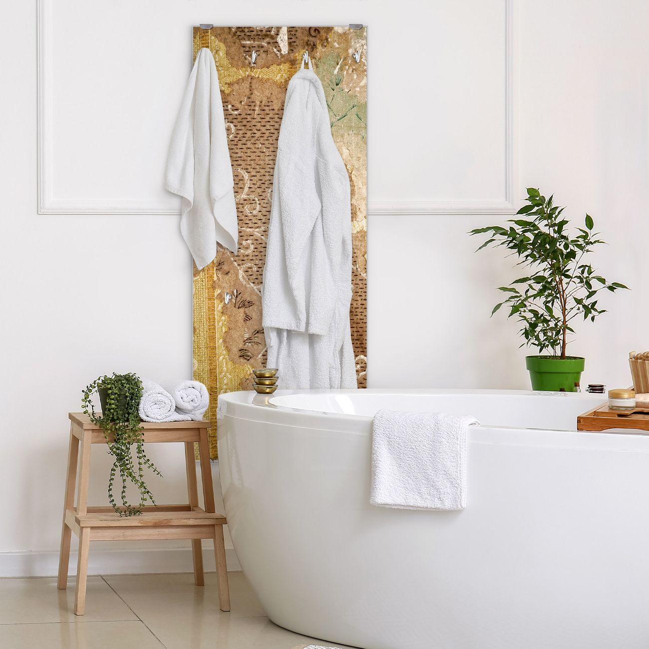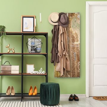 FUNKTION: Die banjado Wandgarderobe mit Motiv Alte Tapeten ist Ihr täglicher Begleiter. Zuverlässig hängen hier Ihre Jacken und Mäntel griffbereit. Das Echtglas ist Ihr Paneel auch beschreibbar und wieder abwischbar. DESIGN: Sie erhalten eine Garderobenleiste aus elegantem Echtglas mit dem Farbbrillanten Motiv Alte Tapeten hinterklebt. Das Design ist zeitlos klassisch, ohne dabei auf Funktionalität zu verzichten. Suchen Sie aus einer Vielzahl von Motiven das für Ihre Einrichtung Passende aus. DETAILS: Die Flurgarderobe besteht aus 4mm gehärtetem Sicherheitsglas. Sie ist 50cm breit, 125cm hoch und 6cm tief. Die Garderobenhaken zur Selbstmontage präsentieren sich in Edelstahl-Optik, ebenso die Abstandshalter für die Wandmontage. Ihre neue Garderobe ist sofort einsatzbereit. NUTZEN: Ihre neue Garderobe hält nicht nur zuverlässig Ihre Kleidung, sie ist auch optisch ein Blickfang. Durch das Glas können Sie an der Garderobe mit wasserlöslichen Kreidestiften oder Whiteboard-Markern auch Nachrichten hinterlassen. BANJADO: Wir sind ein kleines kreatives Team aus Sachsen und entwickeln Produkte die Design und Funktionalität verbinden sollen. Viel Freude mit Ihrer neuen Garderobe wünscht das banjado-Team!
